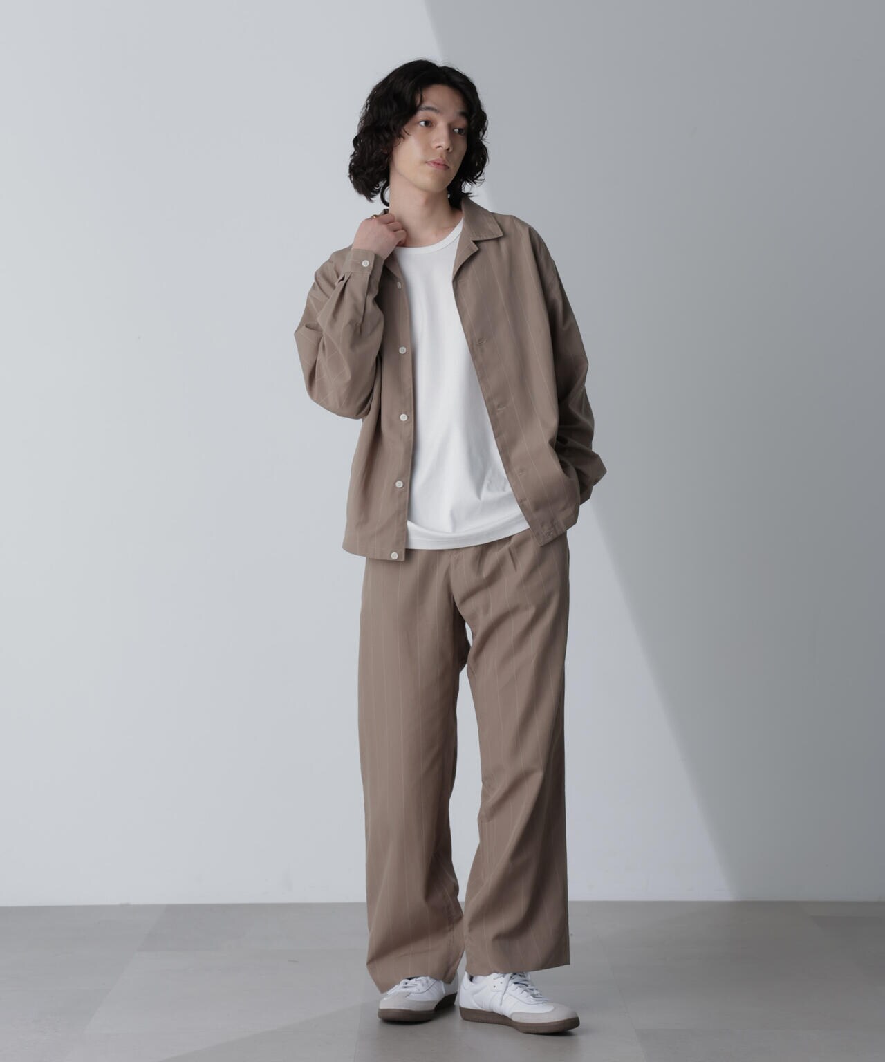同素材のカラーシャツやブルゾンとのセットアップで統一感のある着こなしがおすすめ。