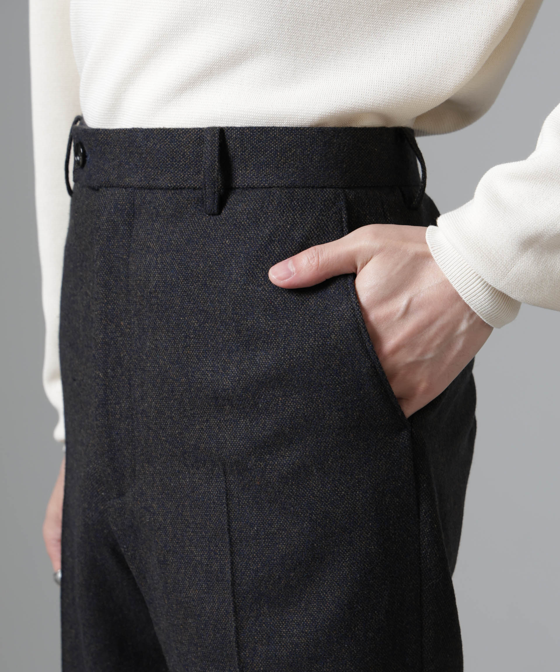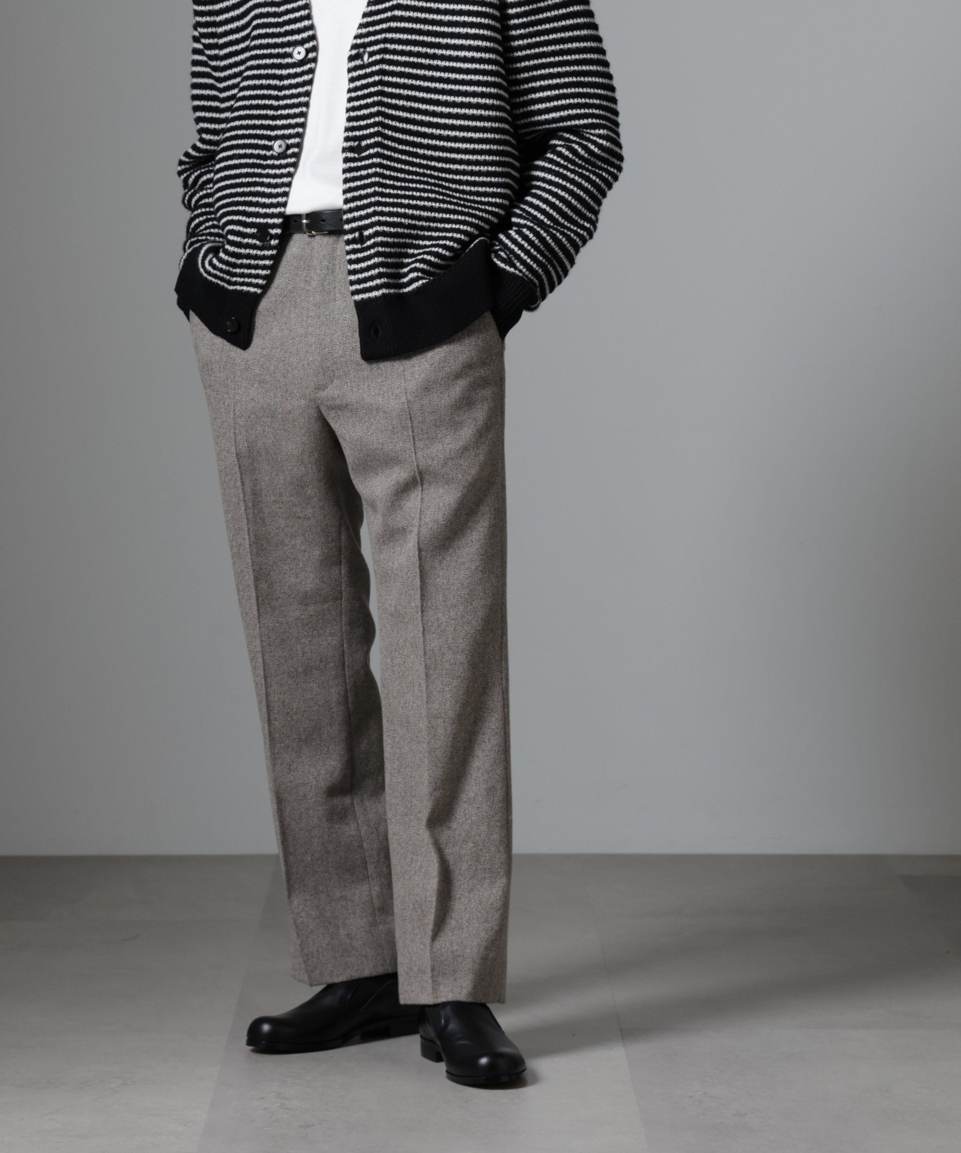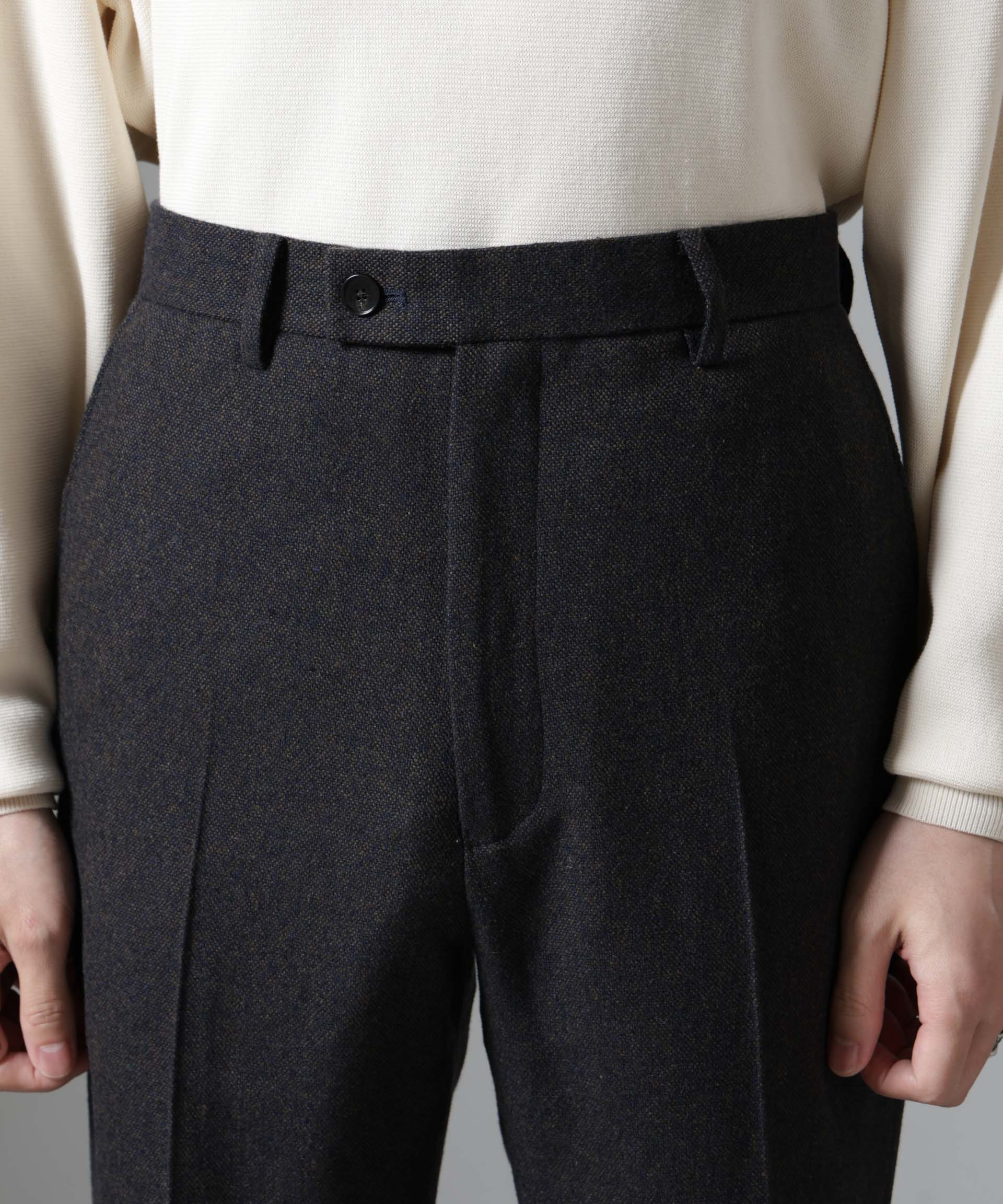 トレンド感のあるツイード素材を使用したノータックトラウザーズ。同素材のハリントンジャケットと合わせるトラッドスタイルがおすすめ。