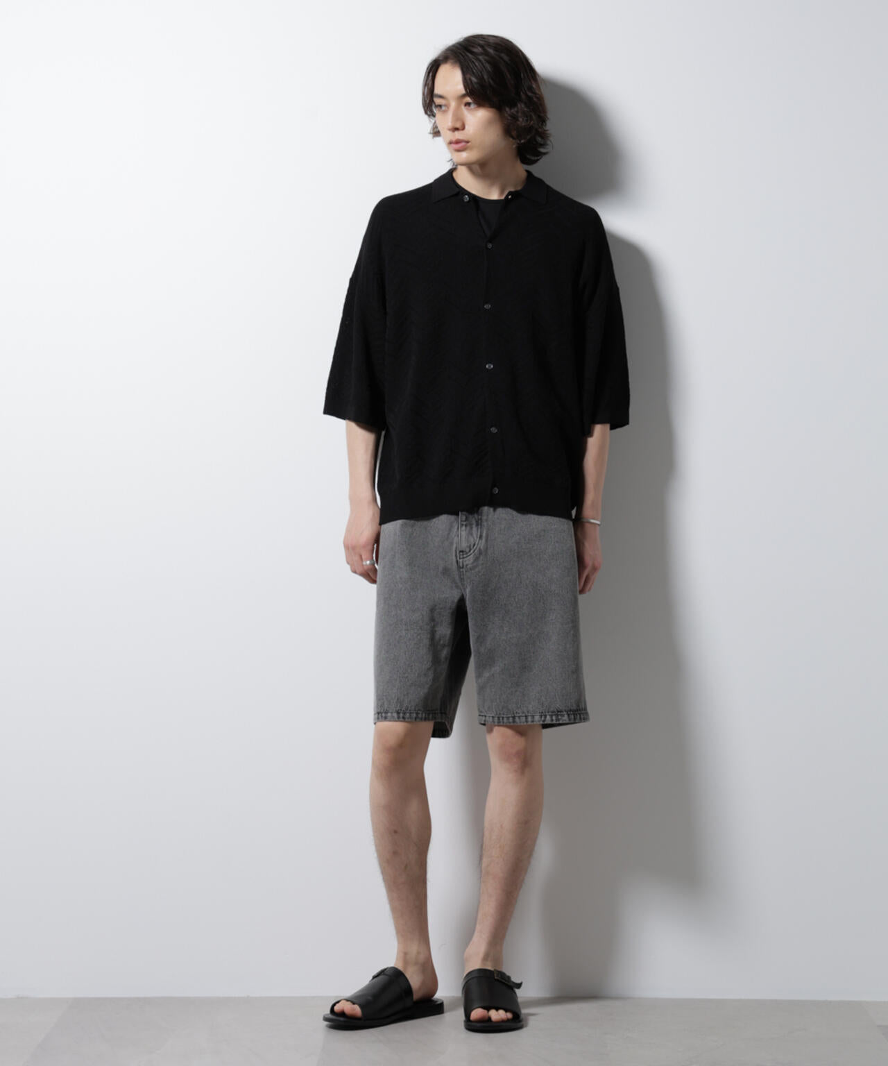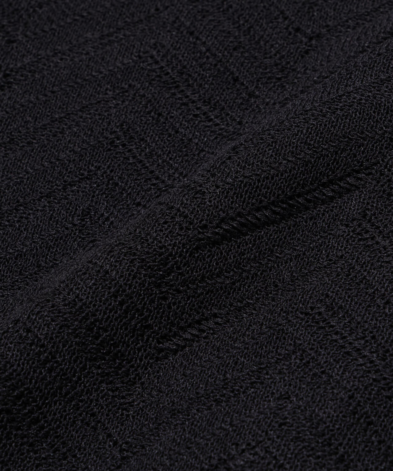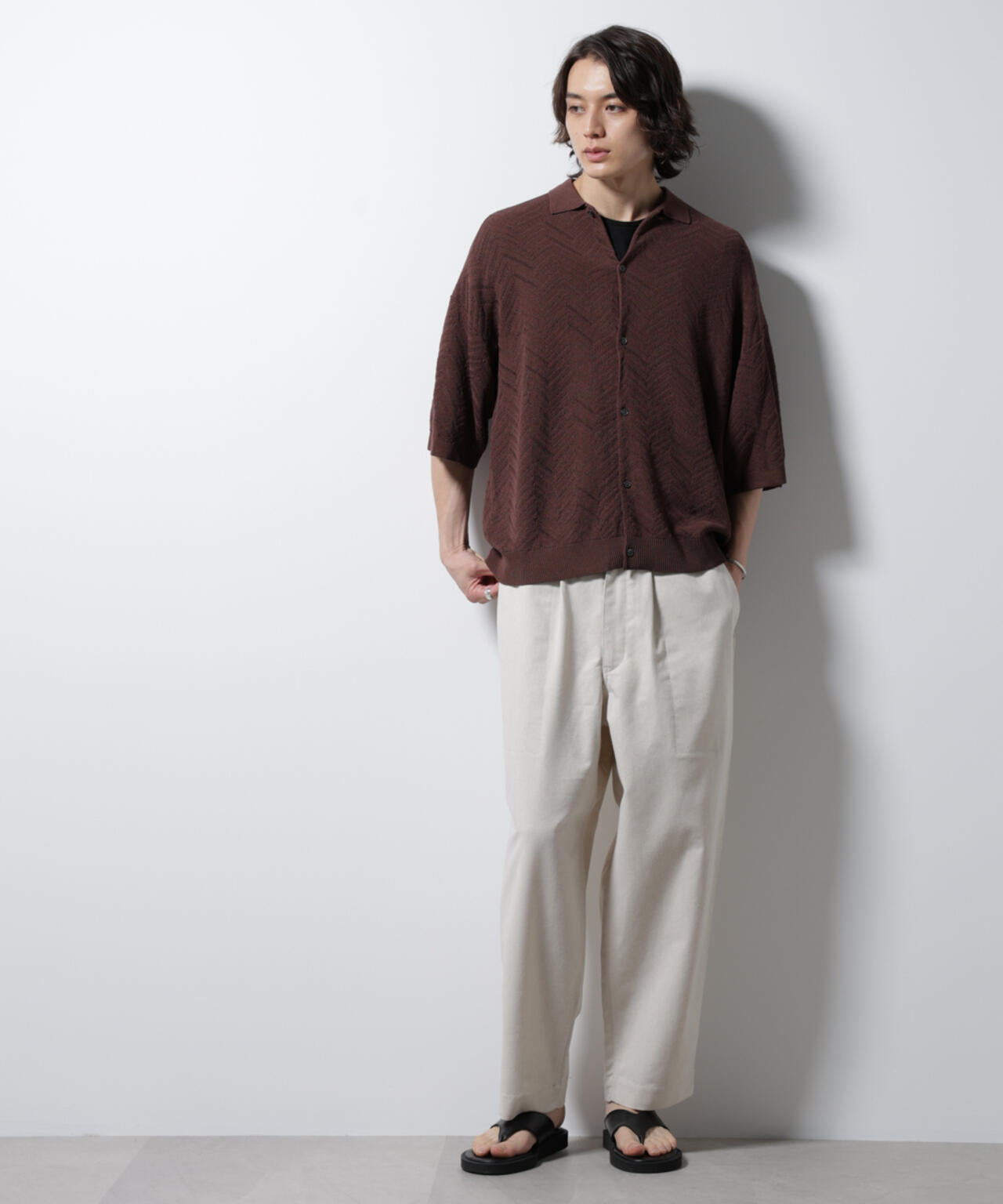 ヘリンボーンのクラシカルな柄と透け感のある編地を使用したニットシャツ。リネン素材のパンツや大人のワイドパンツシリーズに合わせて、リラックス感のあるスタイリングを作るのがおすすめの1着です。