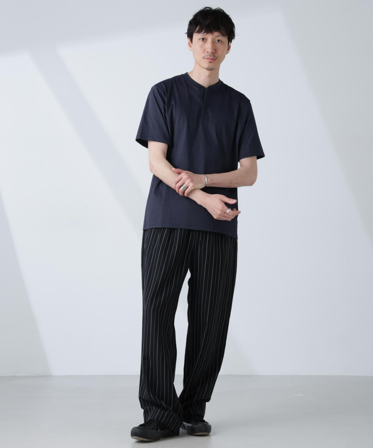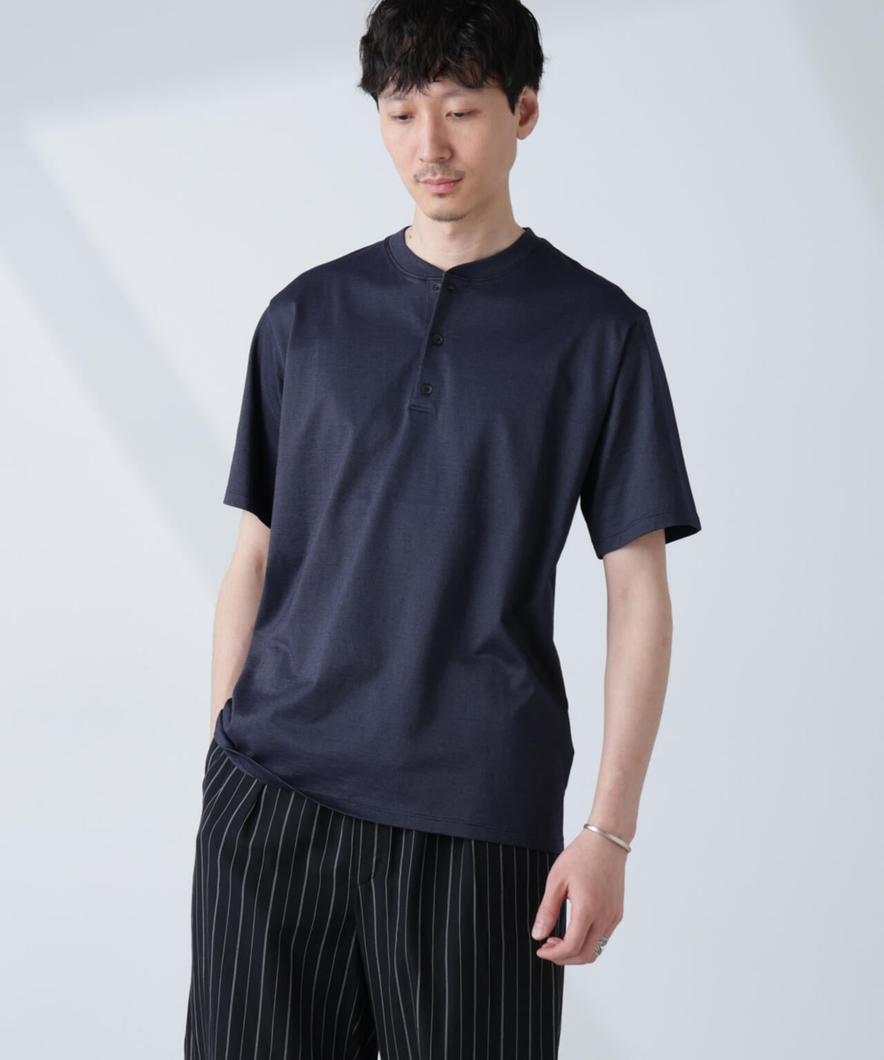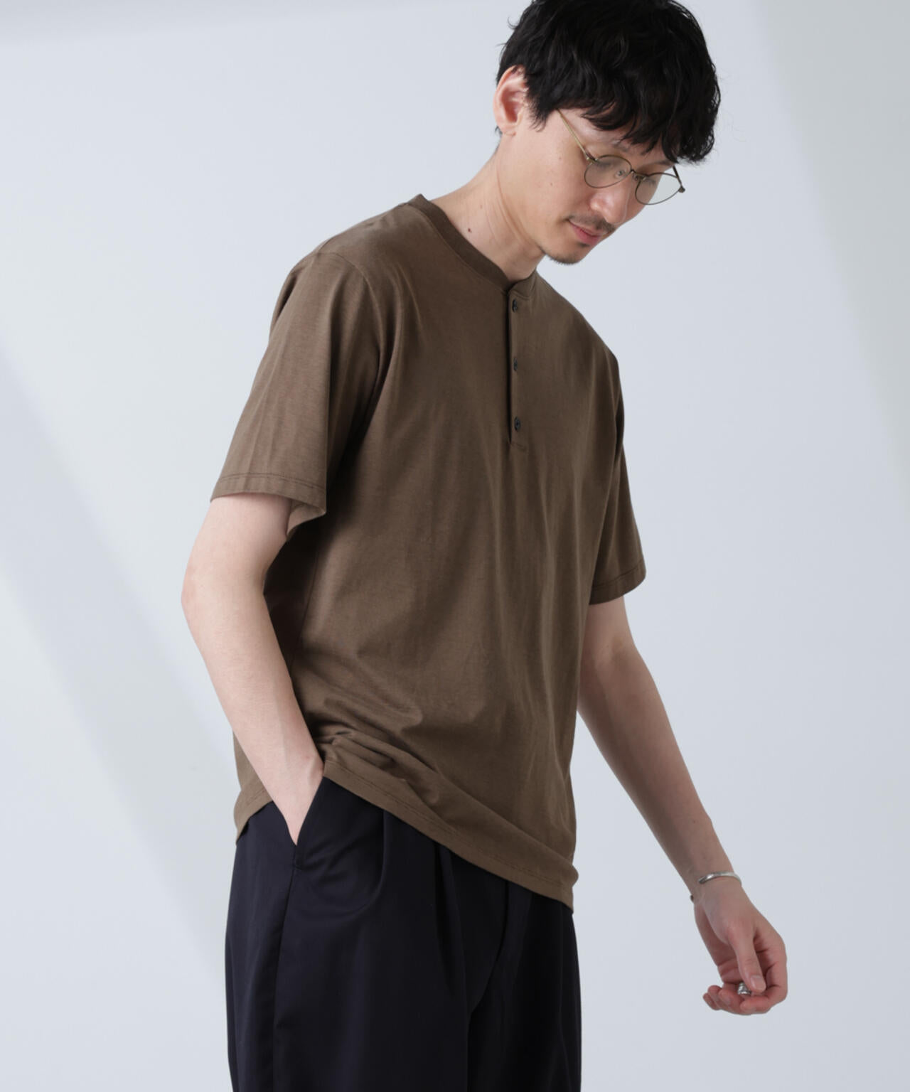 鮮やかな深みあるカラーで大人の色気を感じるヘンリーネックTシャツ。カジュアルに見えがちなTシャツスタイルに、品とクラス感を演出するアイテムです。