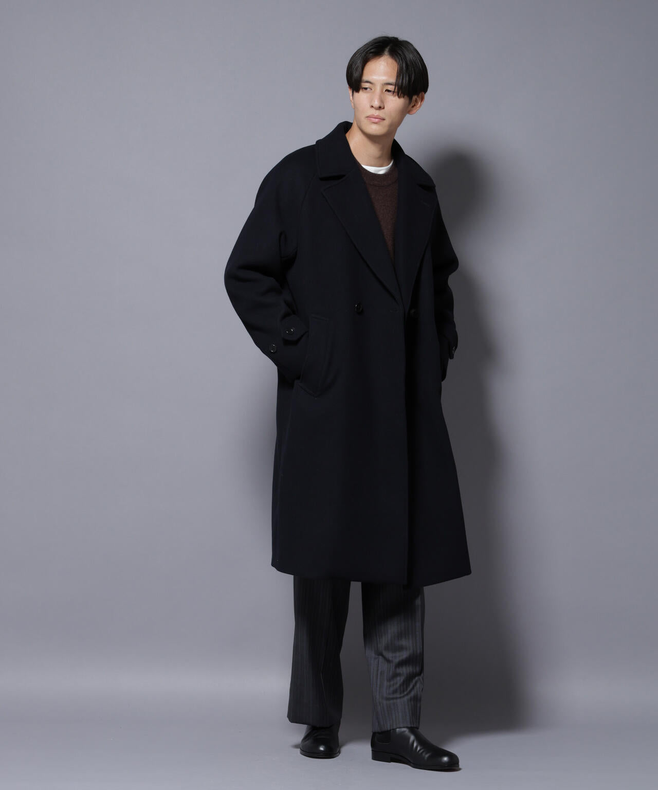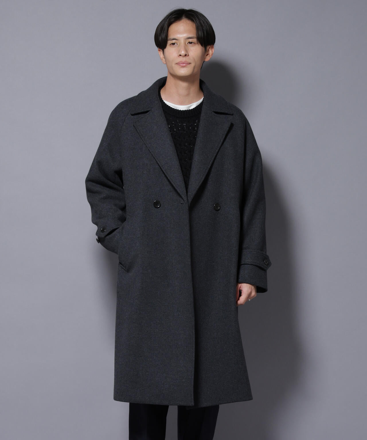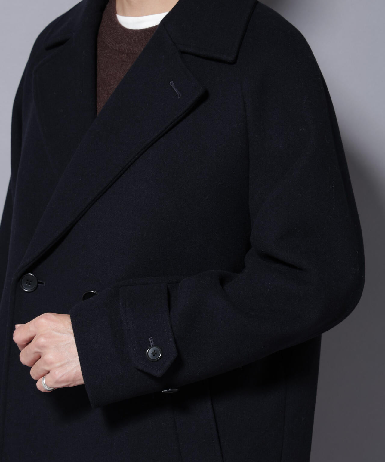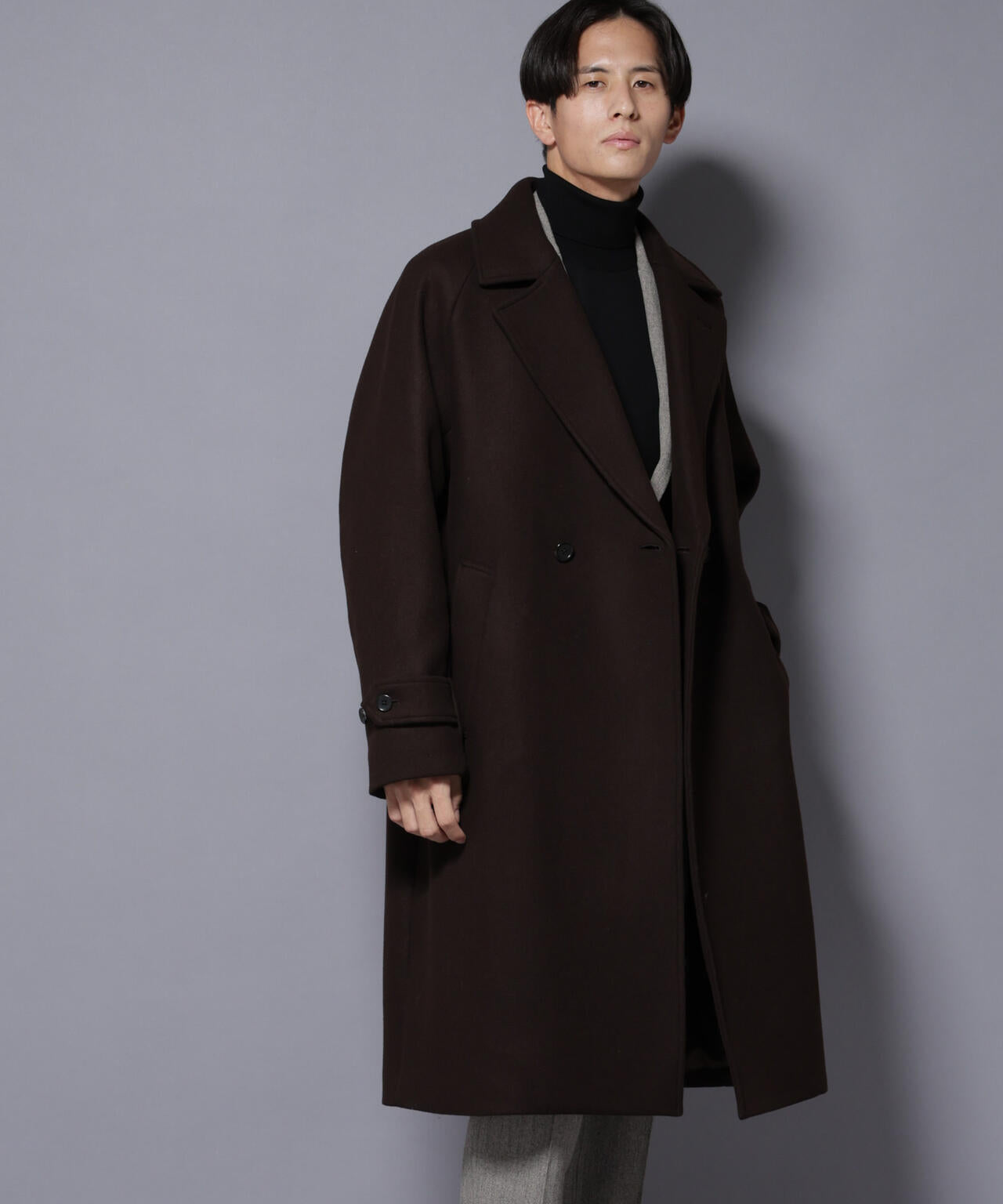 カシミヤミックスの上質な糸を使い、ふんわりとなだらかな肌触りで仕上げた、ナノユニバースオリジナルファブリックのソフトメルトンダブルブレストコート。