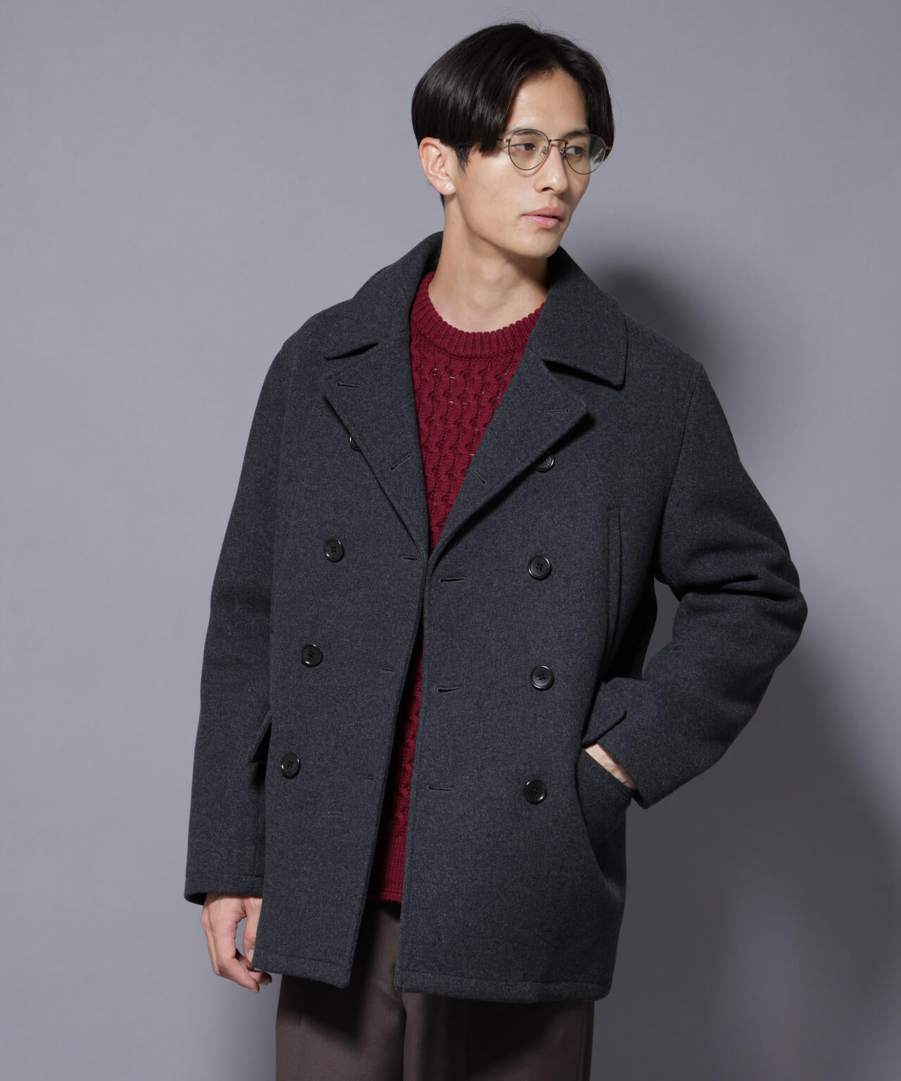 クラシックなU.S. NAVYの10ボタンPコートをベースに、現代的な感覚でややリラックスしたシルエットにアップデート。ダブルブレストの力強いデザインと、しっかりと立ち上がる大ぶりの襟が印象的な1着。