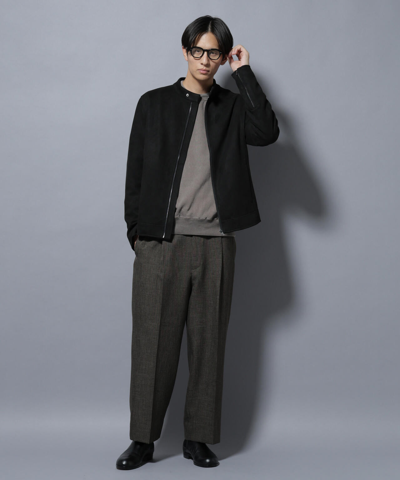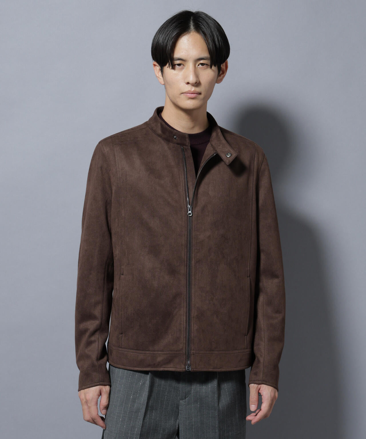 上品な見え方で都会的なフェイクスエードシングルライダース。素材にはフェイクスエードを使用。本革の風合いを感じさせながらも、伸縮性に優れイージーケアなのも嬉しいポイント。インナーとしてもアウターとしても着用可能なロングシーズンお楽しみいただける1着です。