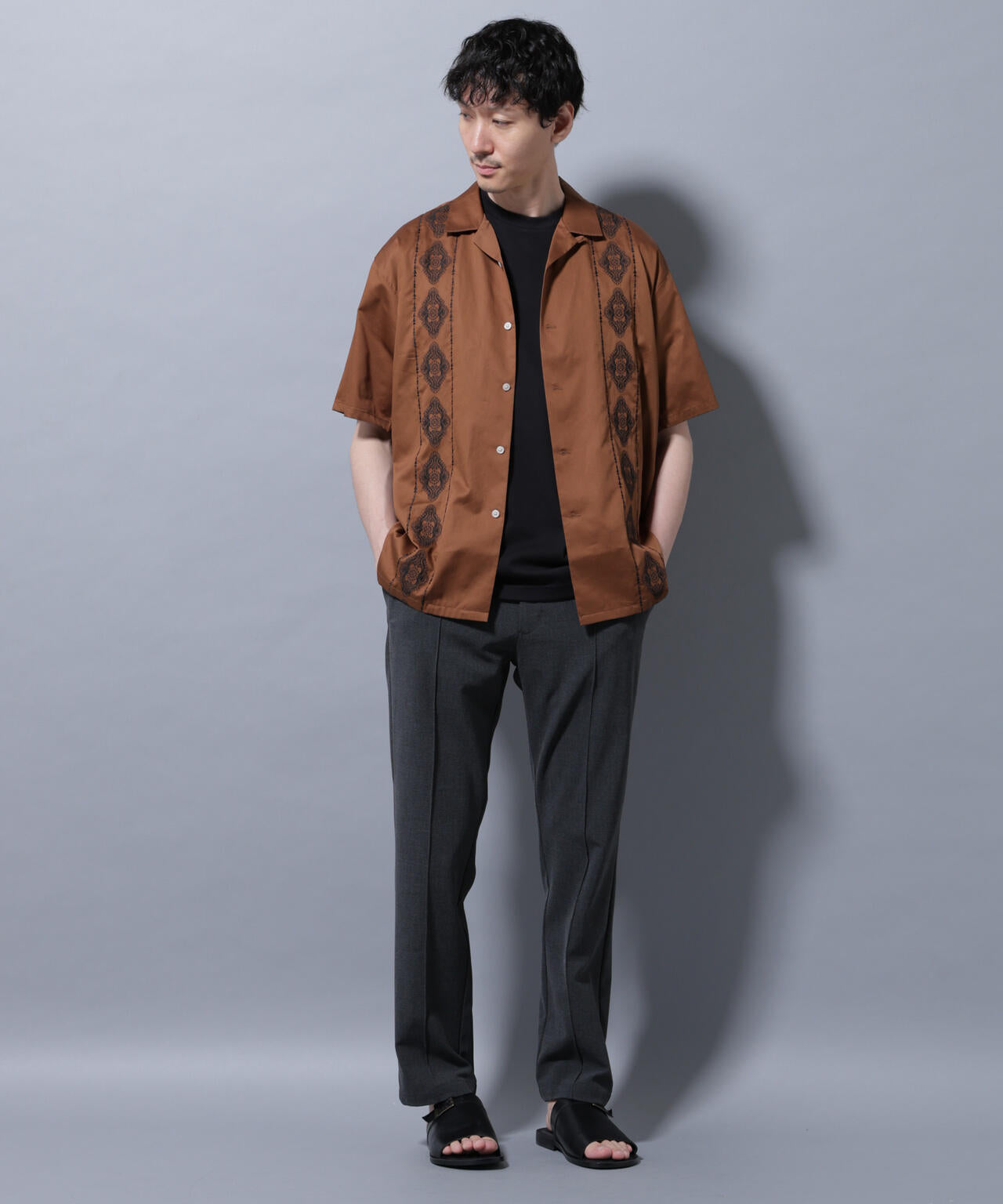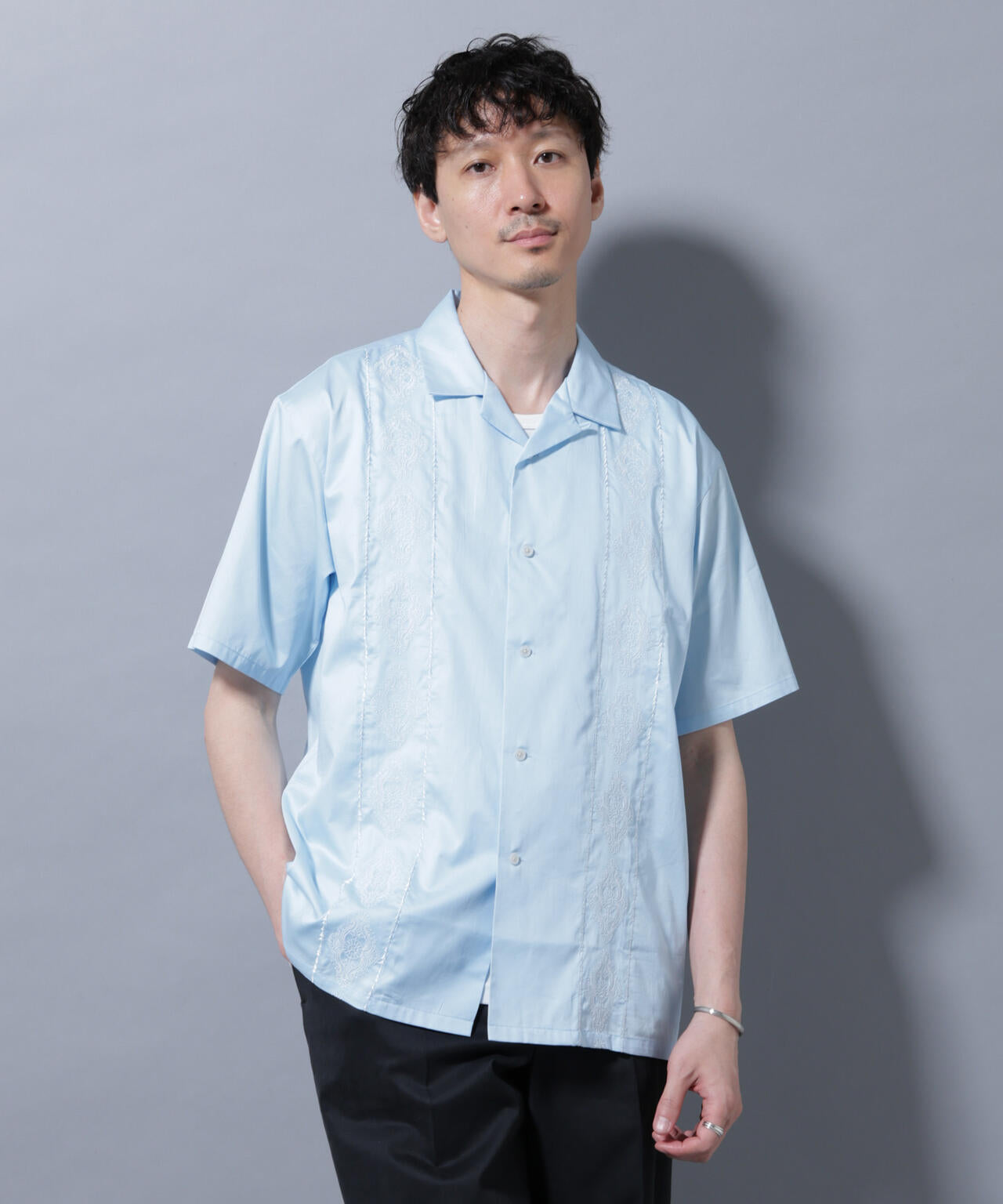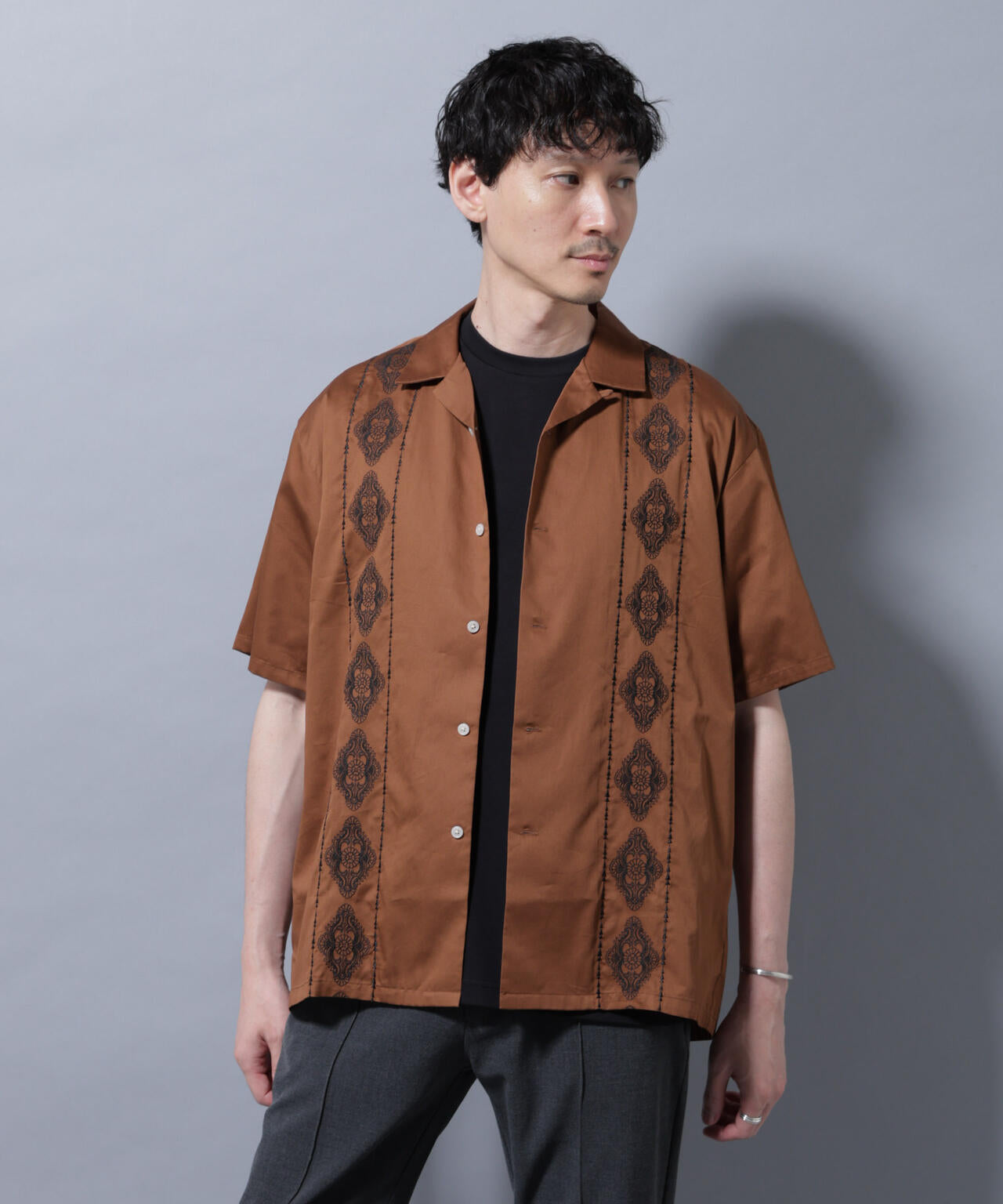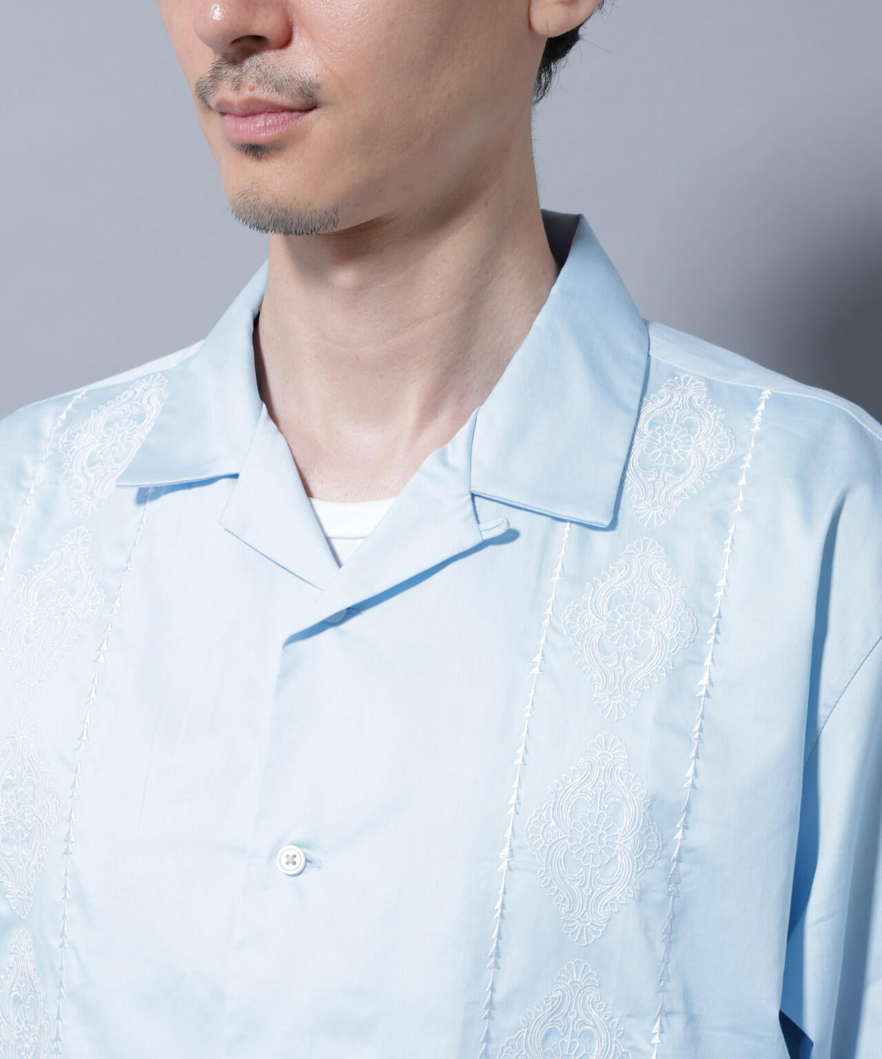 フロント全面に刺繍を施した、クラフト感溢れるオープンカラーシャツ。ダマスク柄をイメージした刺繍デザインが、高級感がありエレガントな印象を与える1着です。