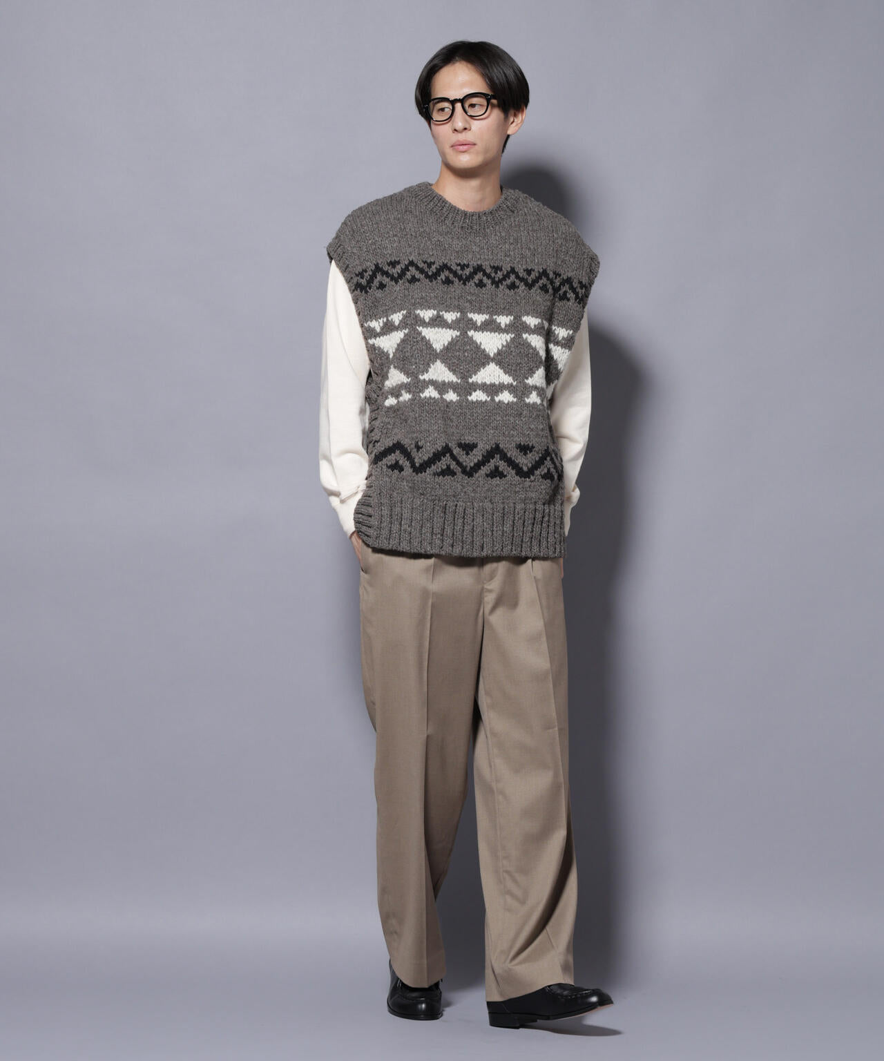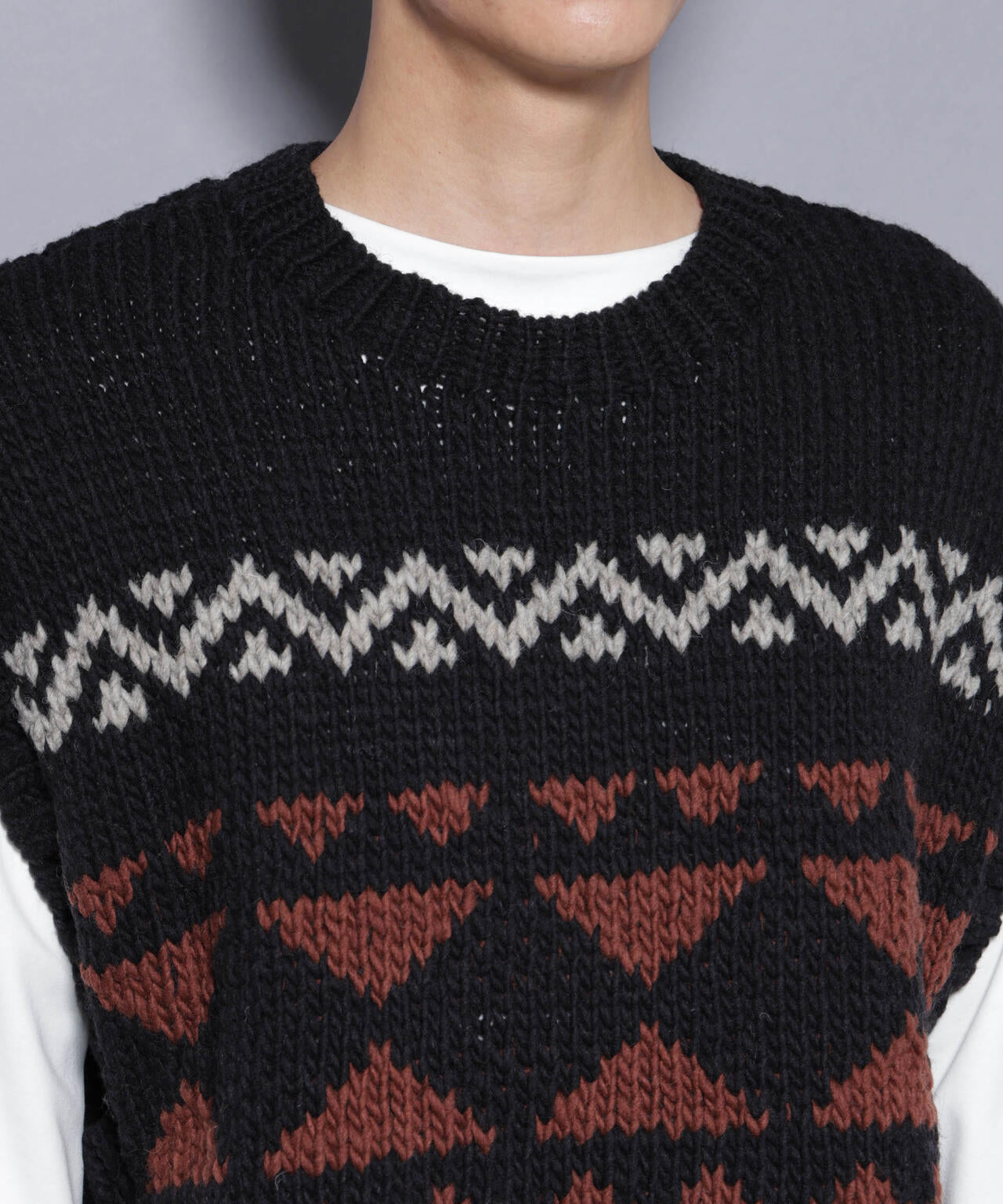 一つ一つ手編みされた贅沢なハンドニットベスト。伝統的な柄をオリジナルに解釈し、ナノユニバースらしい配色に仕上げた一着。秋冬のレイヤードスタイルに活躍するアイテムです。
