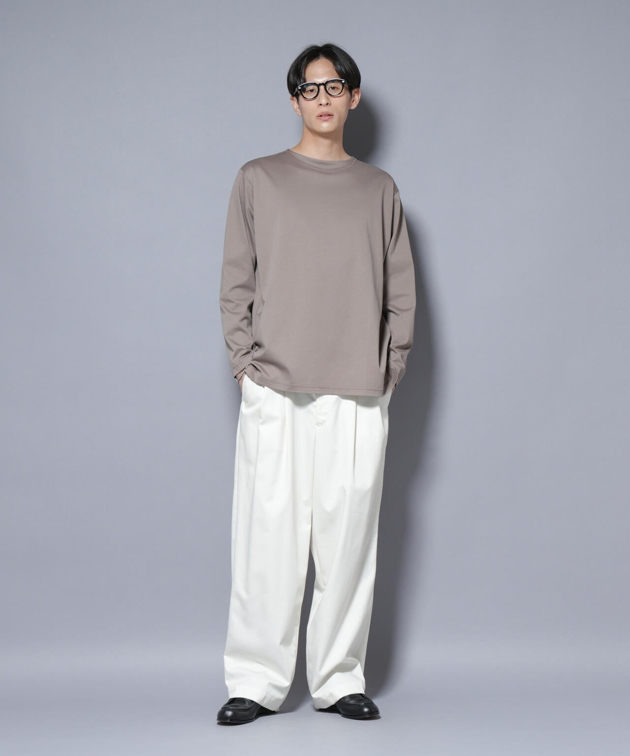 ・細身のスラックスやタック入りのパンツに合わせてクリーンな大人カジュアルに