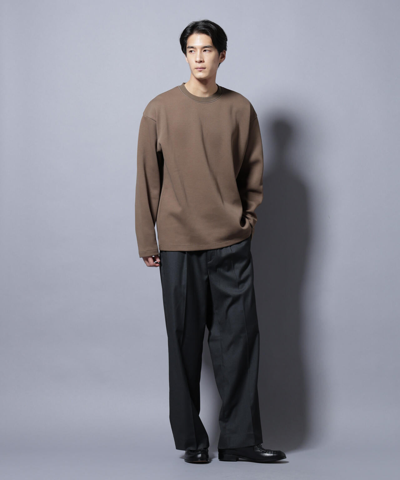 ・ナイロンや梳毛調のスポーティーな素材からきれいめなパンツに合わせると、リラックス感がありながらも小綺麗な印象に。