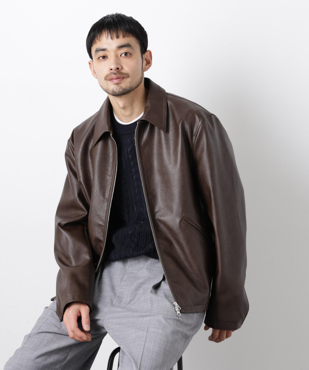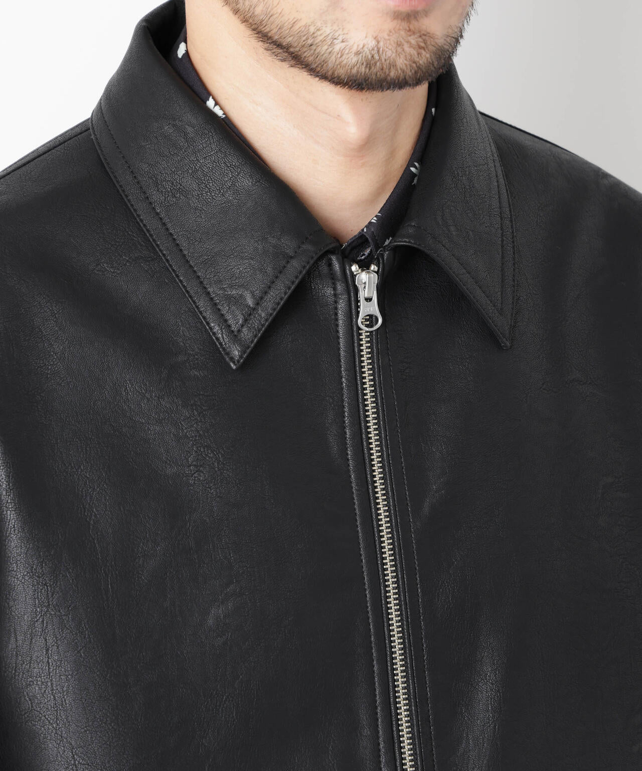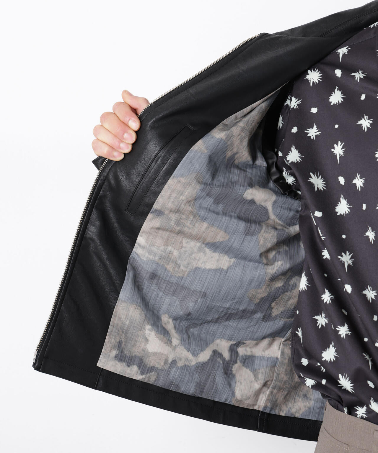 ベーシックなスポーツジャケット仕様のフェイクレザーブルゾン。「WARP PRINT」という手法で、カモフラージュ柄をプリントしたオリジナル素材をライニングに採用。独特な表情を持たせた裏地がアクセントになる、春の羽織に活躍の一着です。