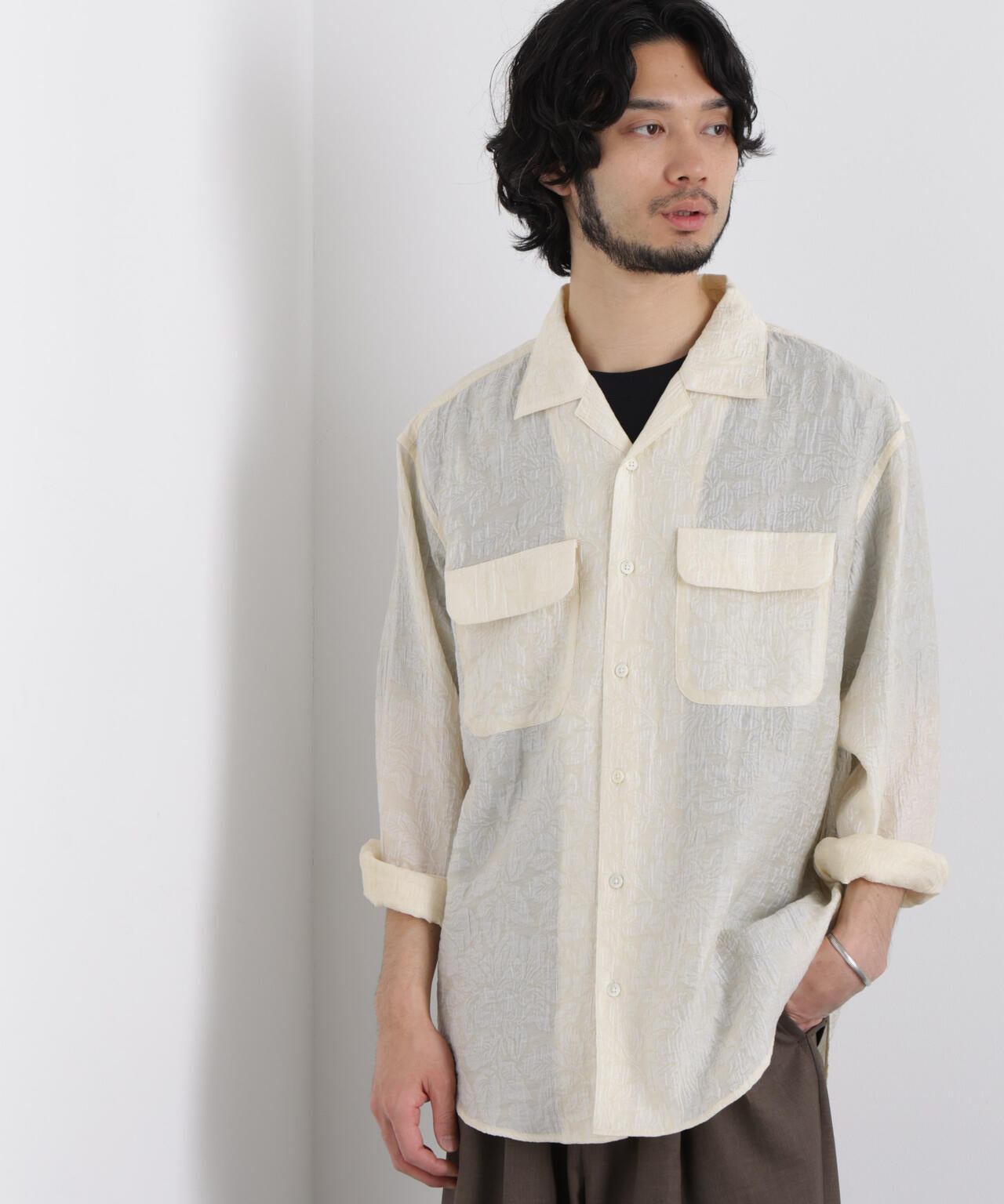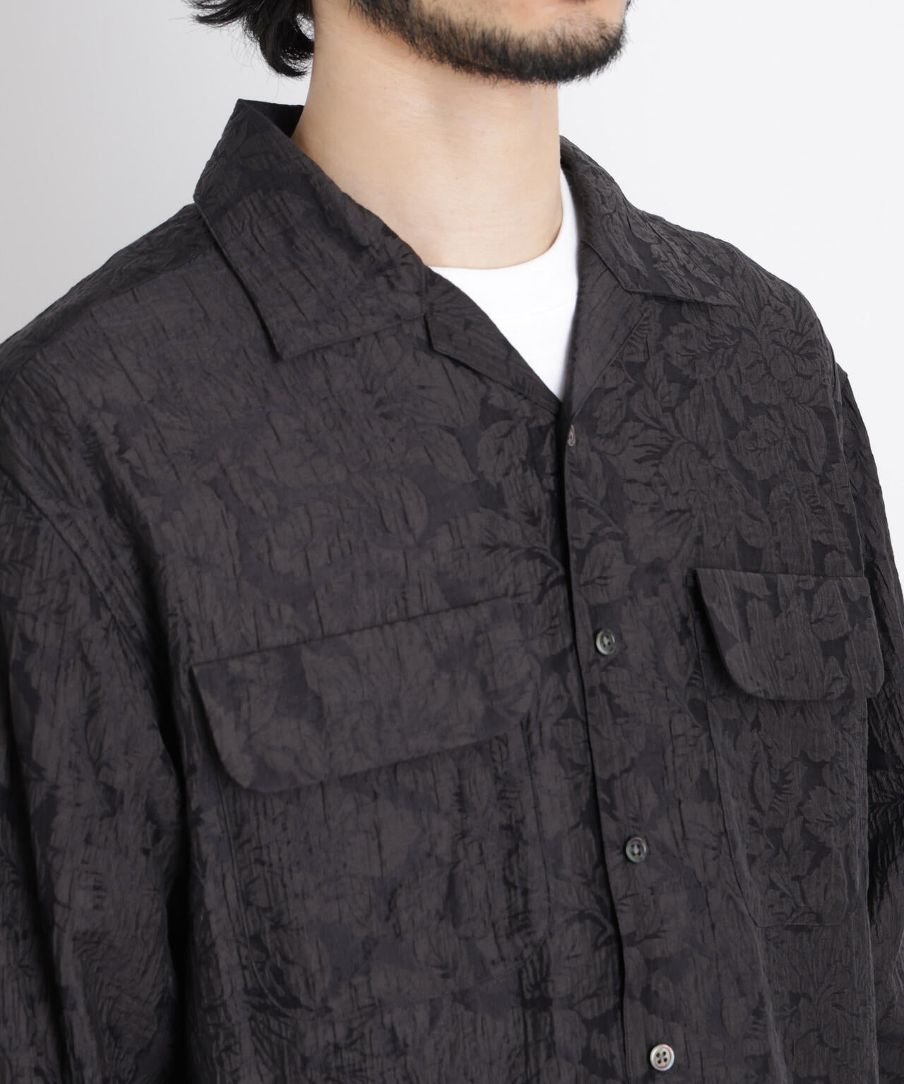 サイレントブルームをキーワードに、フラワージャガード素材をメンズライクなデザインに昇華したシャツ。ややルーズなオーバーシャツで、春の羽織りアイテムとしておすすめなアイテムです。