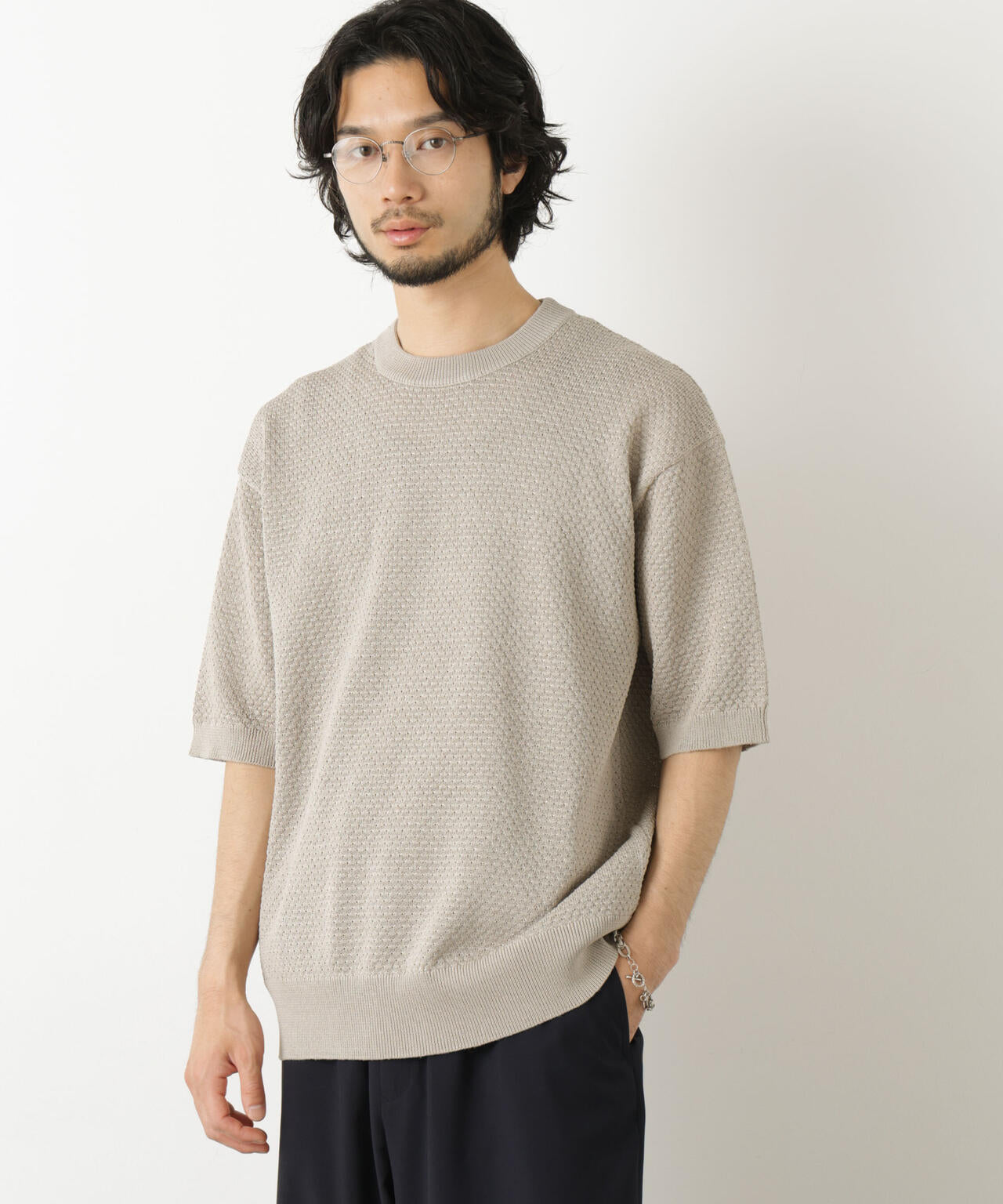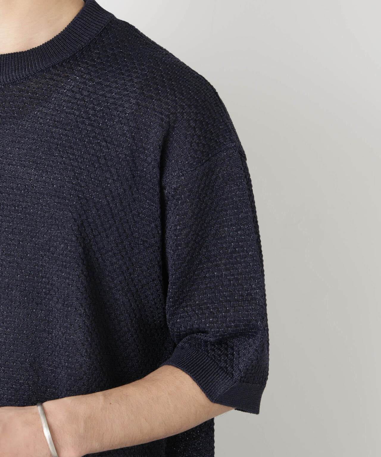 ざっくりとした透かし模様が特徴のクロシェニットTシャツ。ポリエステルの素材にギマ加工を施し、麻の様なシャリ感と光沢感を可能に。涼し気な見た目で、春夏のコーディネートにぴったりのアイテムです。
