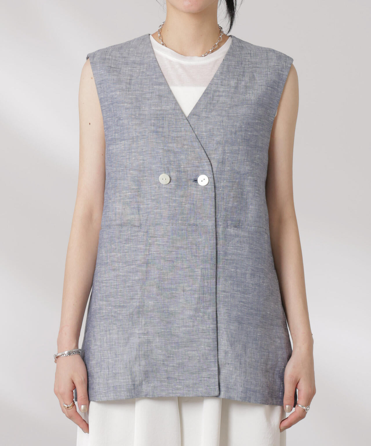 清涼感のあるリネン素材で仕立てたジレ。シャツやロンTとレイヤードしたり、ブラウス感覚で一枚で着たりとシーズンや気温に合わせてスタイリングを楽しめる一着です。