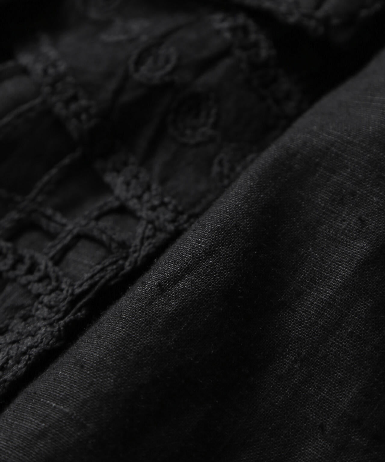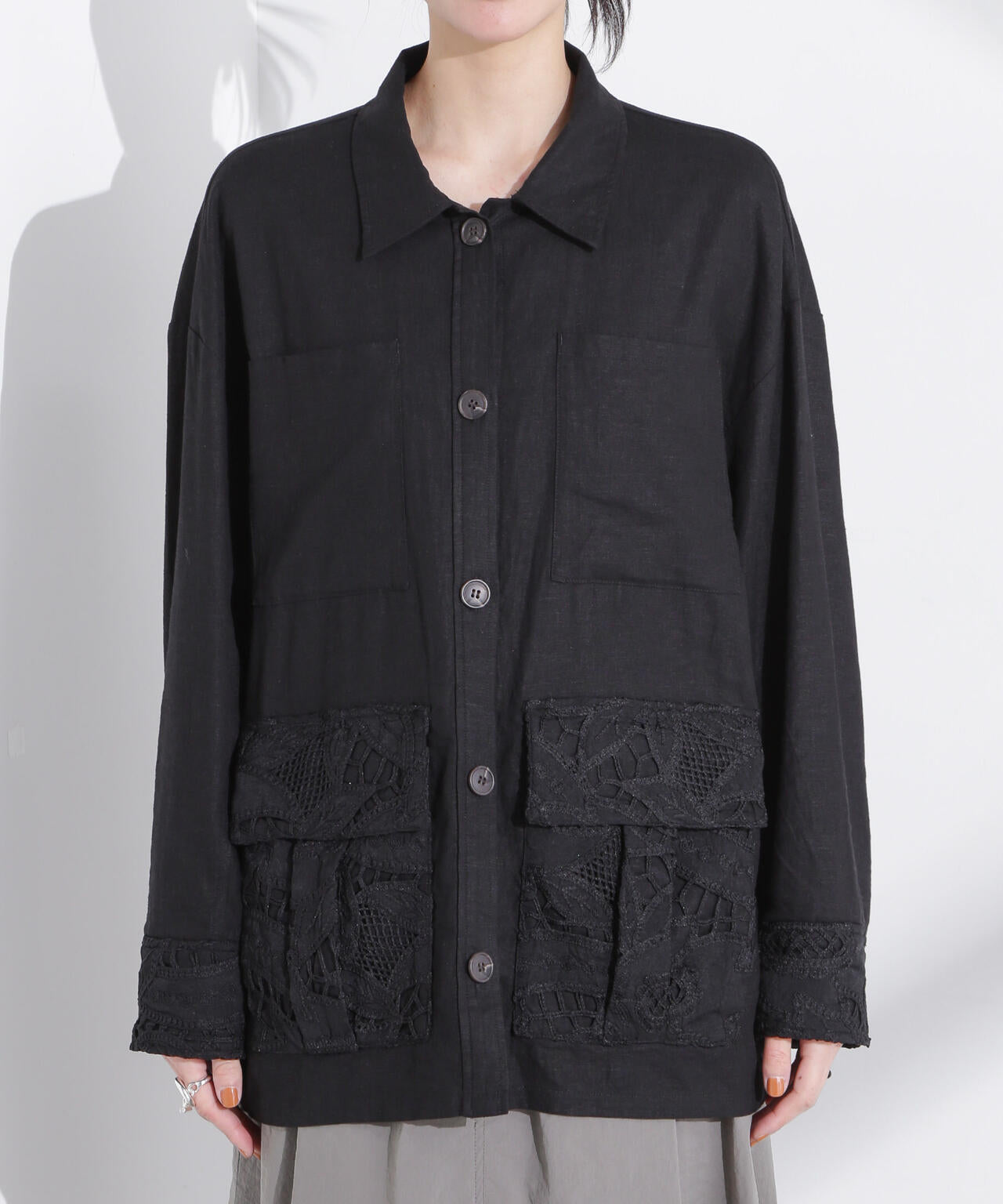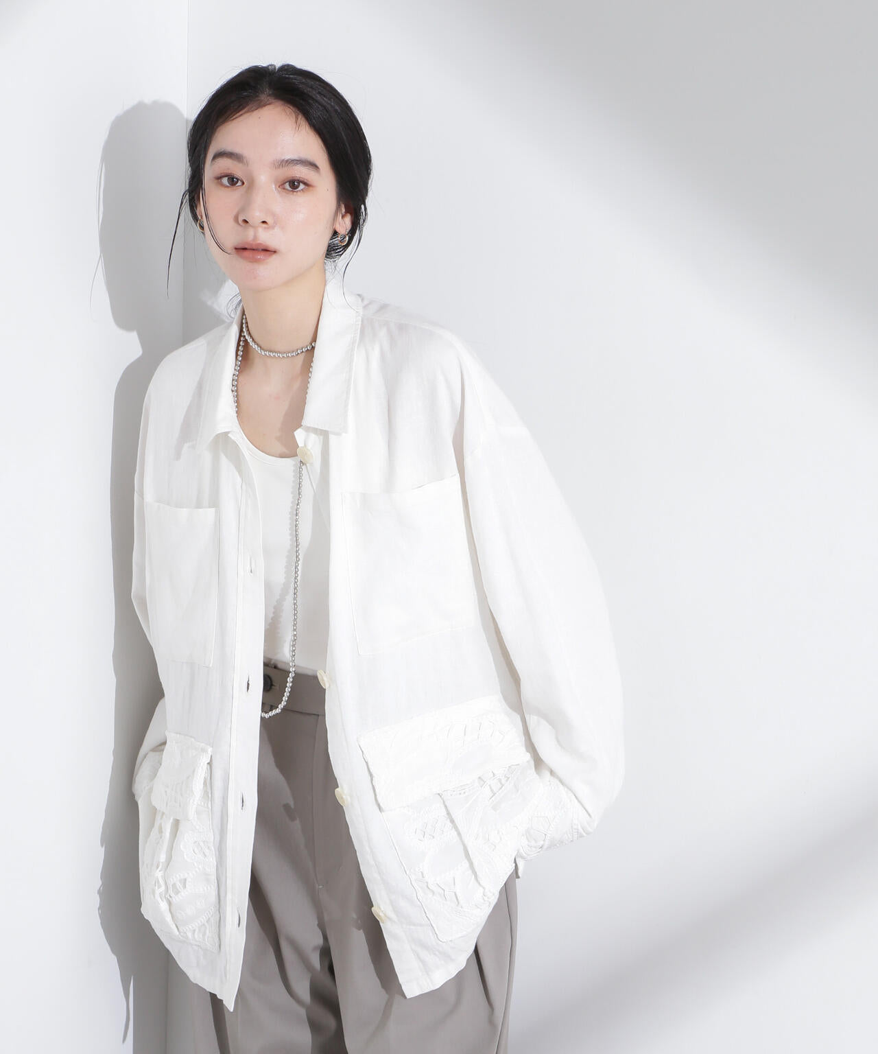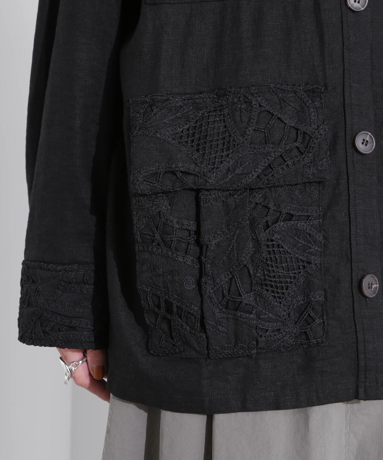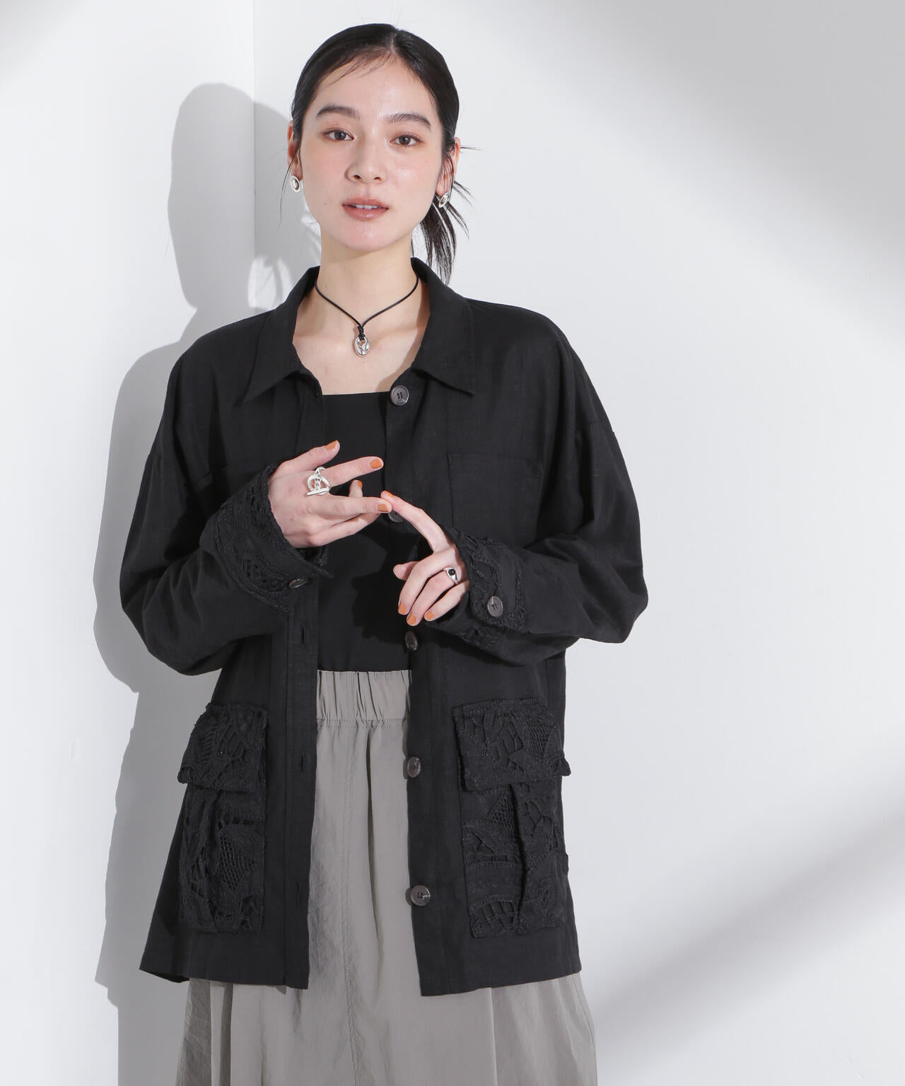 リネン混素材で仕立てたサファリジャケット。アクセントに効かせたレース使いがリメイクしたような雰囲気で、特別感のあるアイテム。メンズライクなアイテムを女性らしく着こなせるように、デザインにも素材にも拘りが詰まった一着です。