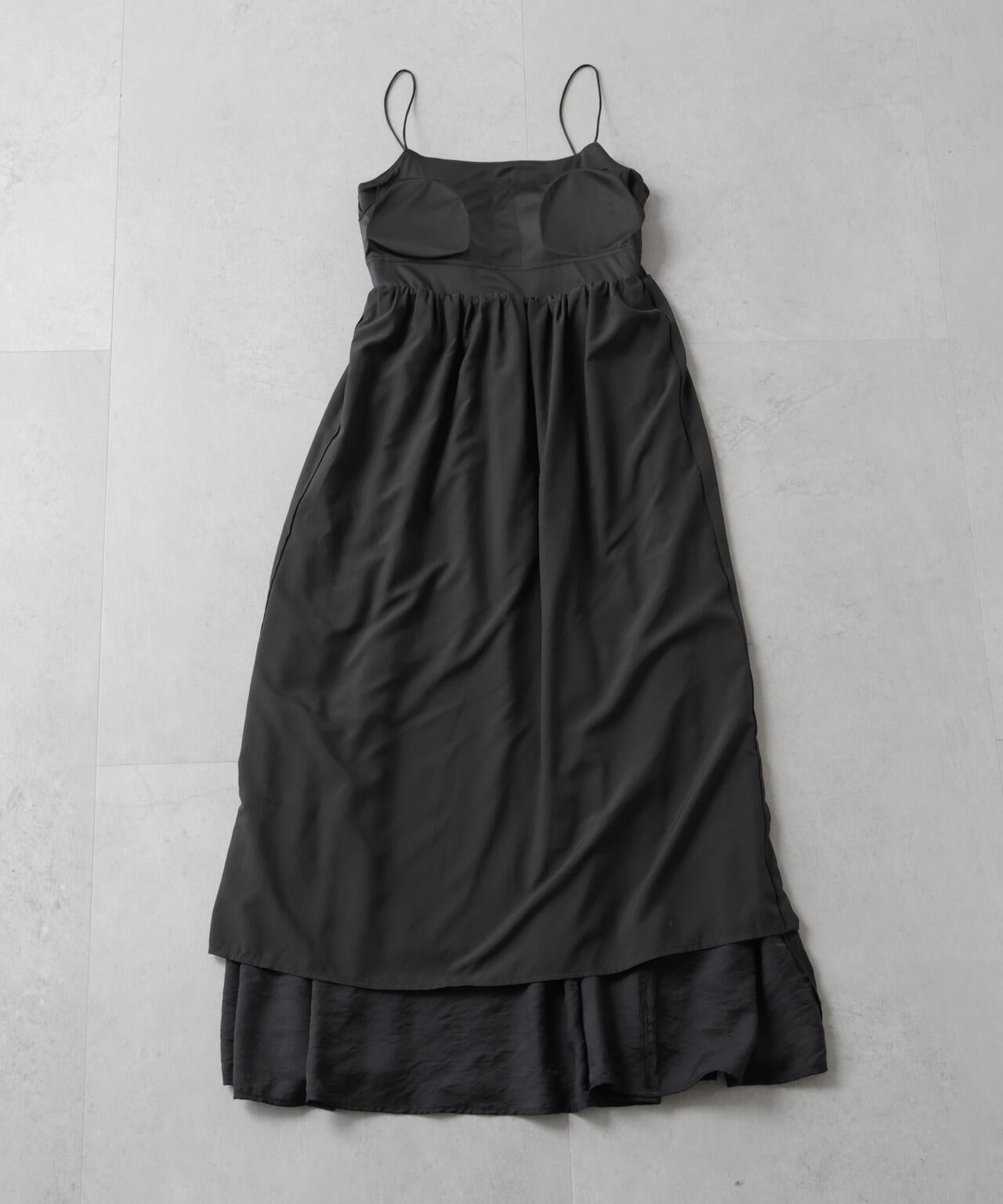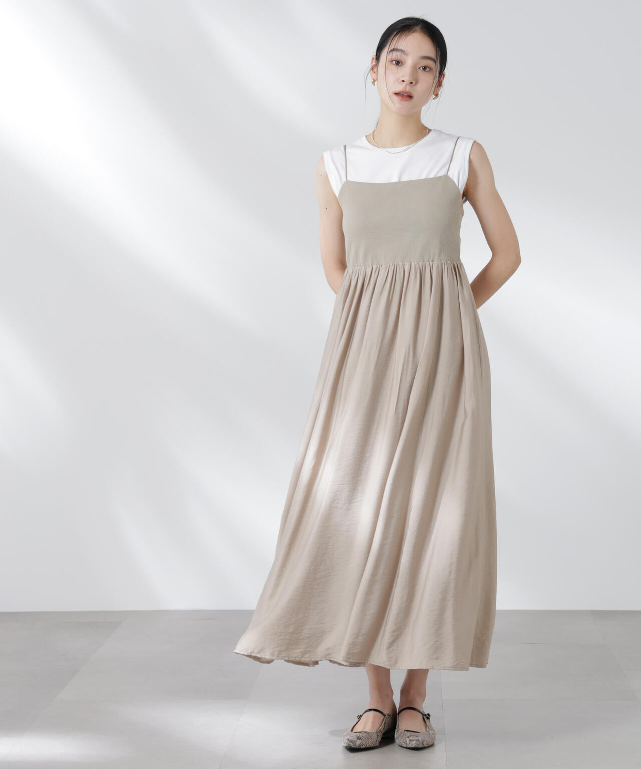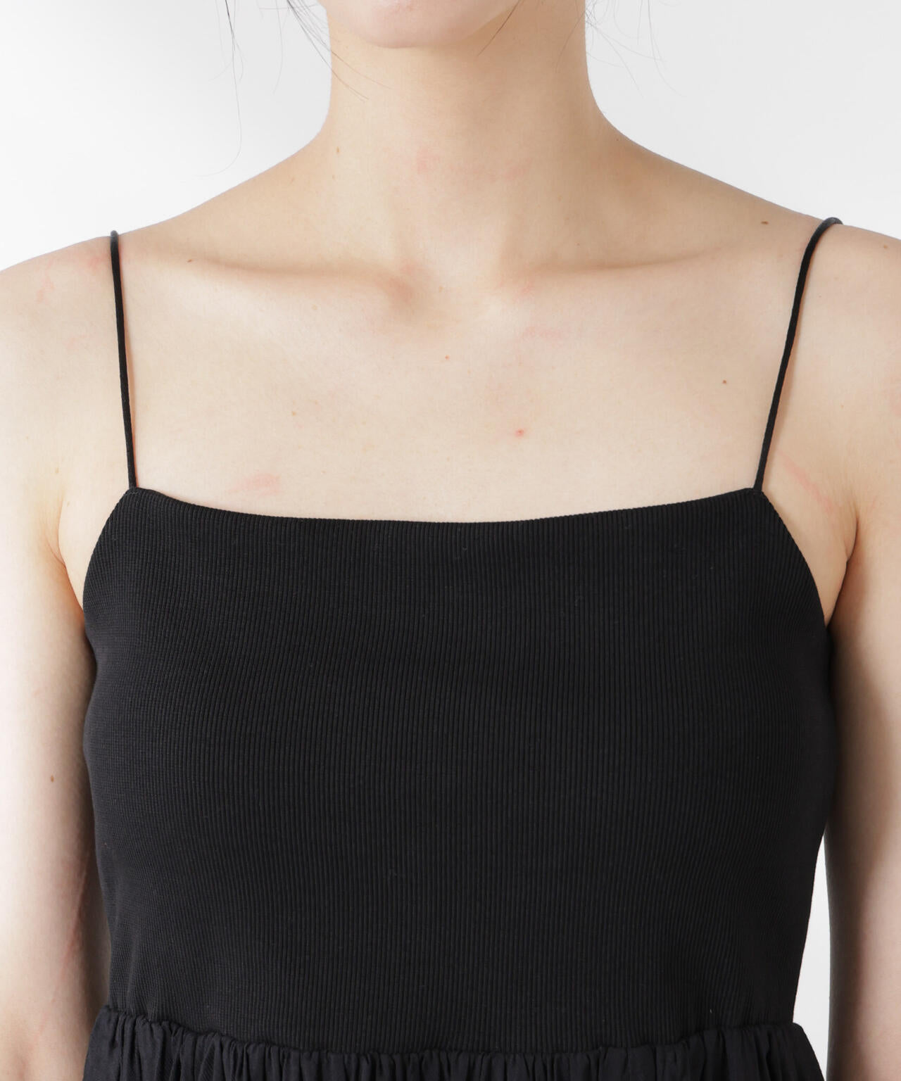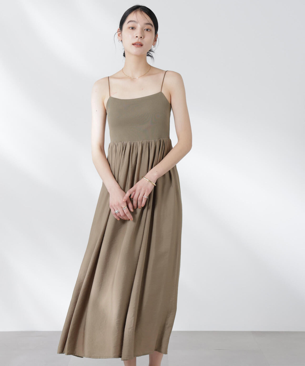 上品な異素材ドッキングのキャミワンピース。スタイルアップとトレンド感が叶う腰位置高めの切り替えで、女性らしさが引き立つサテンコードを使用した細身の肩紐も魅力的◎。着用可能な取り外し可能なカップ付きで、一枚で着るのはもちろん、カップを外してTシャツなどの上からレイヤードも出来る2way仕様のアイテムです!