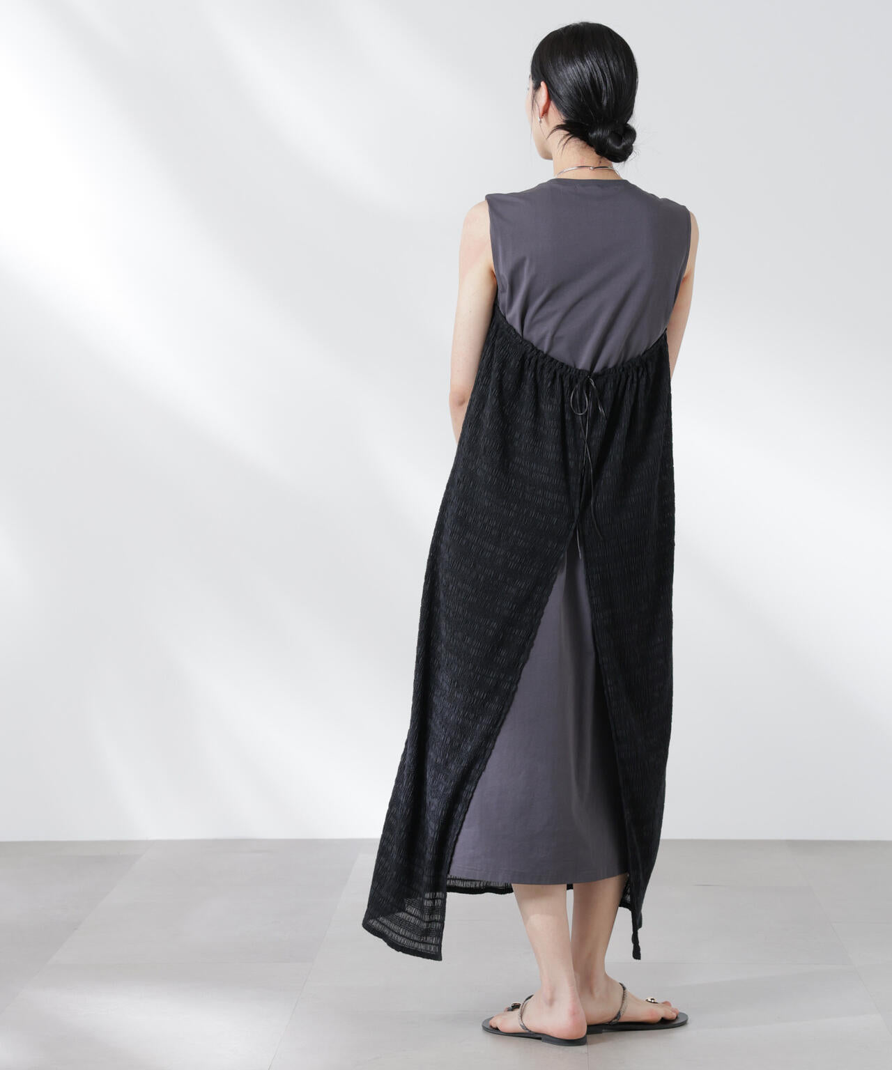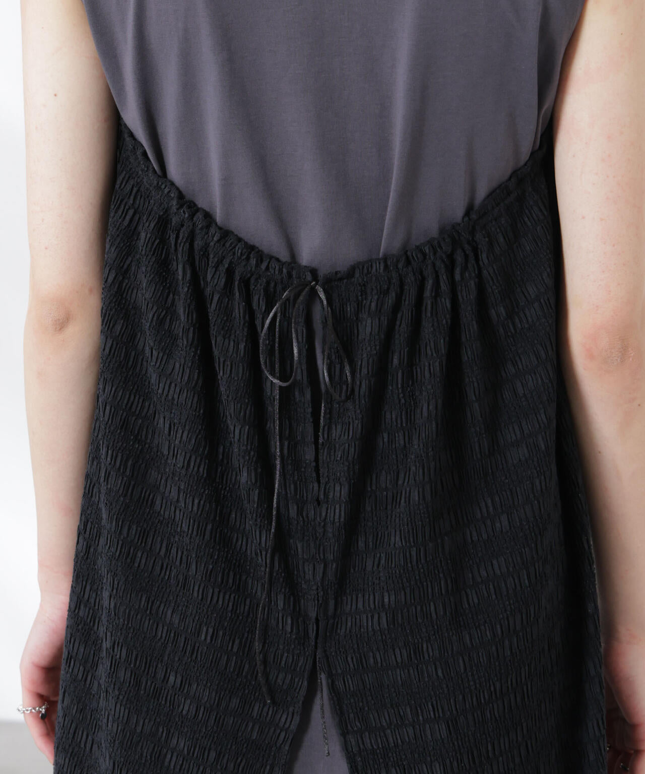 一枚で重ね着したようなレイヤードスタイルが完成するカットワンピース。フロントはベア切替でドッキング、後ろは振らしのスリットデザインで前後違う見え方もポイント。楽ちんにお洒落ができる夏のワードローブに追加したいひと品です!