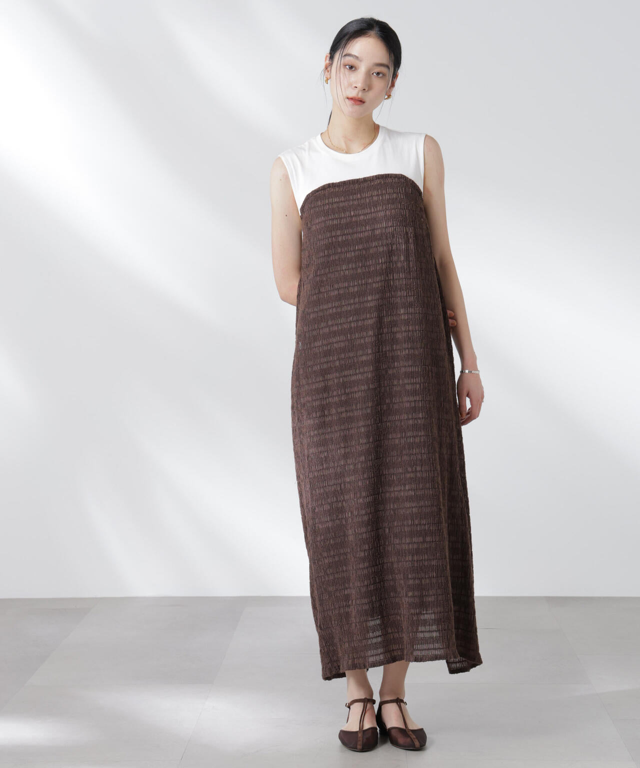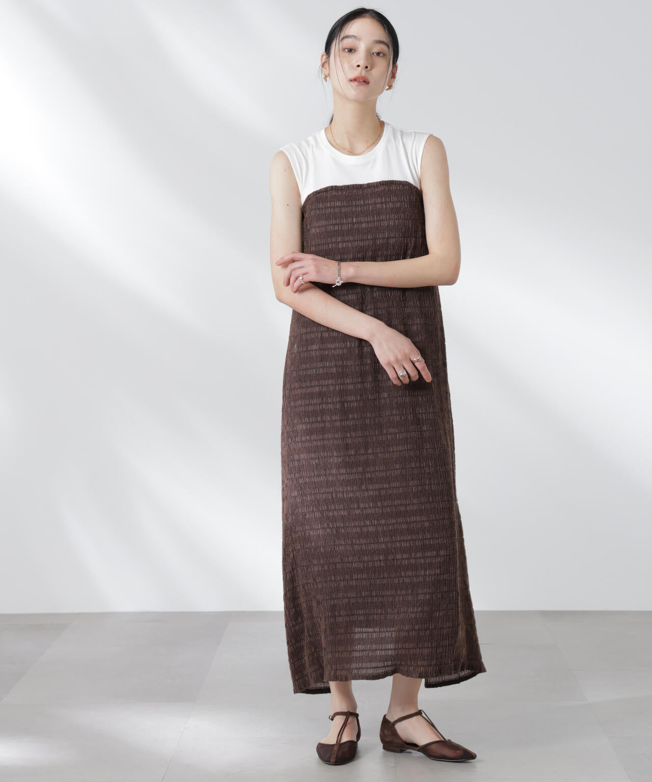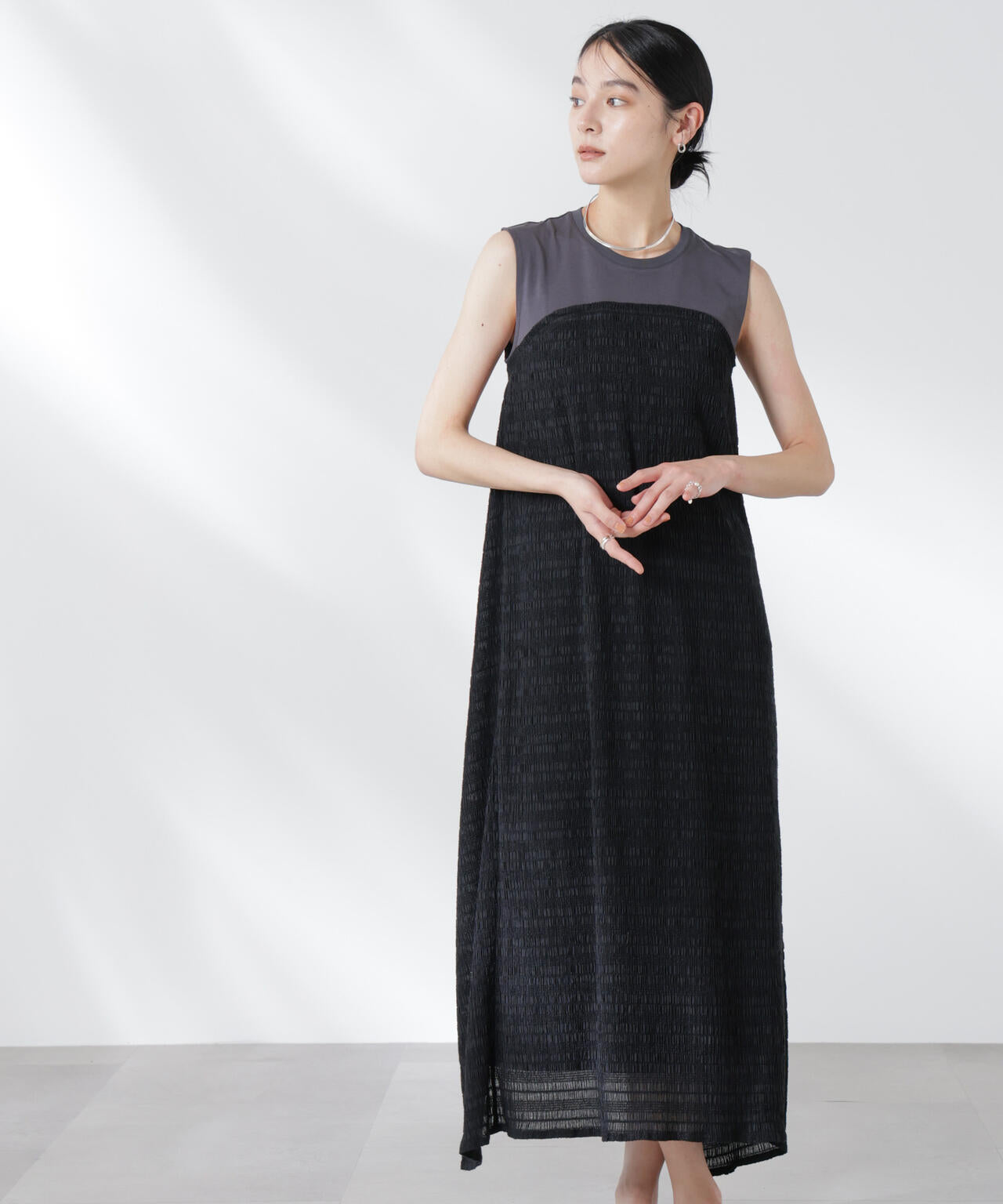 一枚で重ね着したようなレイヤードスタイルが完成するカットワンピース
