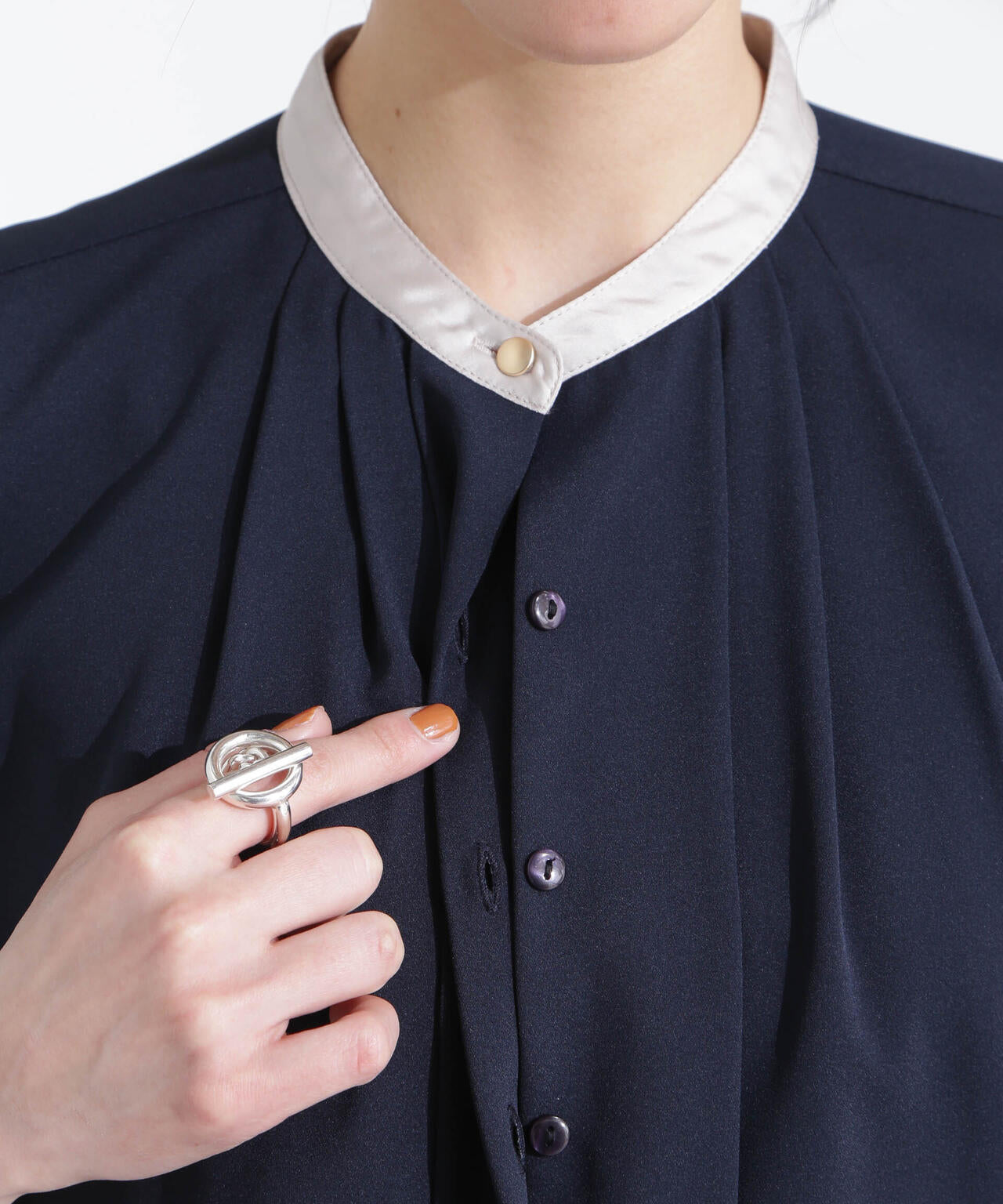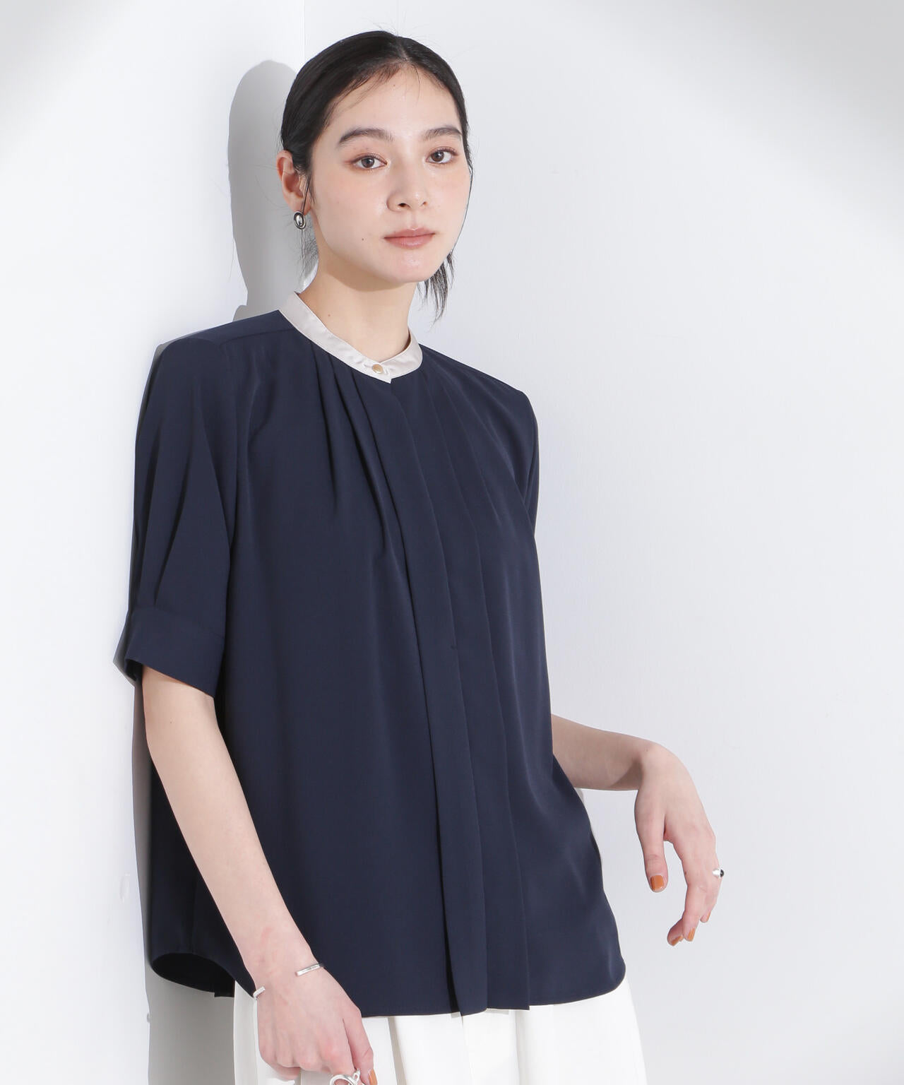 毎年人気のオンスタイル合わせに重宝するバイカラーブラウス。配色使いのスタンドカラーと衿ぐりのフロントタックのデザインが、ジャケットやコートインでも華やかな印象に魅せてくれる一着です。