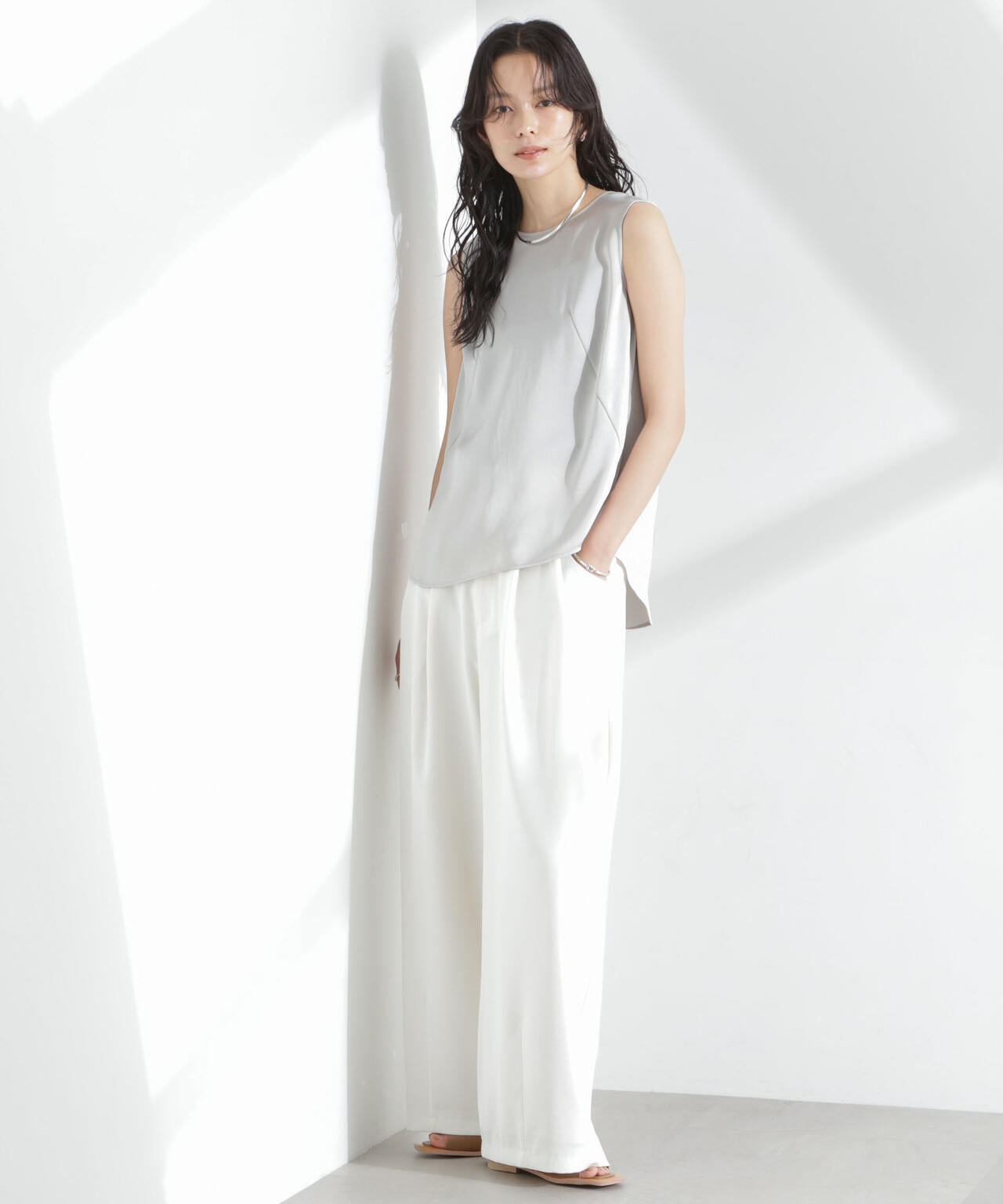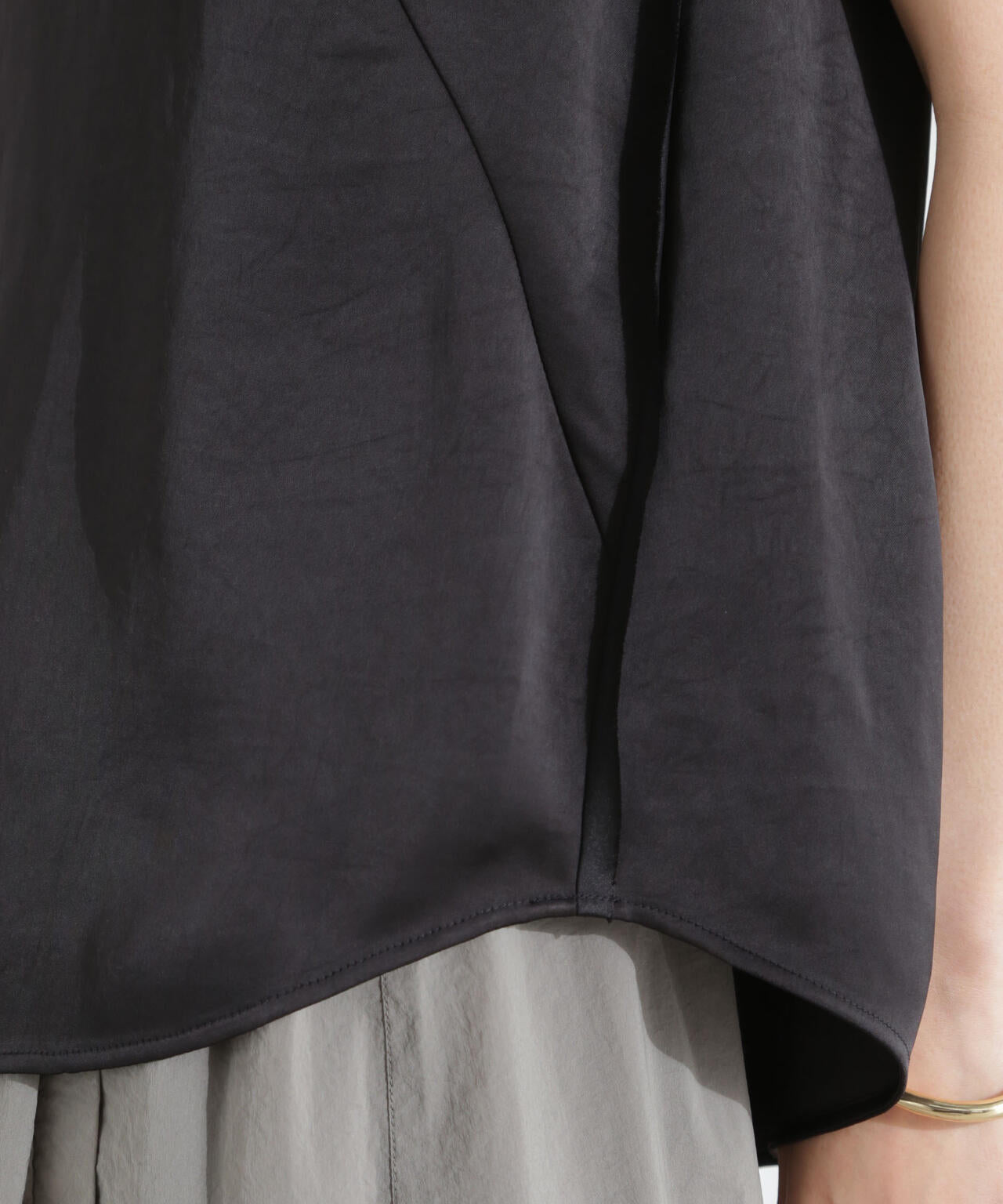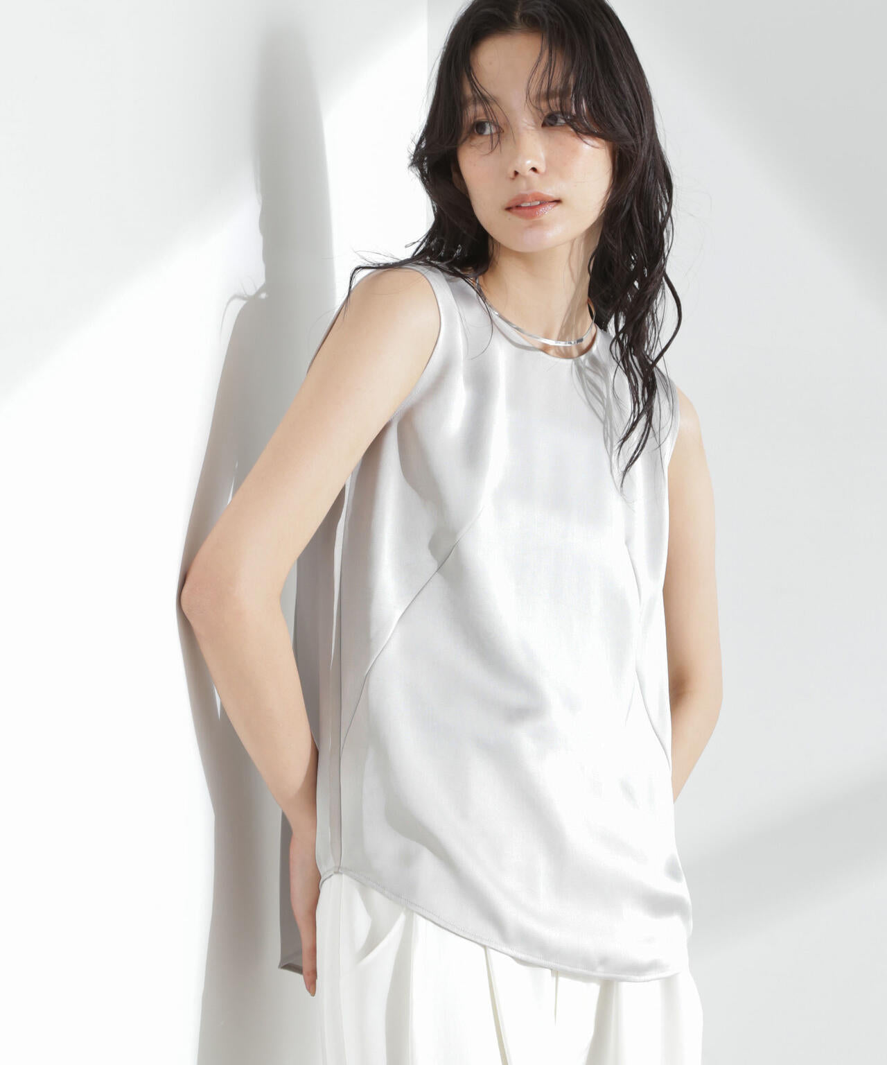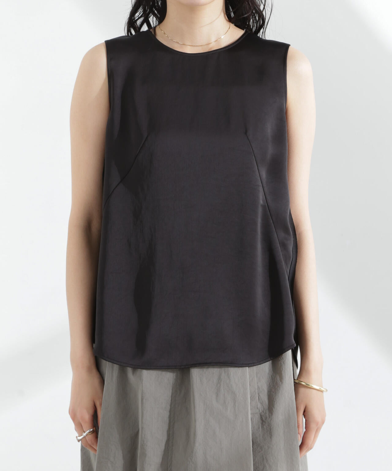 程良いヴィンテージ感とシルクのような風合いが魅力のダブルサテンで仕立てたノースリーブトップス。カットオフの別布を挟み込んだサイドや、シンプルなルックスに映える特徴的なダーツの斜めラインがポイント。どんなスタイリングにも合わせやすい一着です。