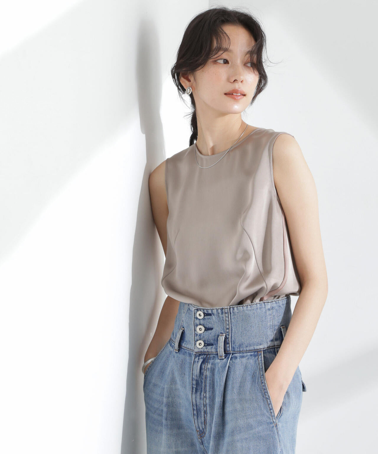 程良いヴィンテージ感とシルクのような風合いが魅力のダブルサテンで仕立てたノースリーブトップス