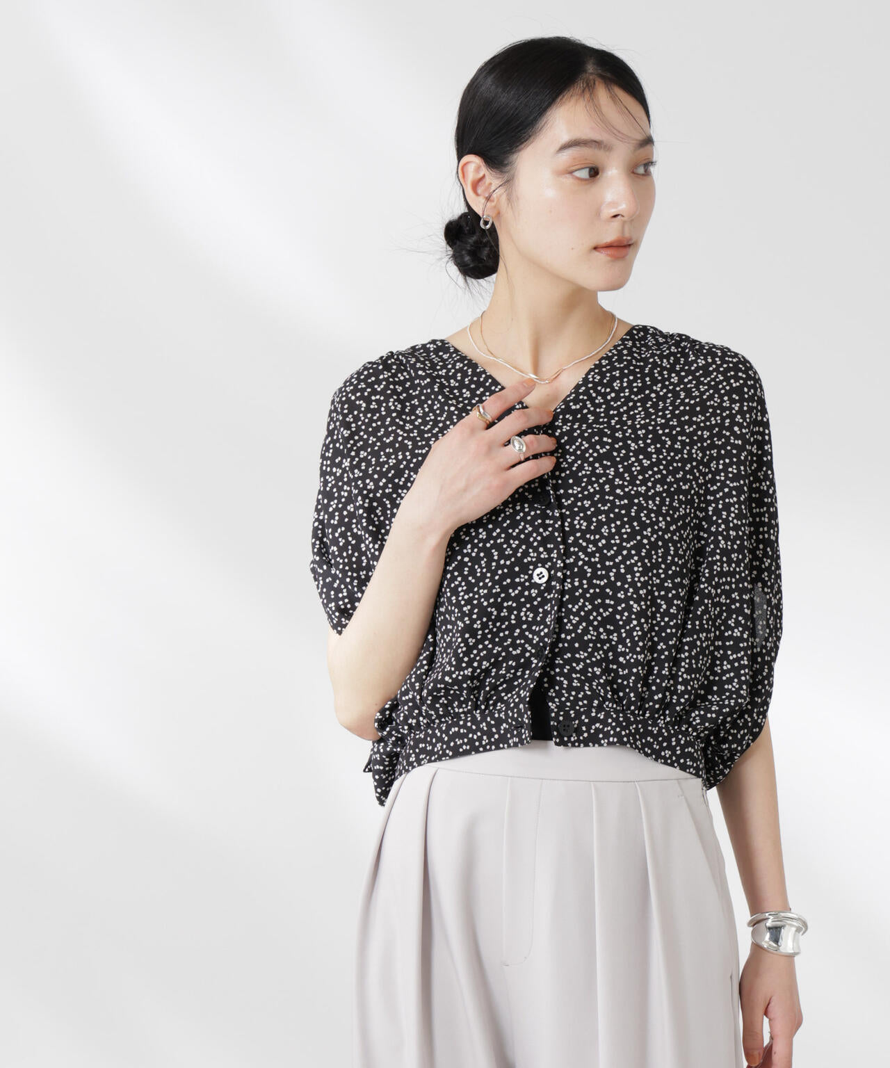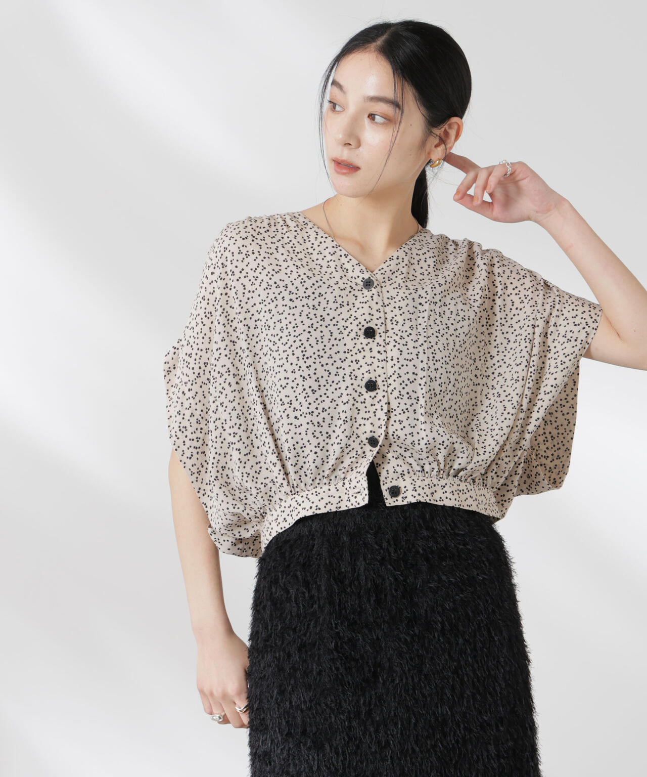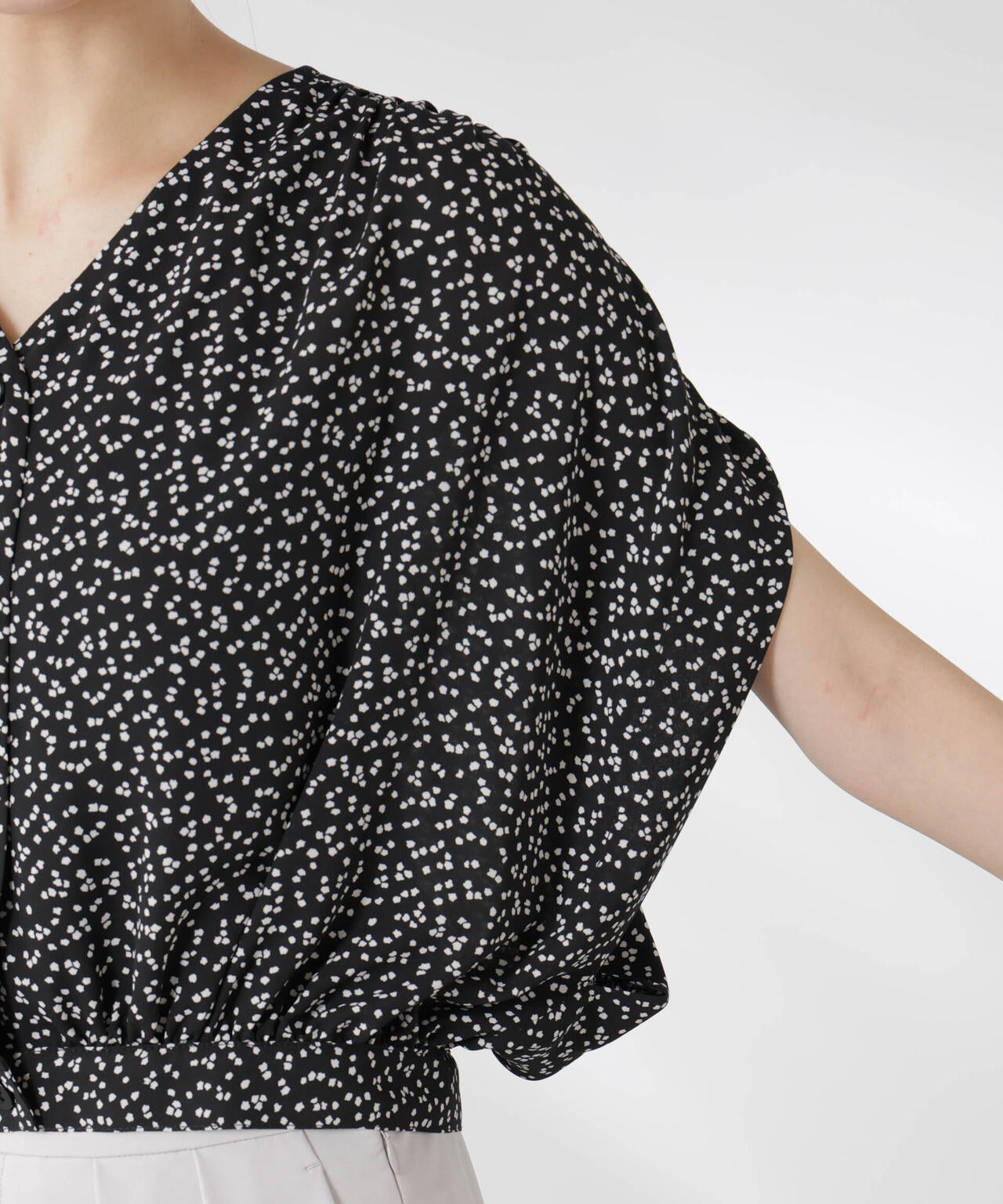 スクエアの細かな変形ランダムドット柄が目をひくVネックブラウス。ややワイドなゆったりめの身幅にショート丈でバランスを取ったトレンド感のあるシルエット。裾切り替えでギャザーがたぷっとたまるフォルムが可愛い一着です。