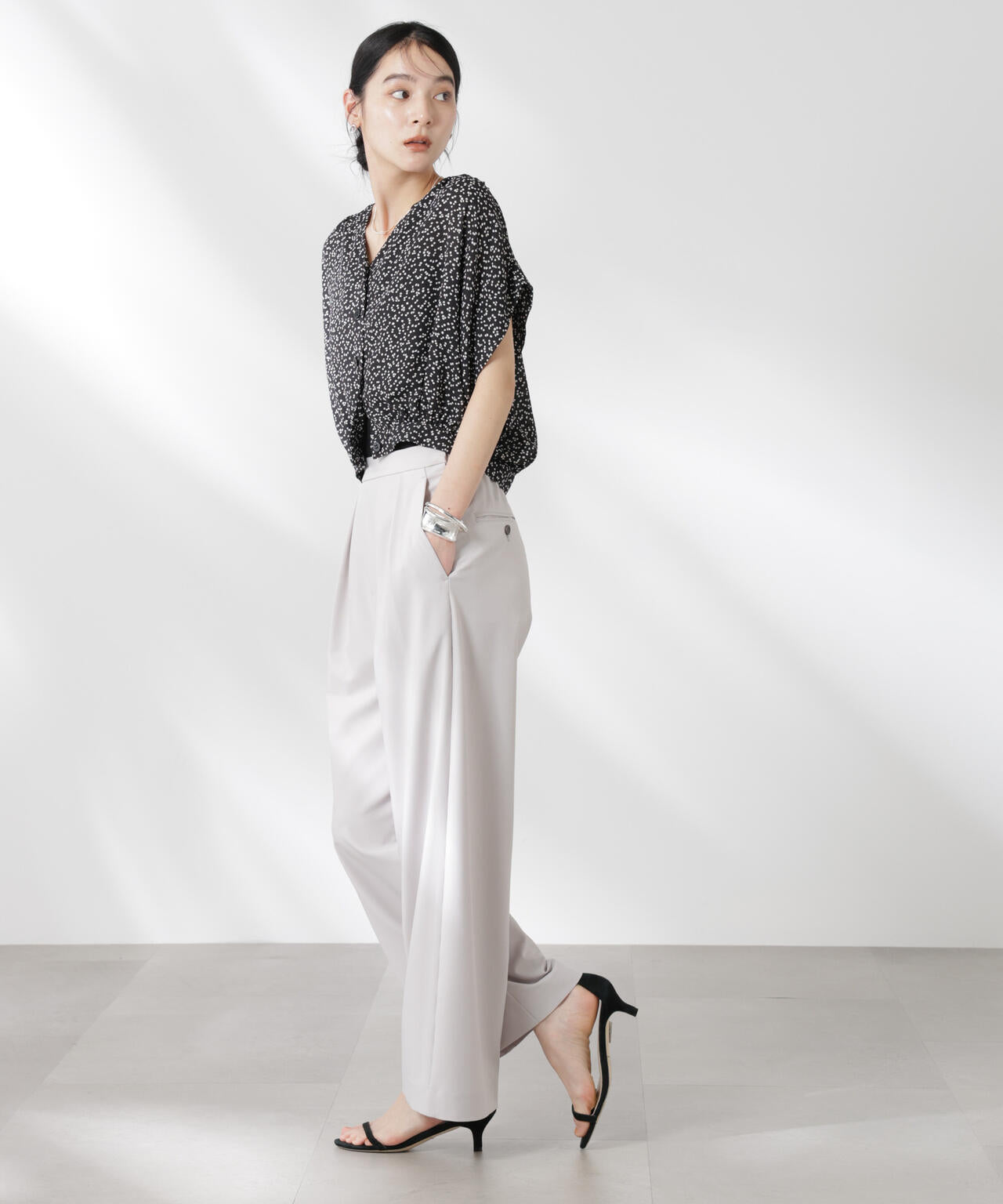 釦を留めてプルオーバーブラウスとしてワイドパンツを合わせたスタイルがおすすめ