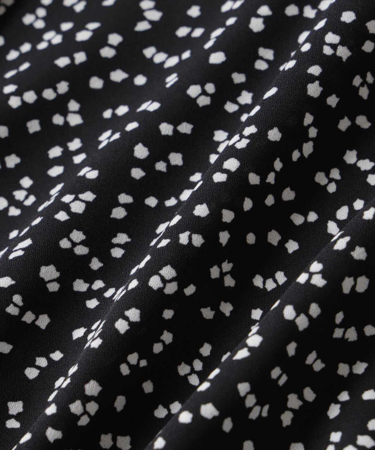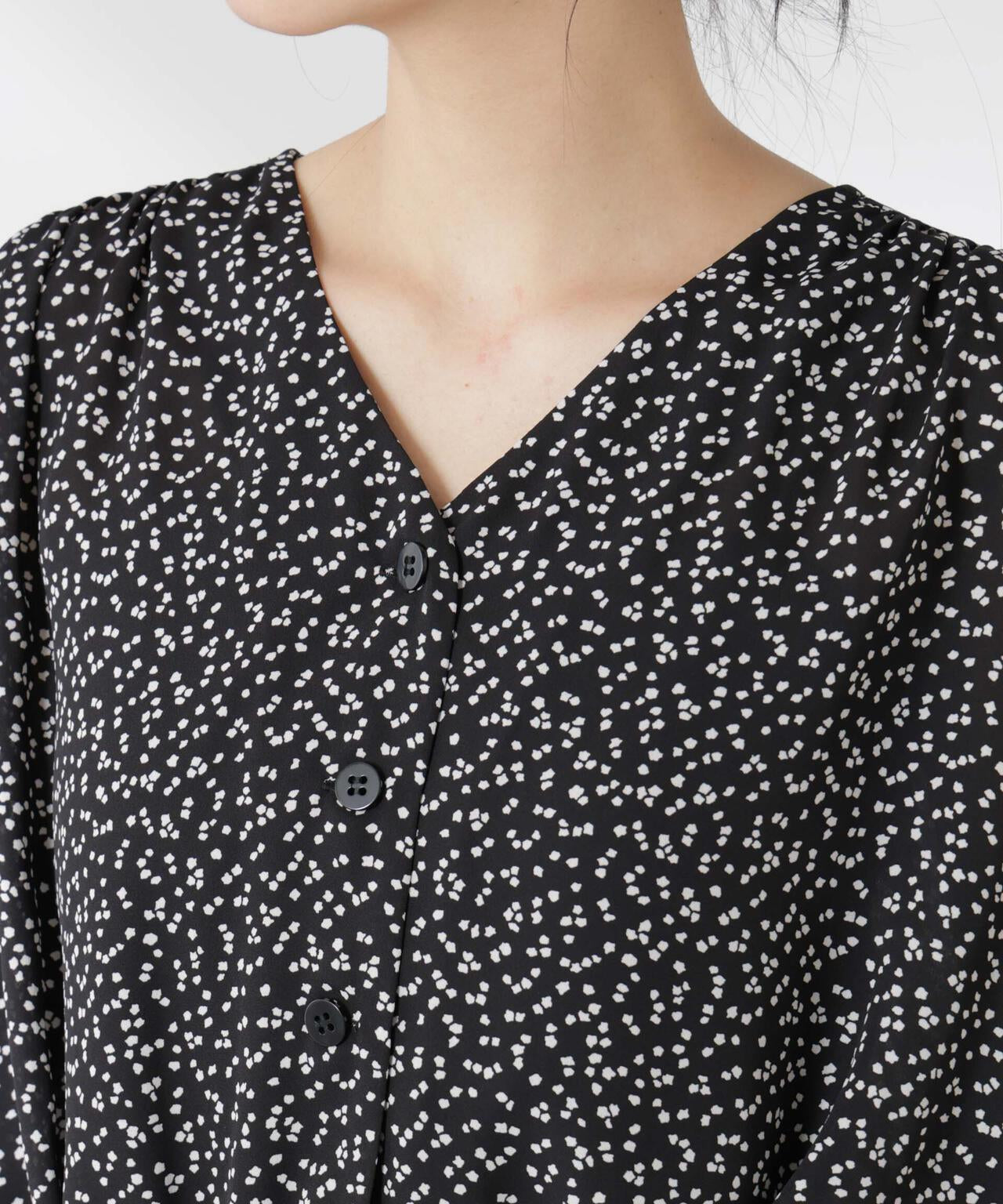 スクエアの細かな変形ランダムドット柄が目をひくVネックブラウス