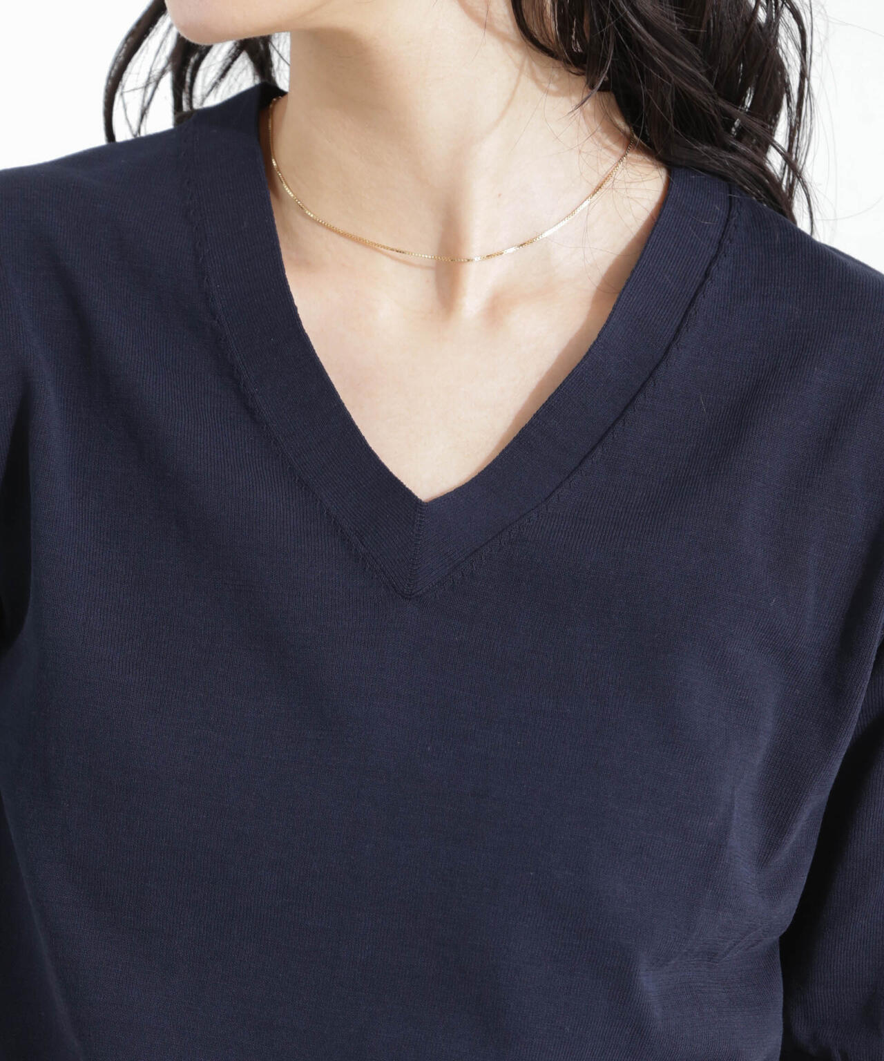 サマーニットTシャツとして重宝するVネックニット。エジプトの超長綿であるGIZAコットン(繊維が長い希少なコットン)を使用し、イタリア紡績会社M.T.B社が開発した特殊技術(TEKNICO 加工)にて加工した糸を使用した一着。カジュアル過ぎない素材感とデザインがONOFFで活躍してくれます。
