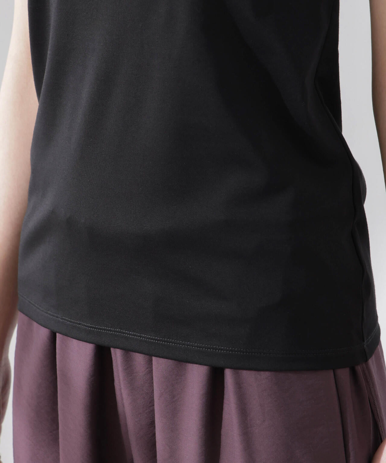 微光沢がキレイめな印象のストレッチポンチ素材のタンクトップ。楽な着心地が嬉しいカップ付きで、肩部分をあえて細めに女性らしいカッティングで仕上げた一着です。