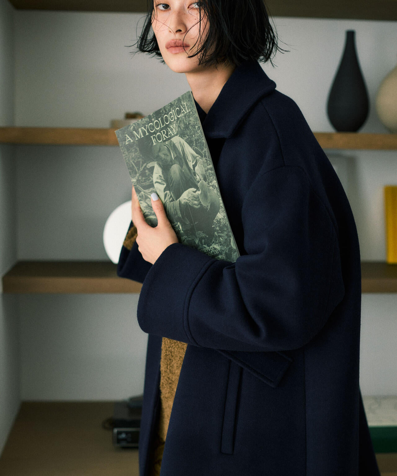 上品なミニマルデザインのステンカラーコート。しっかりとした肉感がありながらも軽やかに羽織れるため、11月の気温変化が大きい時期に活躍するアイテム。表面は滑らかなタッチで、ふくらみとハリを兼ね備えた上品な風合いの一着です。