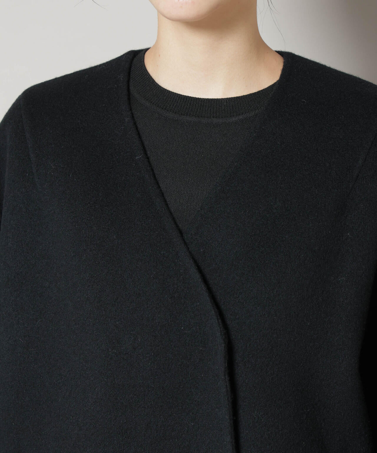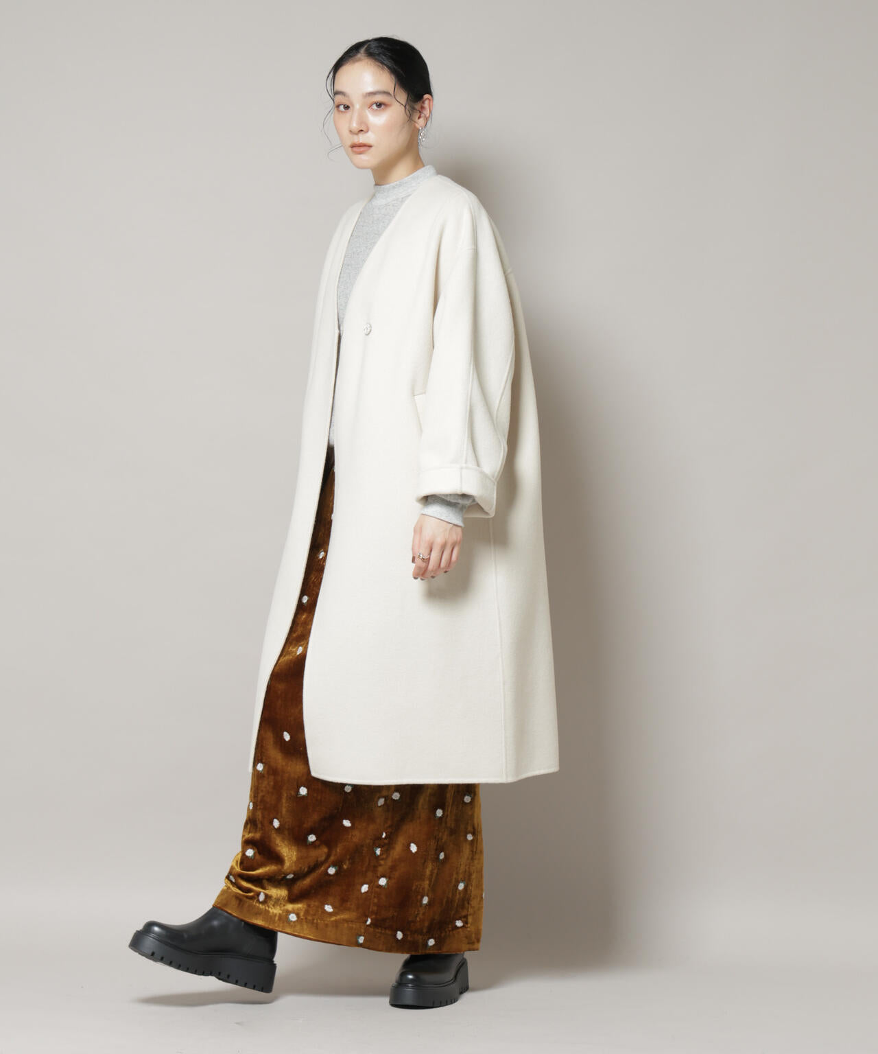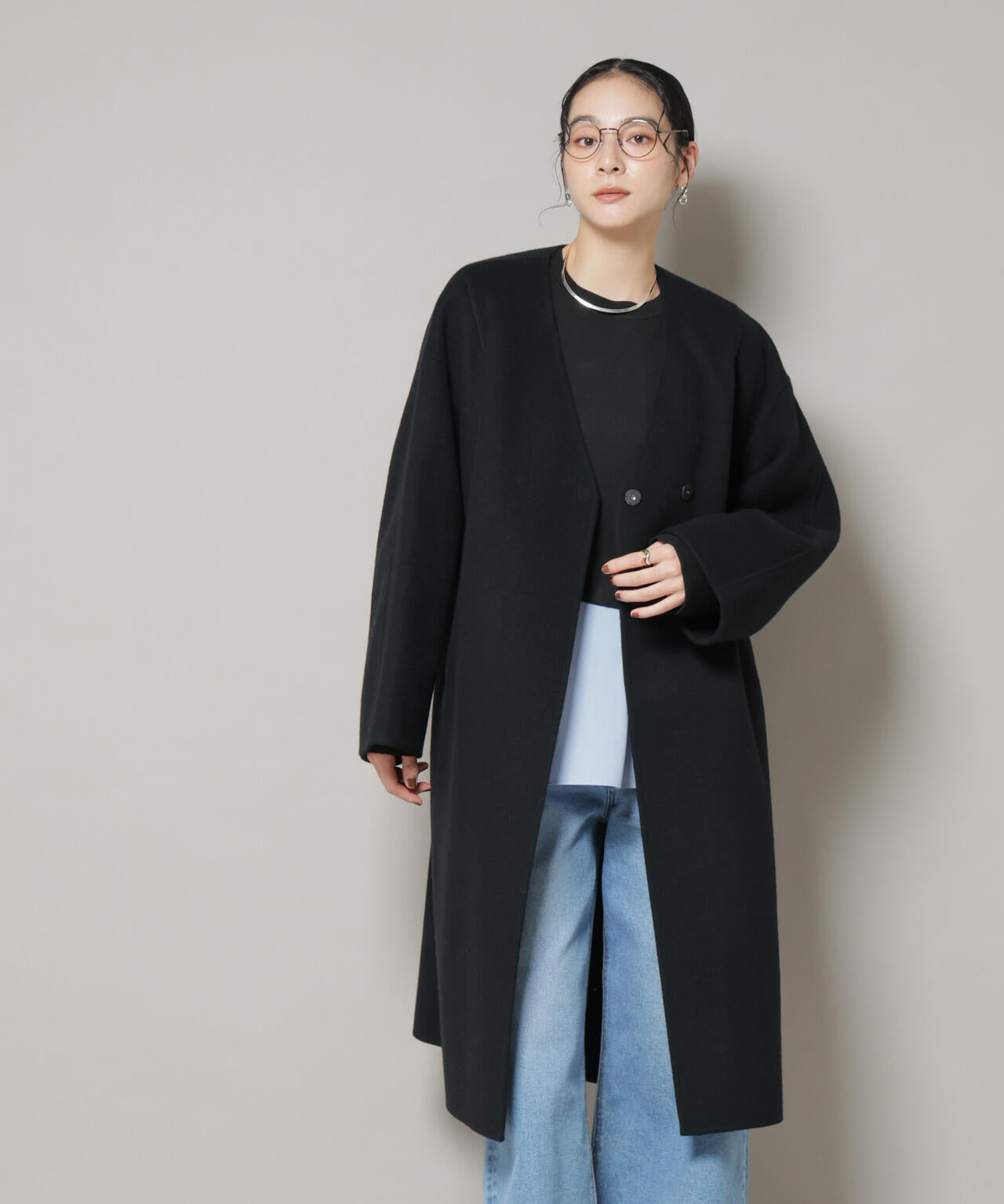 上質なリバー素材を使用した、ノーカラーのロングコート