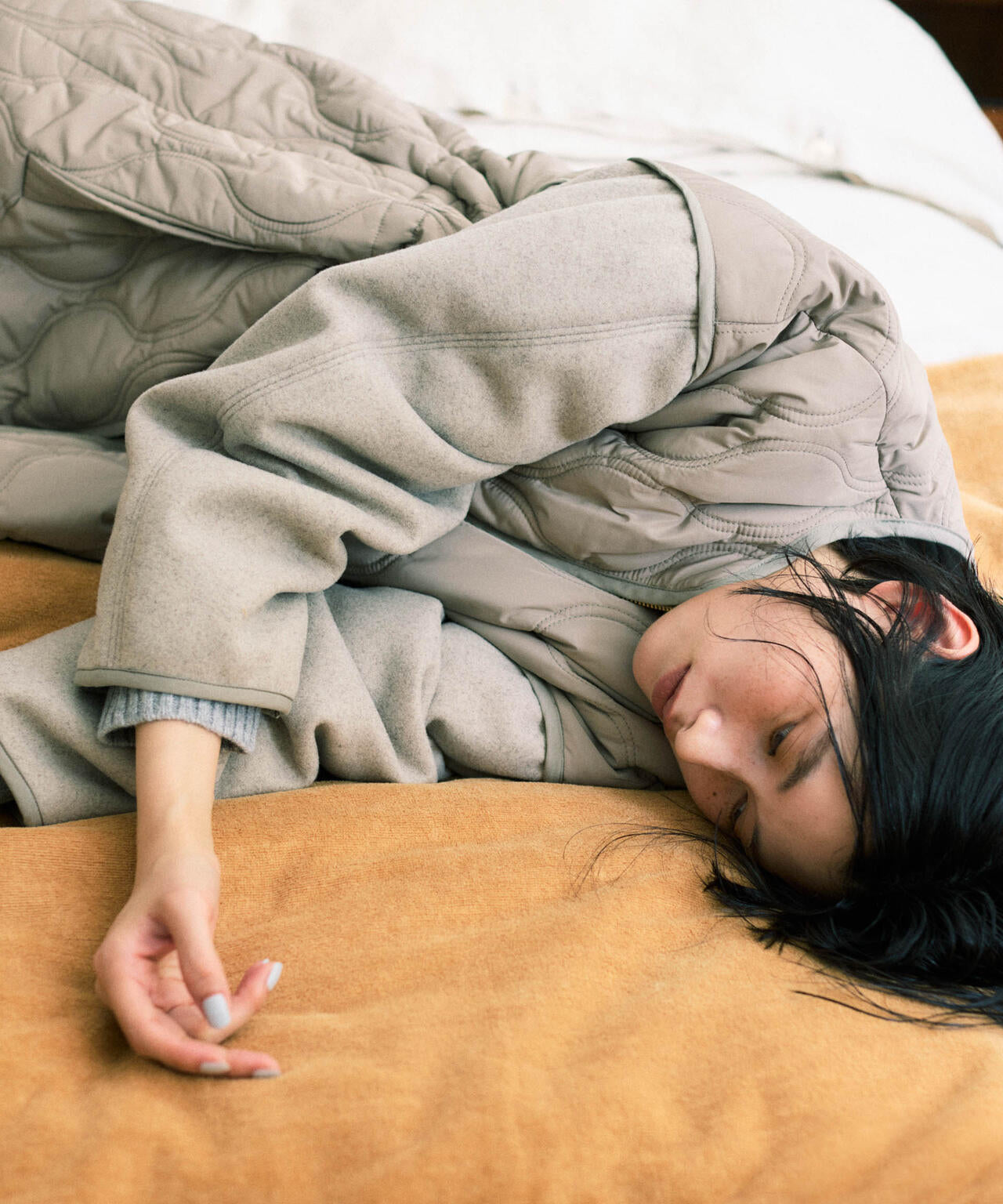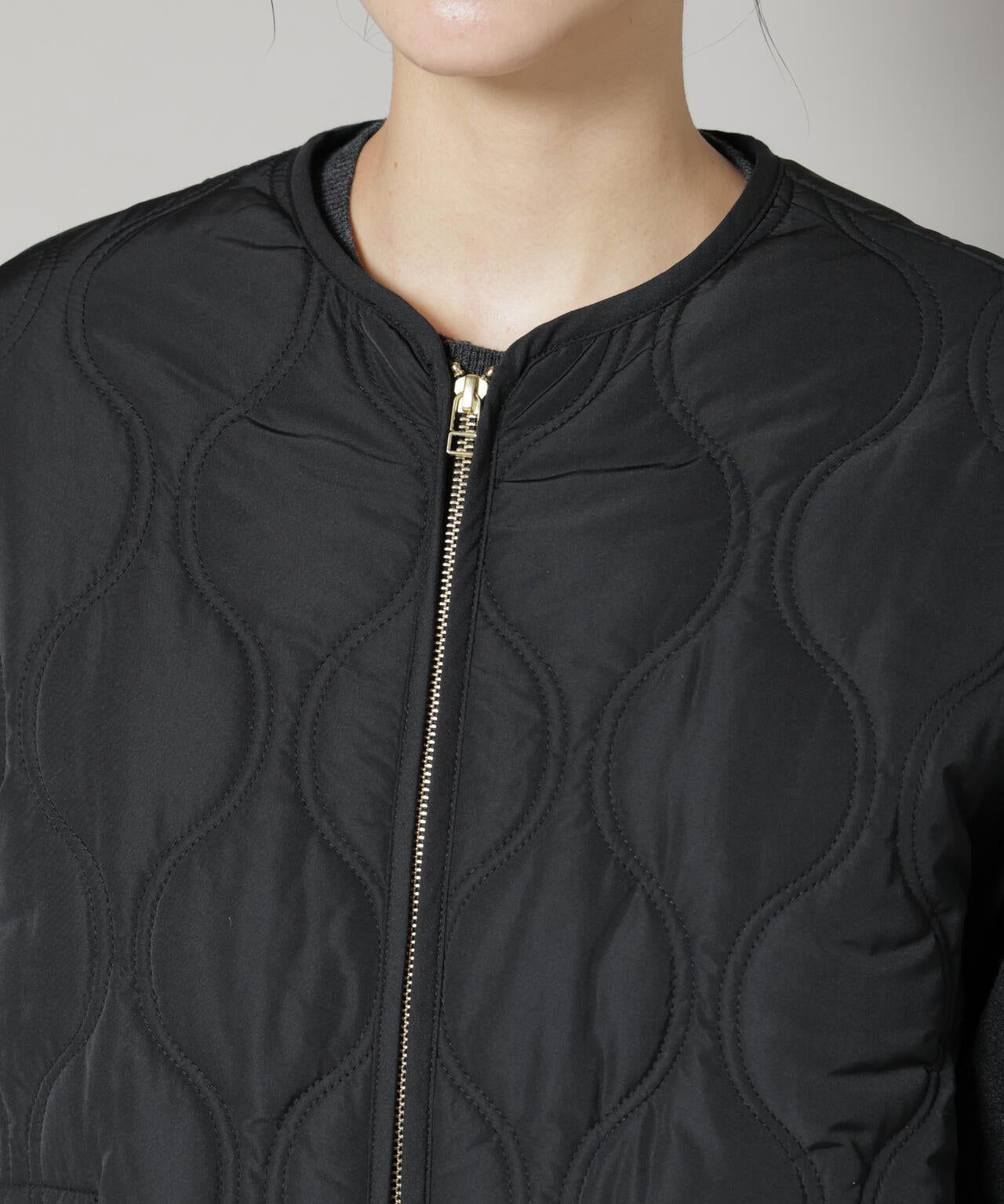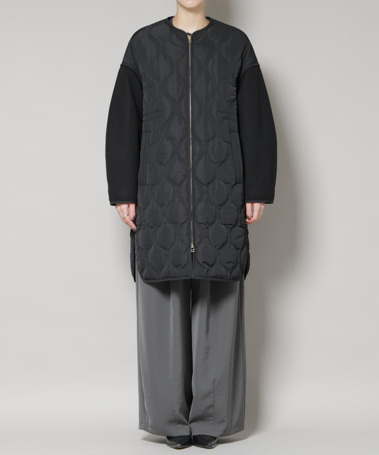 異素材コンビがポイントのカジュアル中綿キルティングコート。異素材の組み合わせによって単調になりがちなキルティングコートにワンテクニックをプラスし、カジュアルながらも洗練されたデザインに仕上げた一着です。