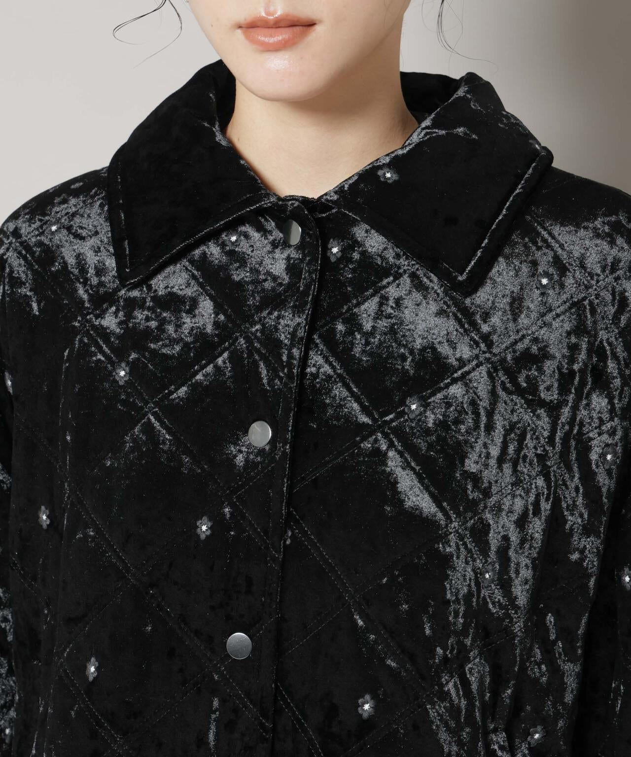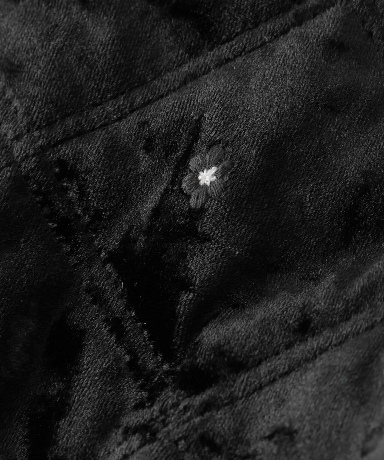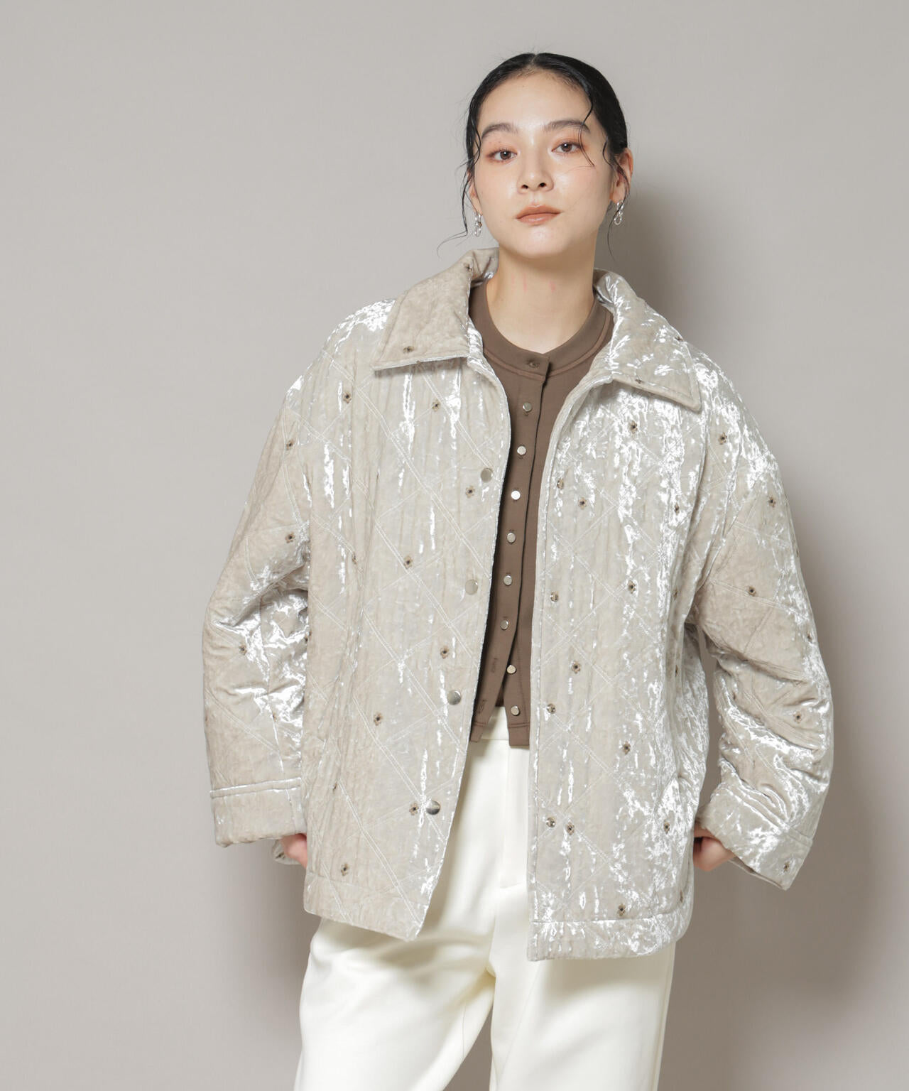 刺繍ベロアキルト生地を使用した、見る角度で表情が変わり奥行きのあるブルゾン。程よい厚みと柔らかさを兼ね備えた素材感で、秋冬のスタイリングにぬくもりと存在感をプラスしてくれる一着です。