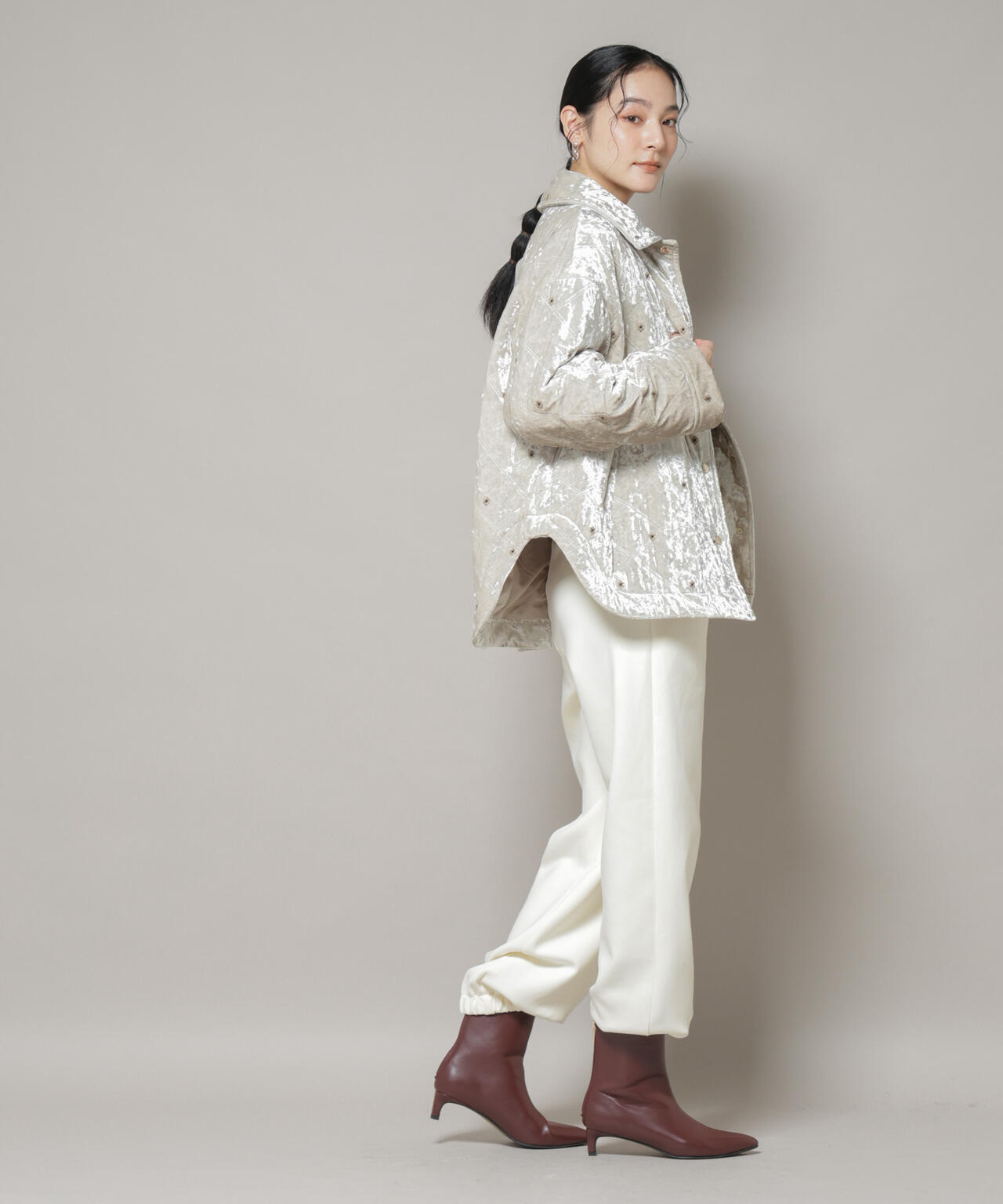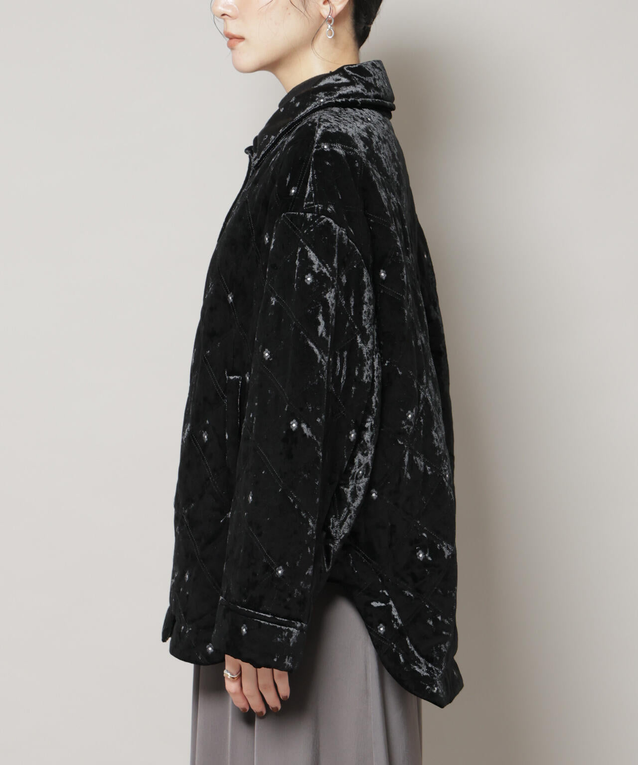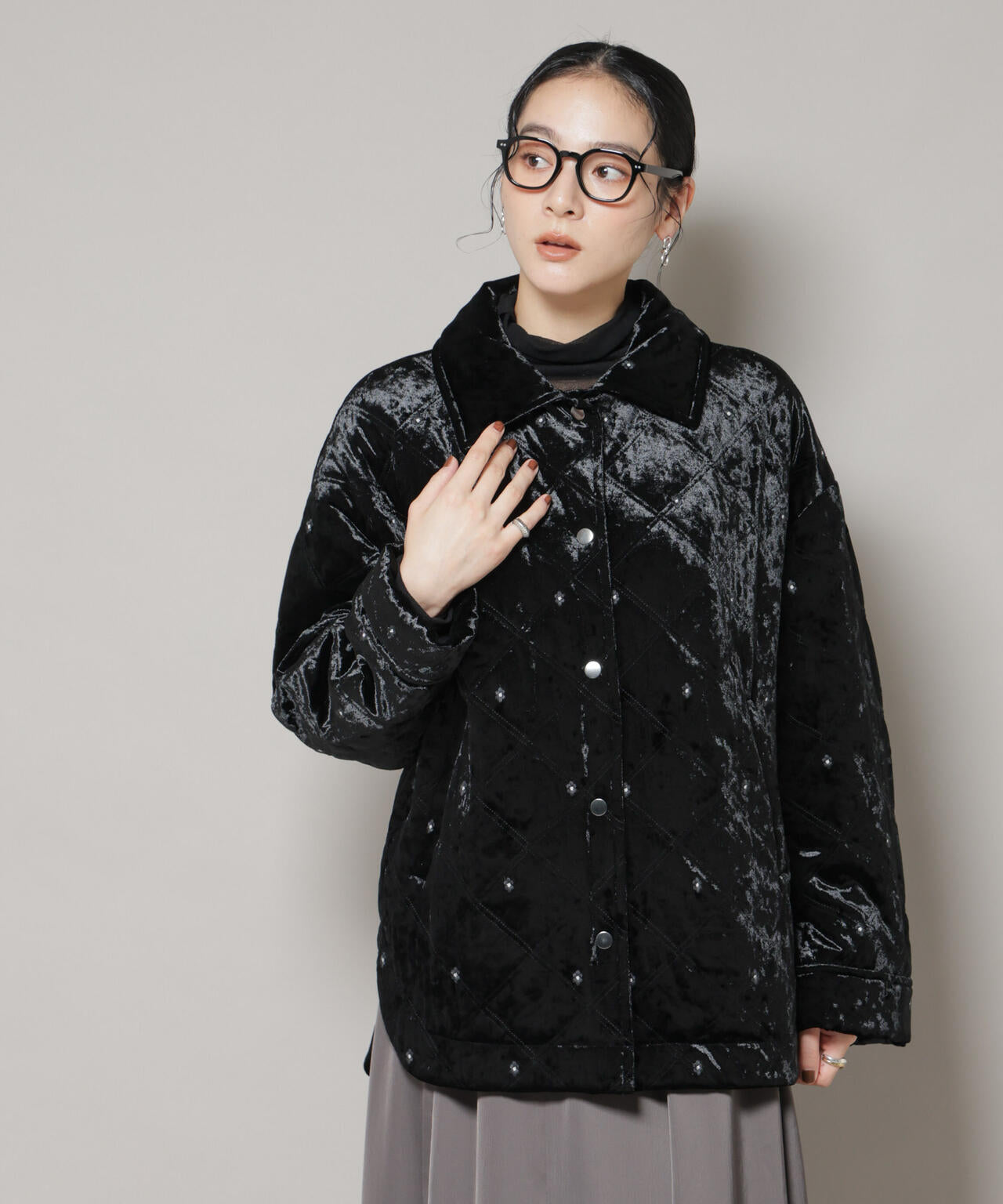 刺繍ベロアキルト生地を使用した、見る角度で表情が変わり奥行きのあるブルゾン。程よい厚みと柔らかさを兼ね備えた素材感で、秋冬のスタイリングにぬくもりと存在感をプラスしてくれる一着です。