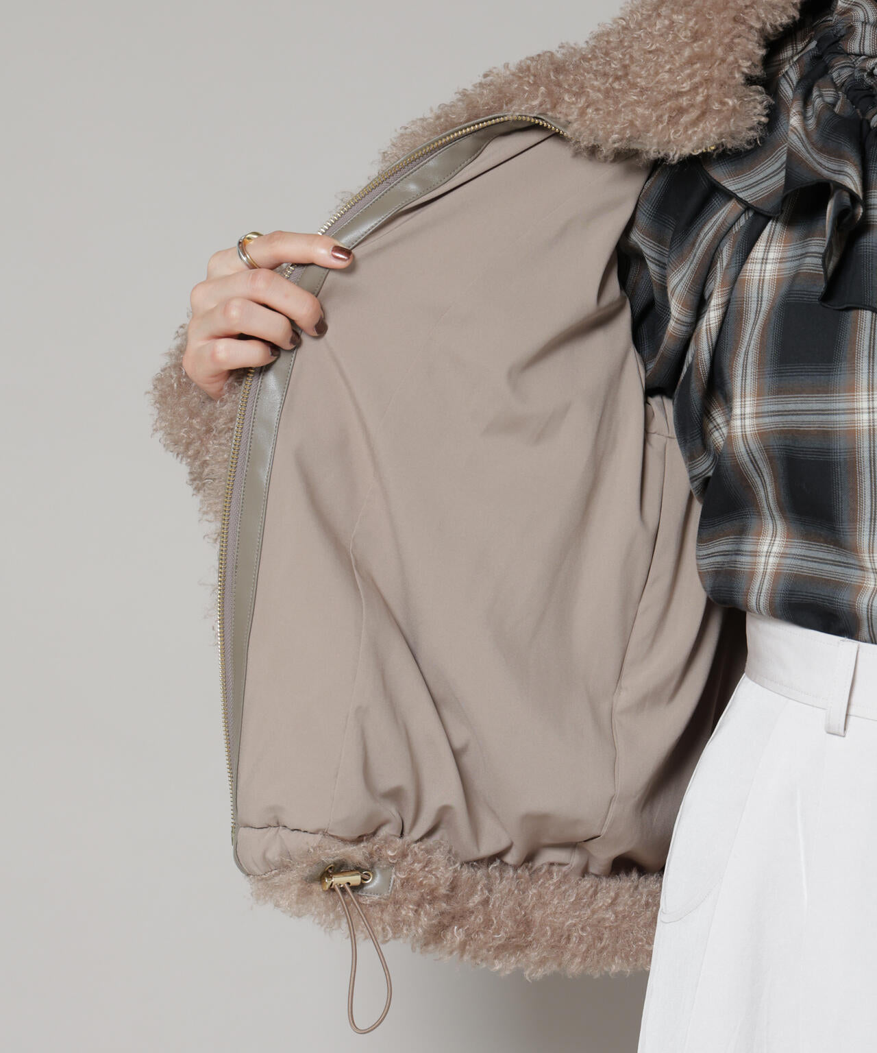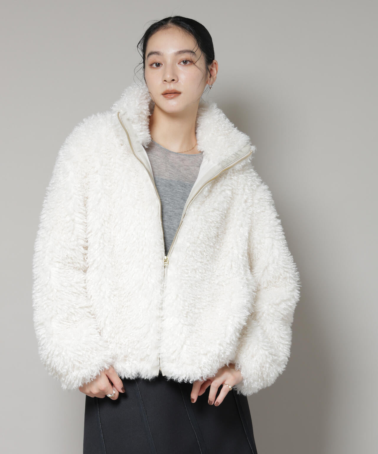 ・存在感あるボアタイプのファー素材で仕立てたブルゾンアウター