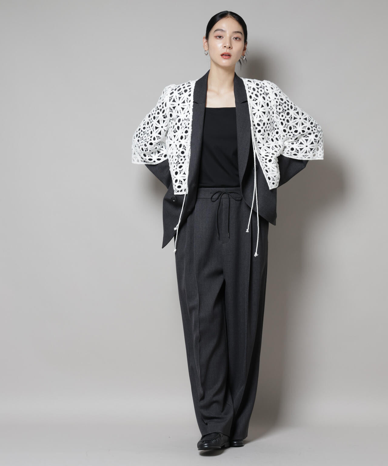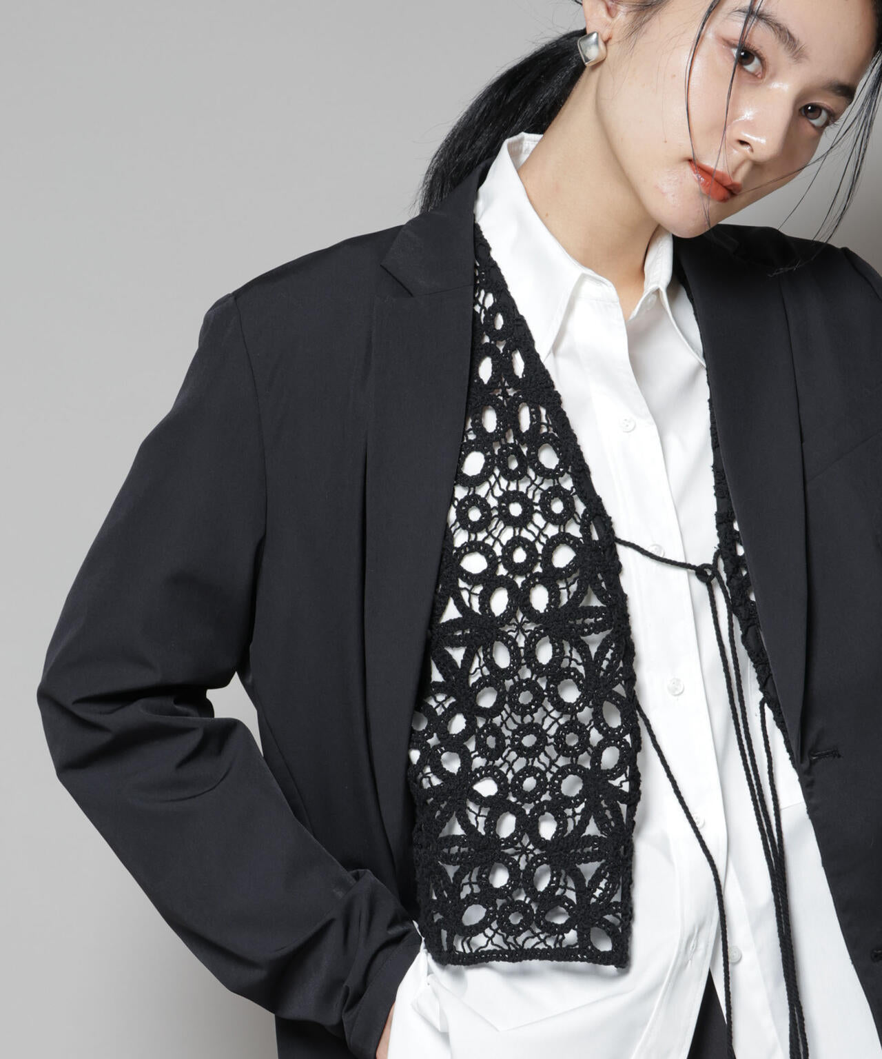 今季らしいBOHOムードを感じさせるコードレースジャケット。シャツにレイヤードしたり、ジャケットの上からボレロのように羽織ったり、そのままカーディガン使いしたりと、着こなしのバリエーションが広がる一着です。