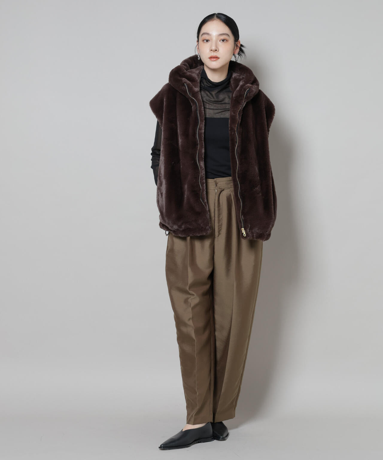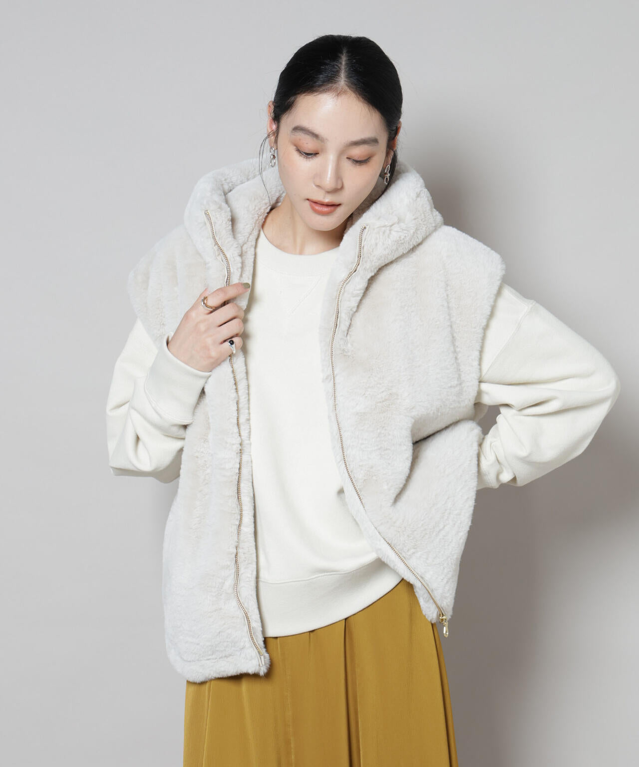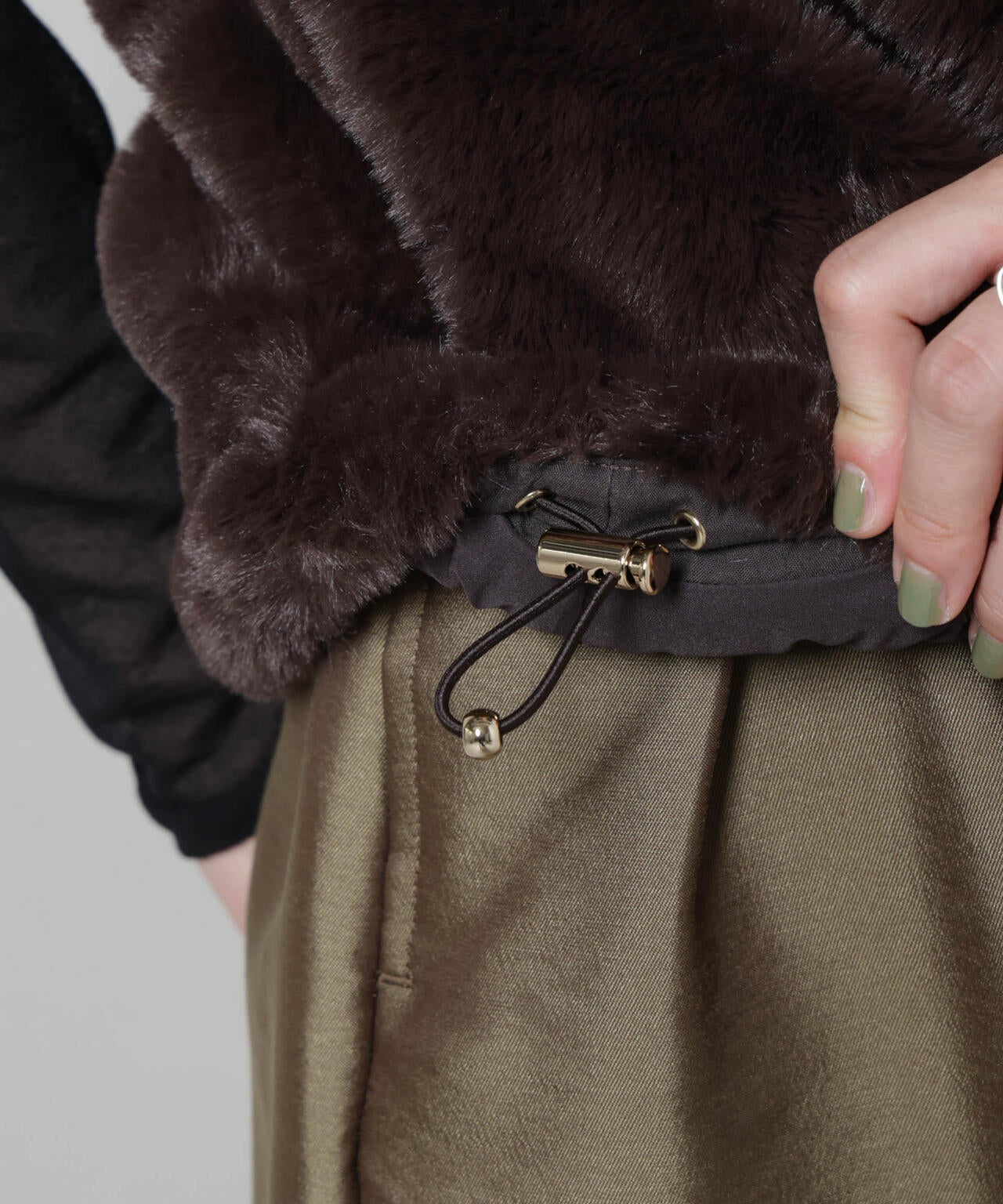 ・トレンド感のあるスタイルが完成するフェイクファーベスト