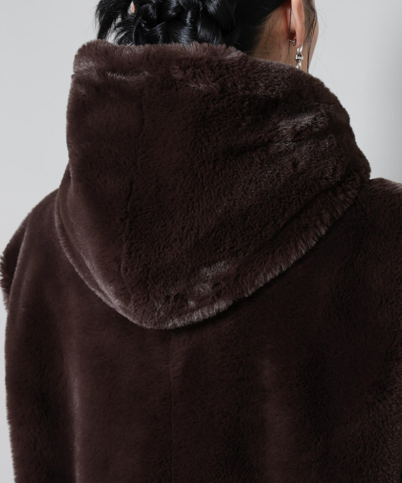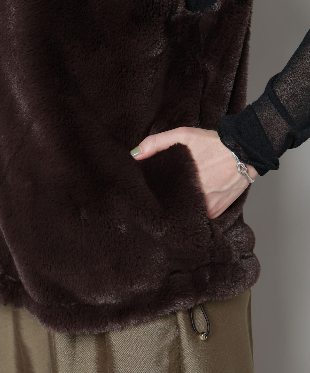 高密度の滑らかなフェイクファーを使用したフードベスト。とても柔らかく落ち感があり、しっとりとした肌触りで思わず触れたくなるような質感が特徴の一品。中綿やライナーがなくても十分に暖かく、初秋のレイヤードアイテムとして重宝してくれます!