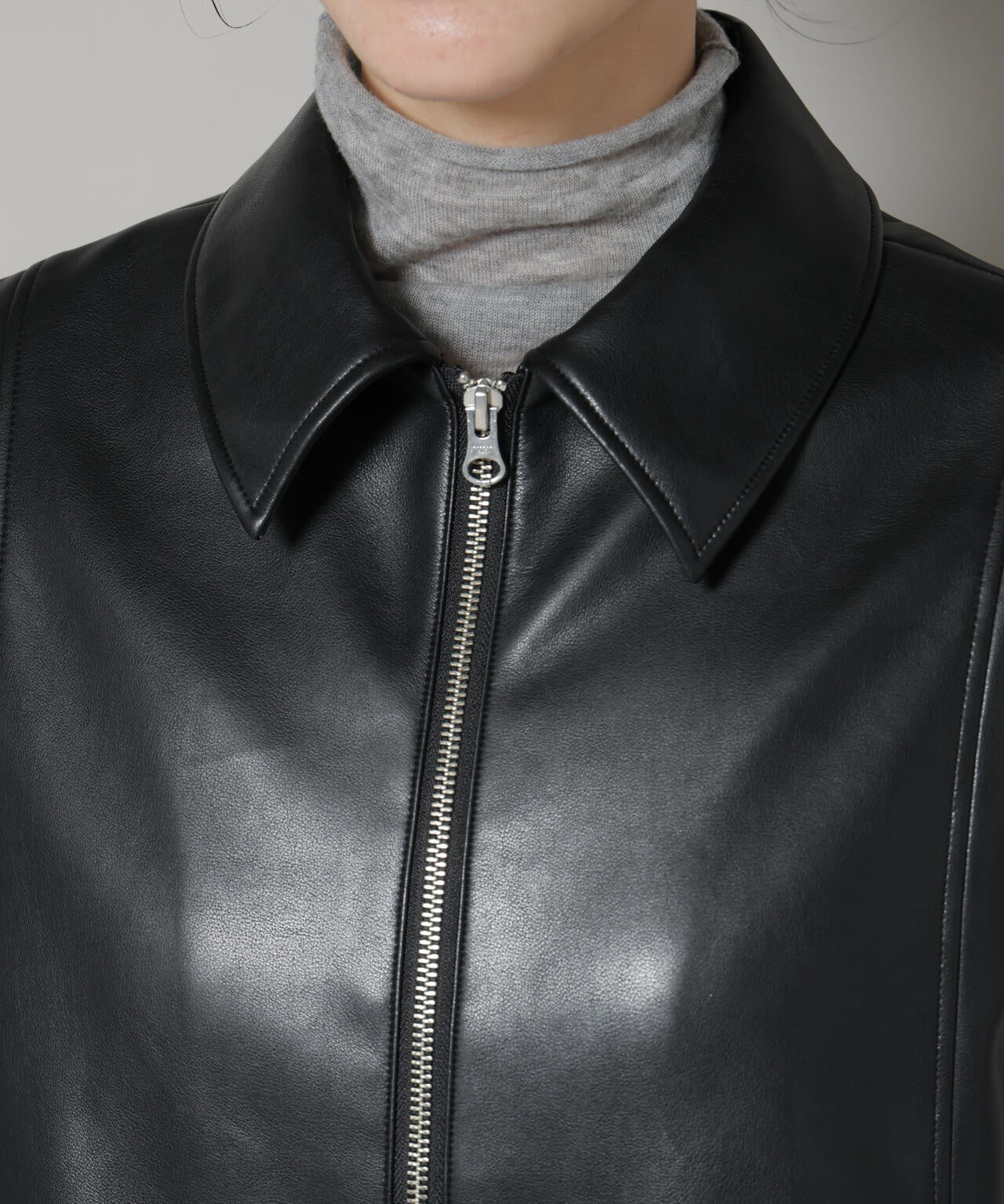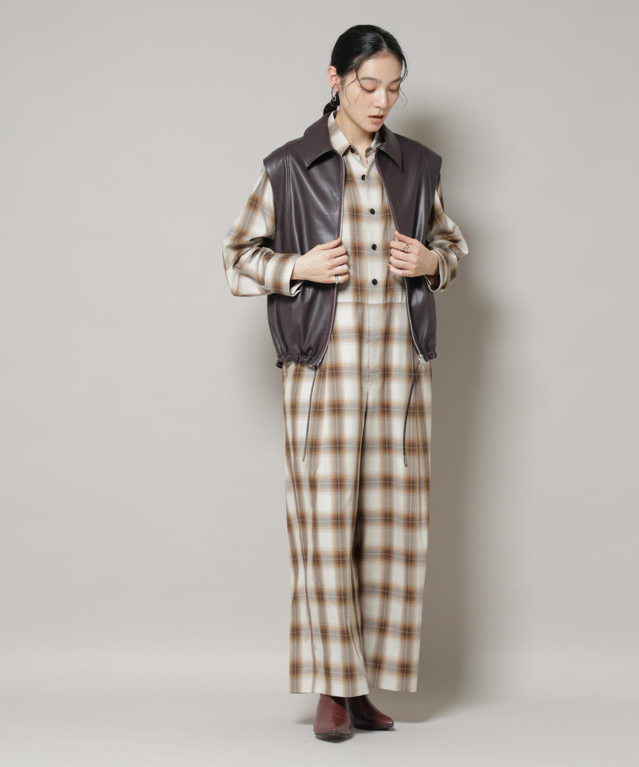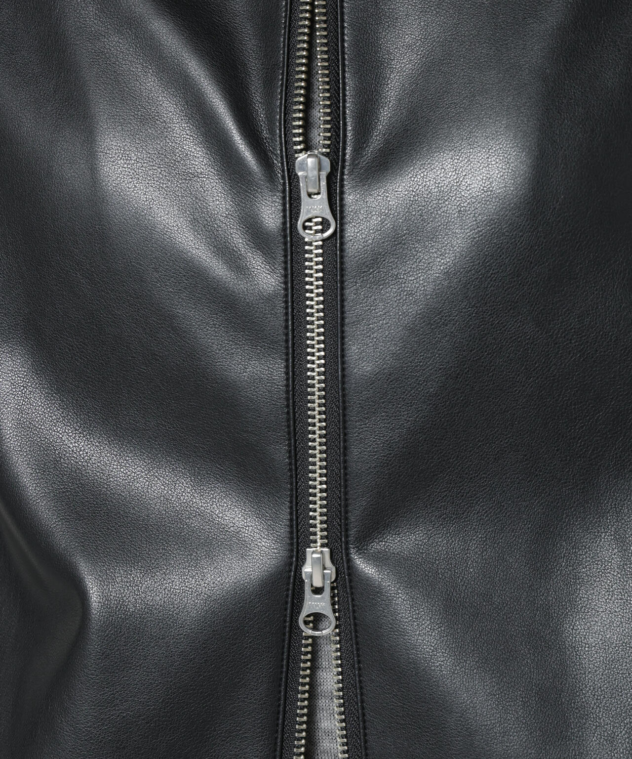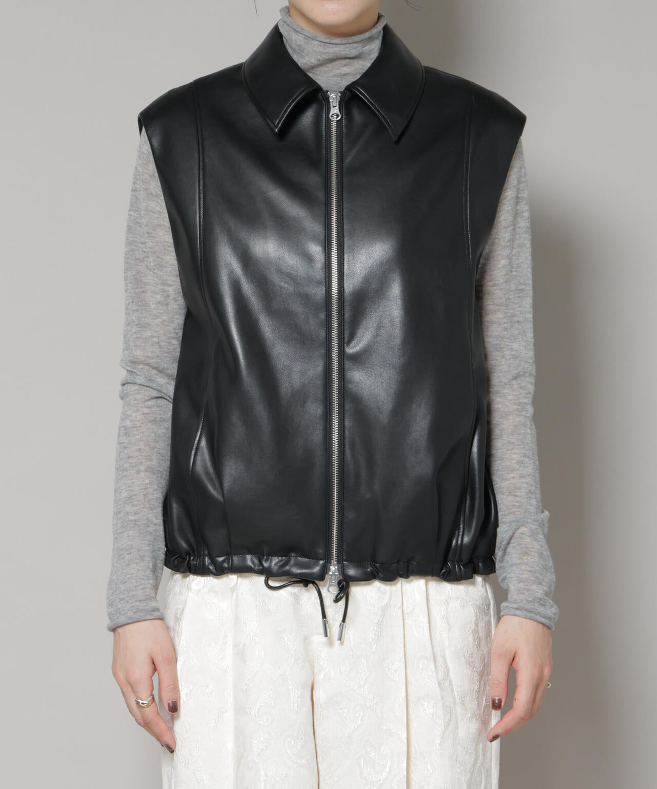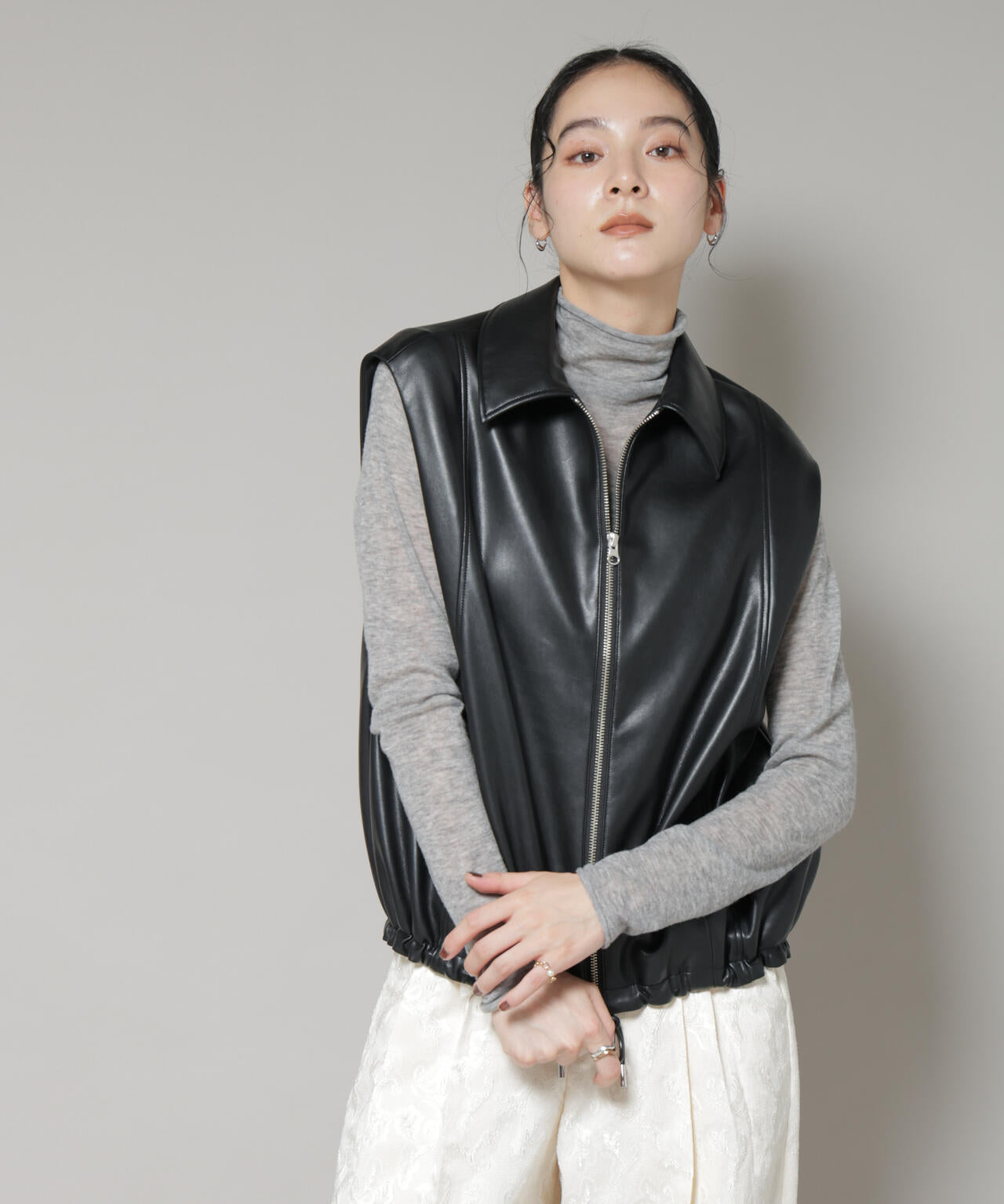 スタイリングの主役になる、存在感抜群のフェイクレザーベスト。上品なフェイクレザーの生地感と衿付きのきちんと感に、フロントは金属ファスナーでカジュアル感をプラス。逆開ファスナーなので、上下の開けるバランスはアレンジ自在です。