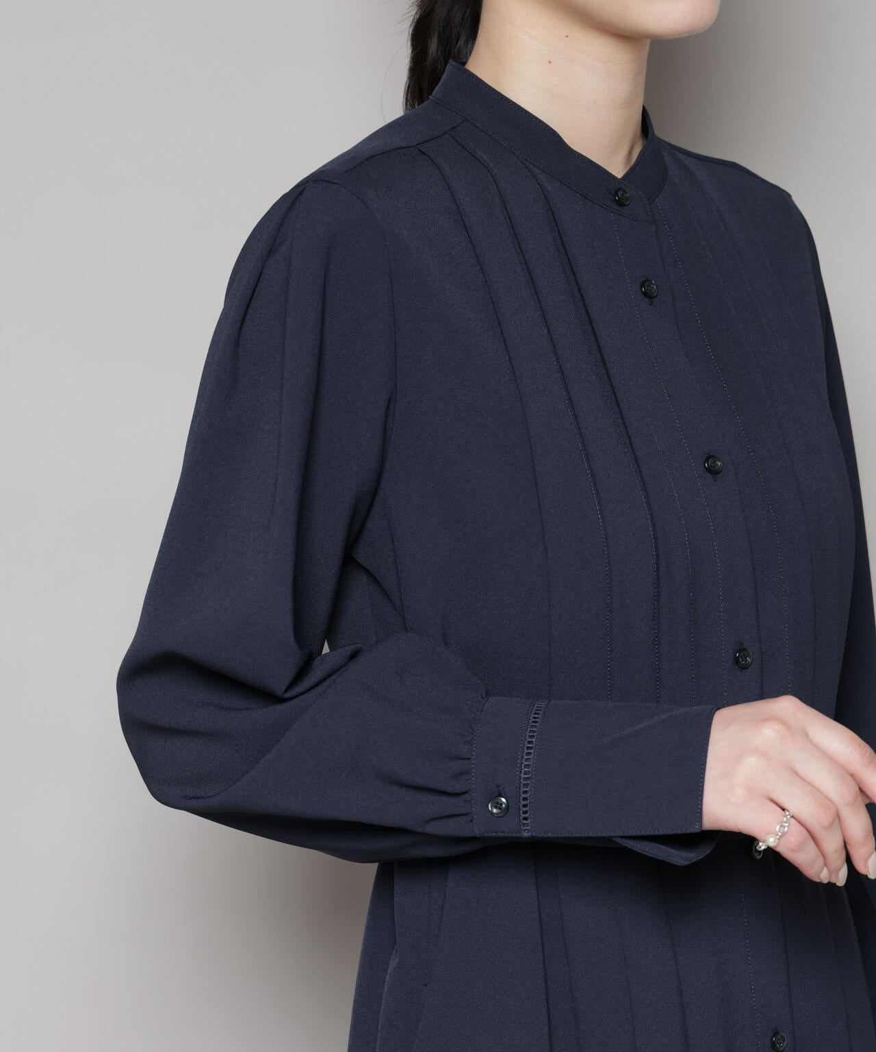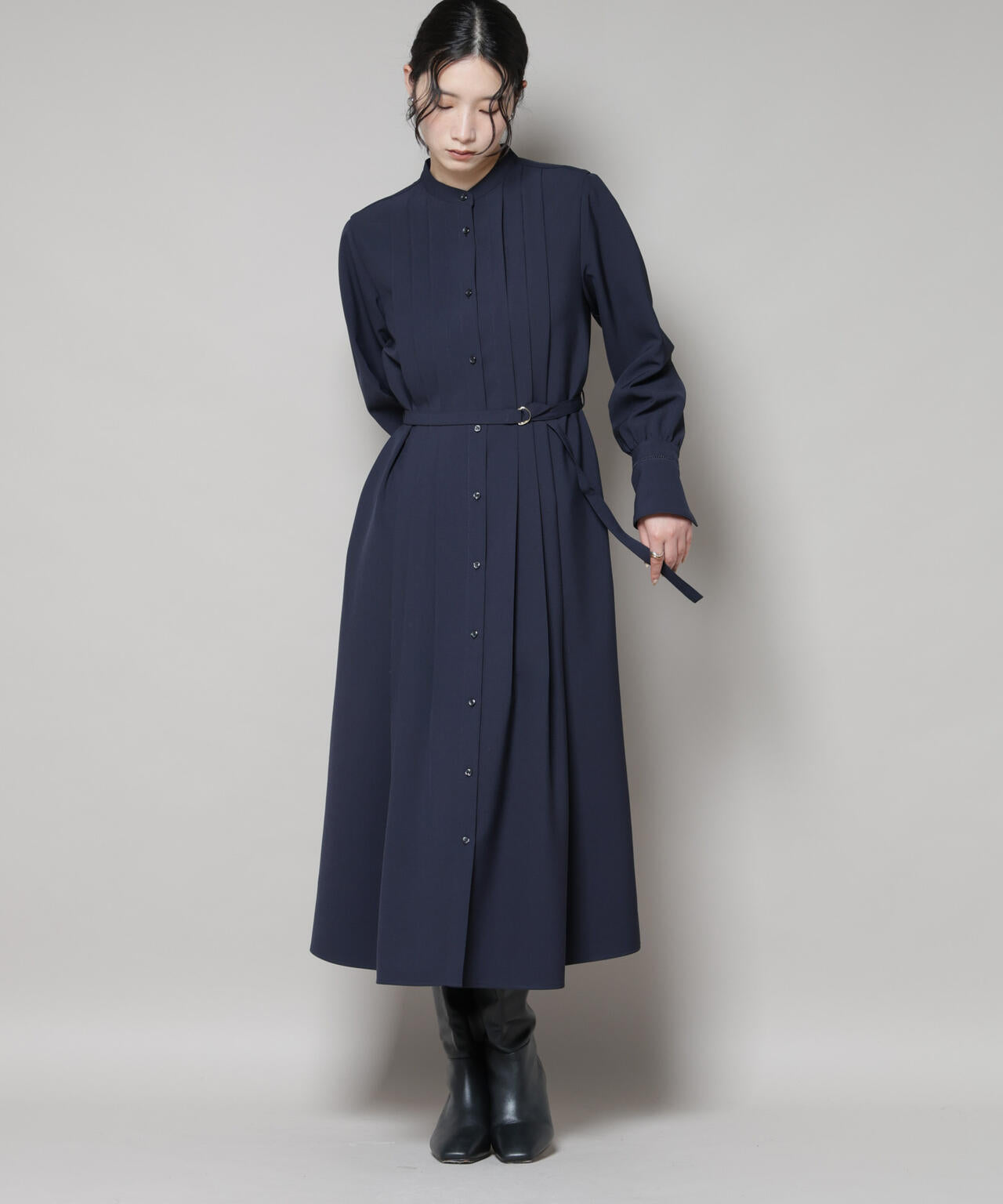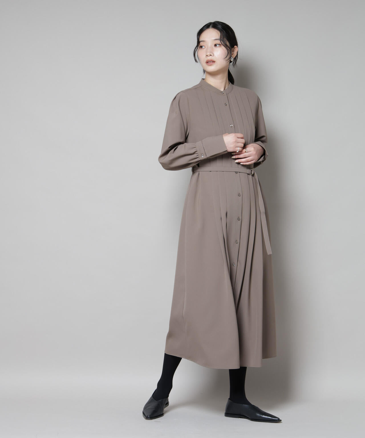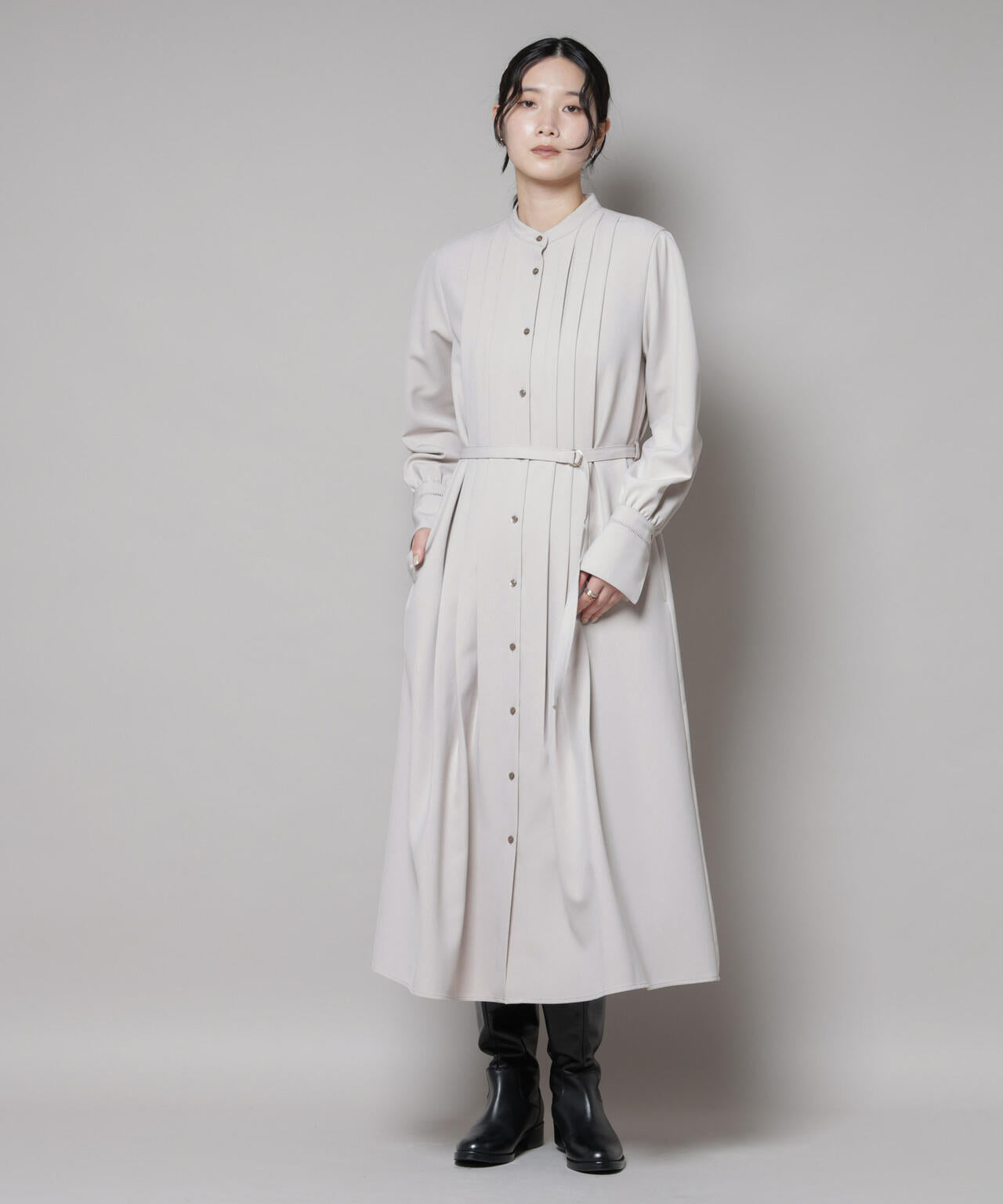 ロングシーズン着やすいきれいめで肉厚なポリエステルダブルクロス素材で仕立てたロングワンピース。フロントに並んだタックはウエスト付近まで中縫いを入れすっきり綺麗に見えるシルエットに。付属のベルトをウエストマークでスタイルアップした女性らしい着こなしから、ベルトを外してモダンな印象のスタイリングまで幅広く魅せれる一着です。