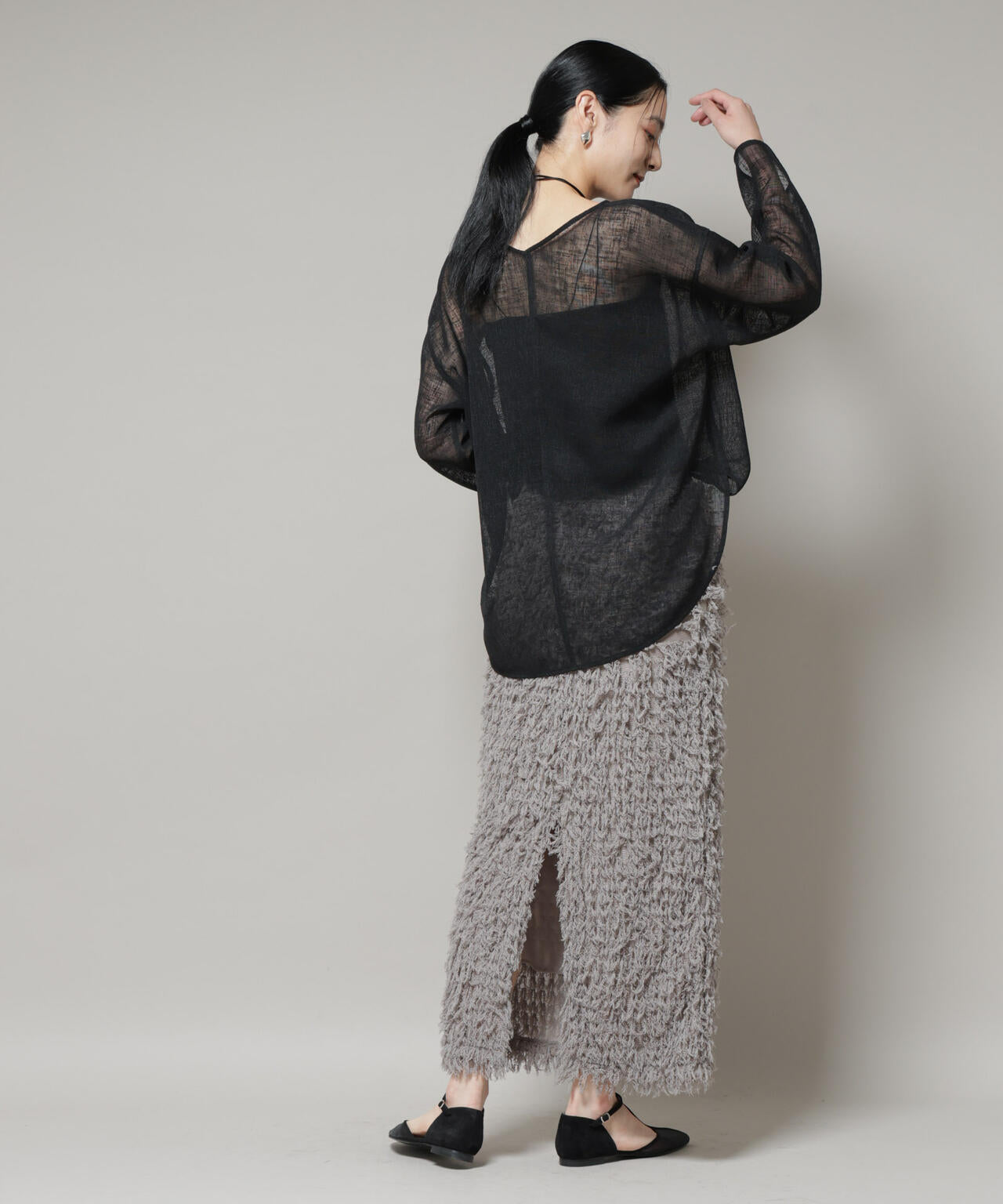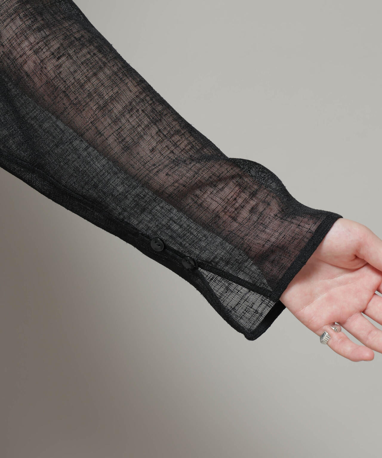 ゆるっとしたオーバーサイズが大人っぽい抜け感のあるメッシュブラウス。あえてノーカフスで軽くすっきりとした袖のデザインに、スリットと釦でさり気ないポイントをプラスした一着。さらっとしたドライタッチな質感で、長袖ながら夏でも着やすく涼感のあるデザインです。