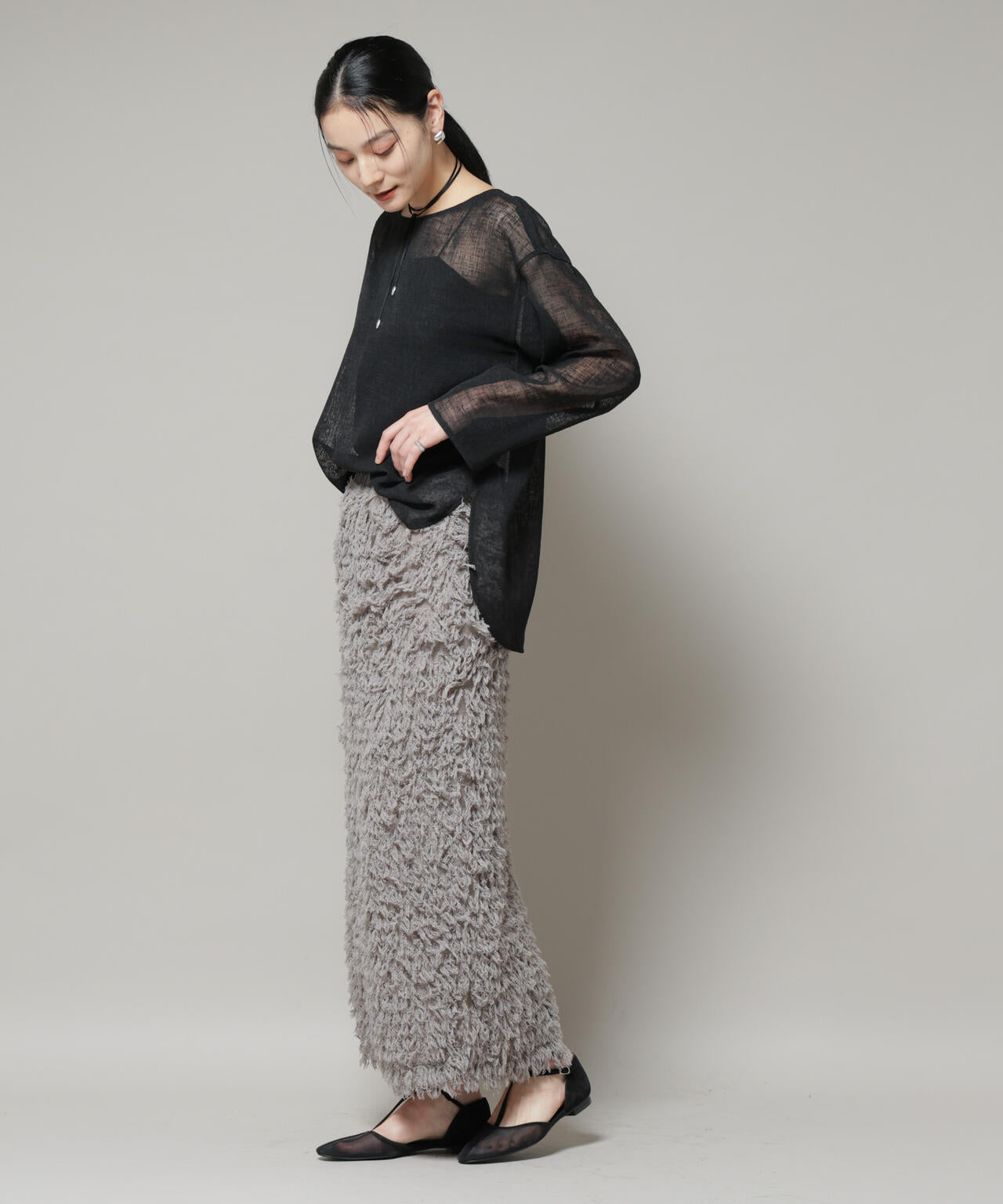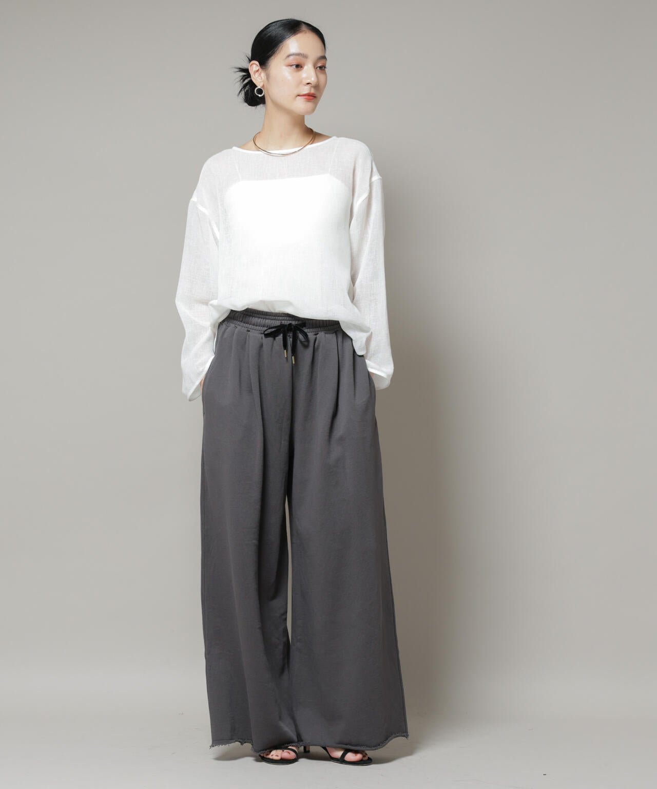 ・ワイドパンツやフレアスカート等、ボトムスに合わせ裾をインアウトした着こなしの変化を楽しめる一着