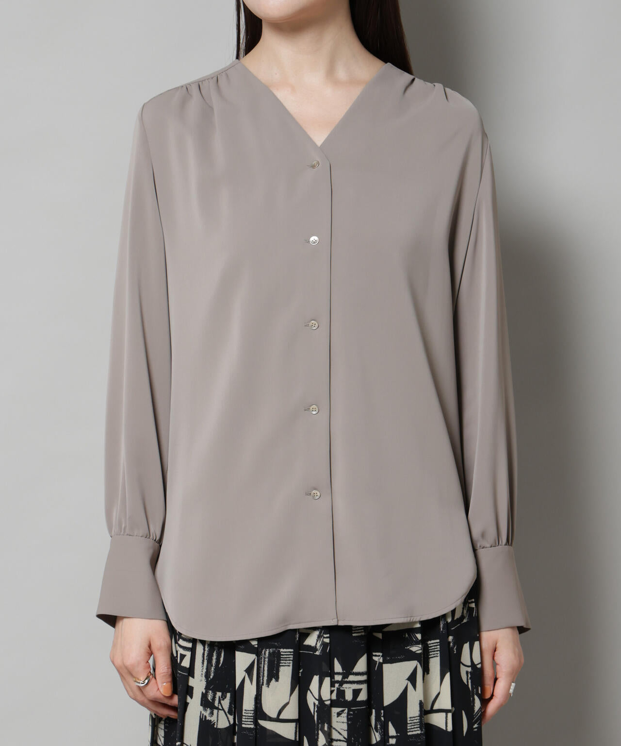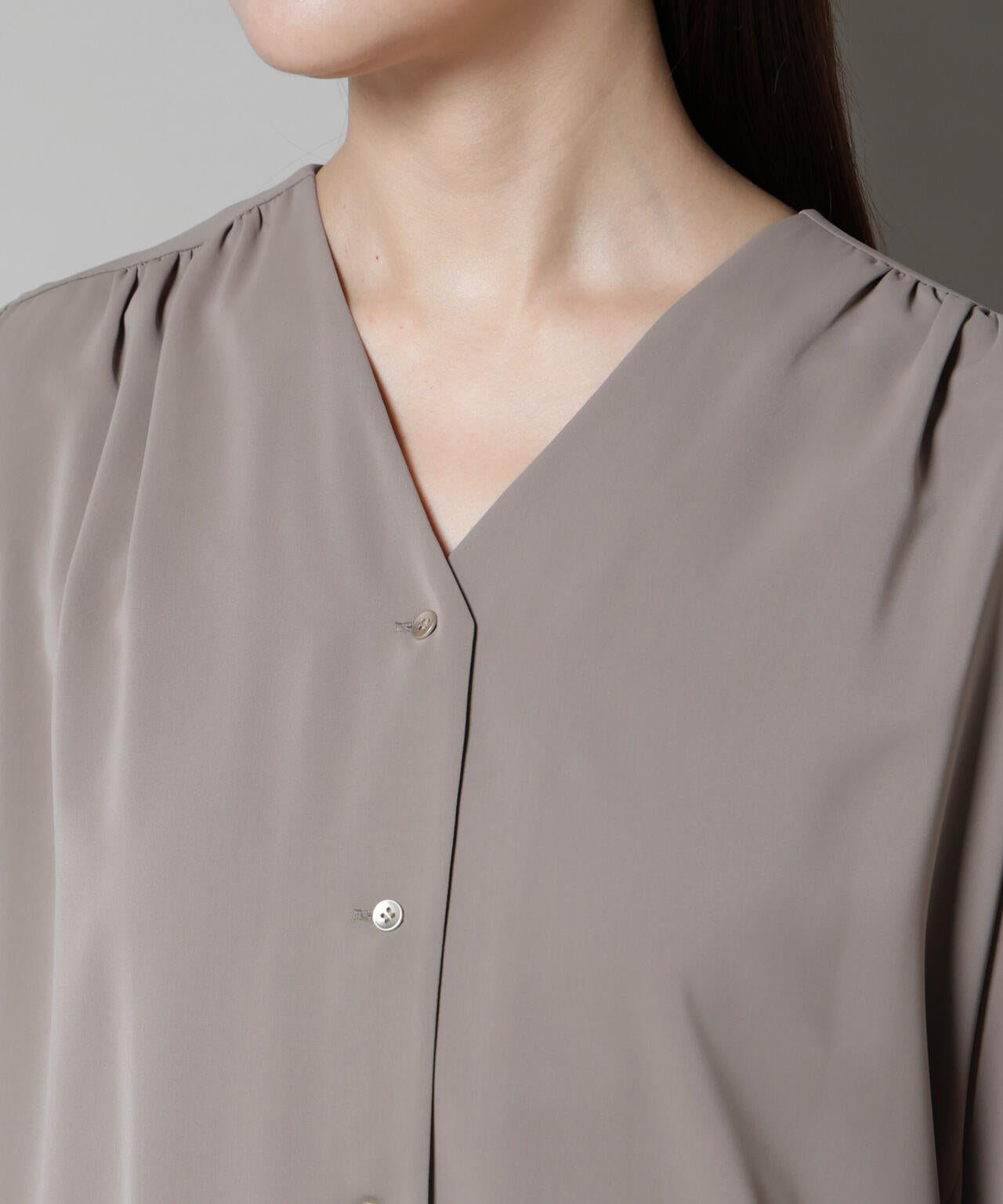 オンオフで活躍してくれる毎シーズン人気のVネックブラウス。首元を綺麗に見せる普遍的なVネックラインの衿ぐりで、使い勝手の良いシンプルなデザインが魅力。さりげなくポイントになる小さめのゴールドボタンが上品さを演出。きちんと感がありながらも硬くなりすぎず女性らしい印象で着て頂ける一着です。