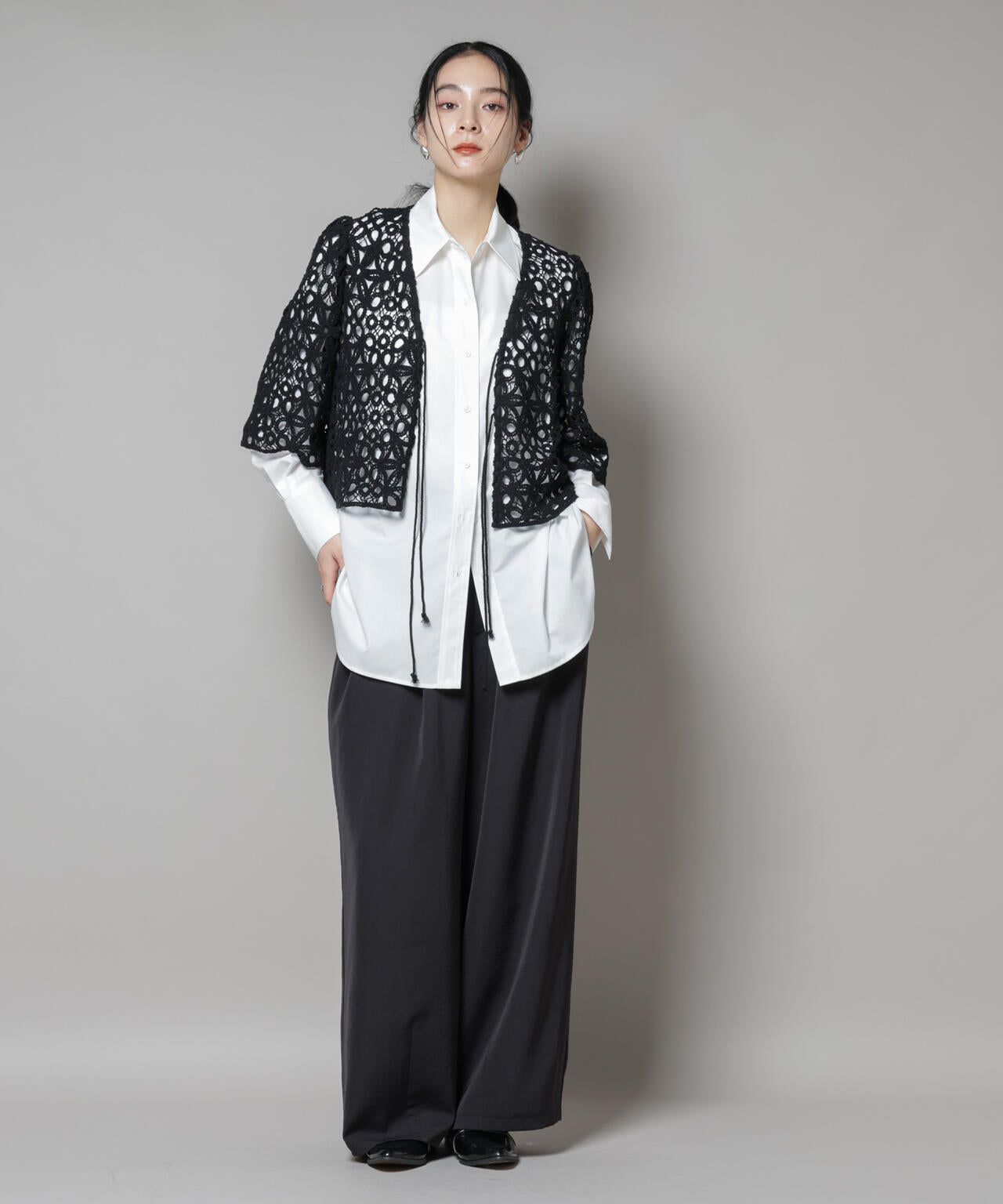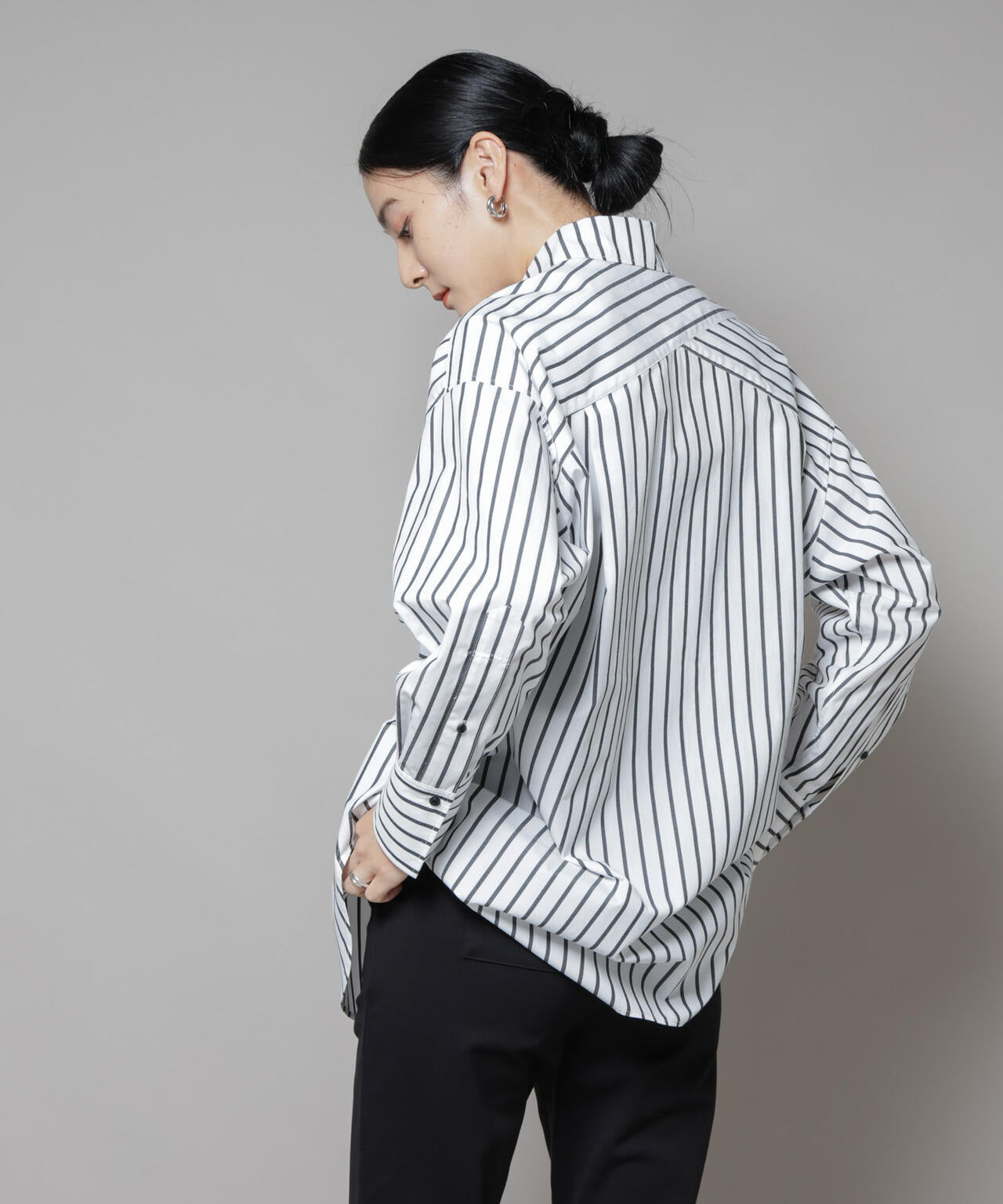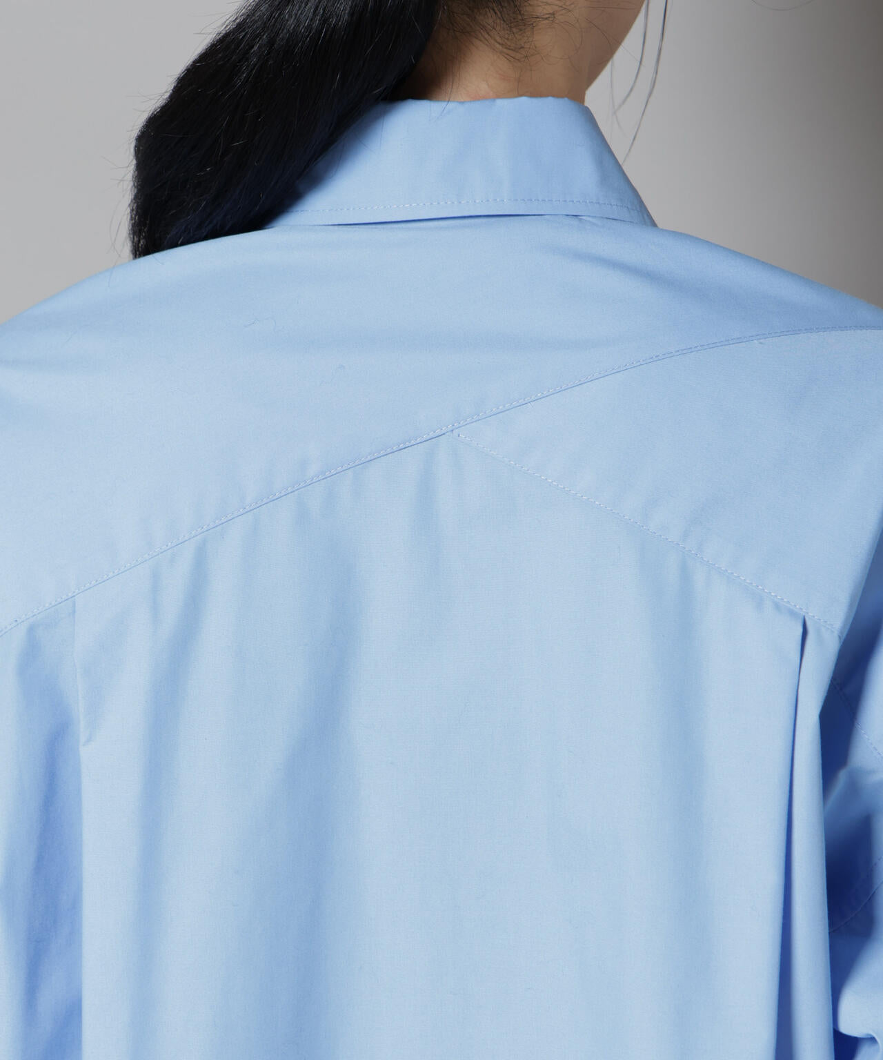 背中ヨークのバッククロスデザインがさりげなくモードな雰囲気を醸すオーバーシャツ。大きすぎないサイジングに拘っているので、羽織としての着こなしはもちろん、上からビスチェやキャミワンピを合わせてレイヤードスタイルも楽しめます。