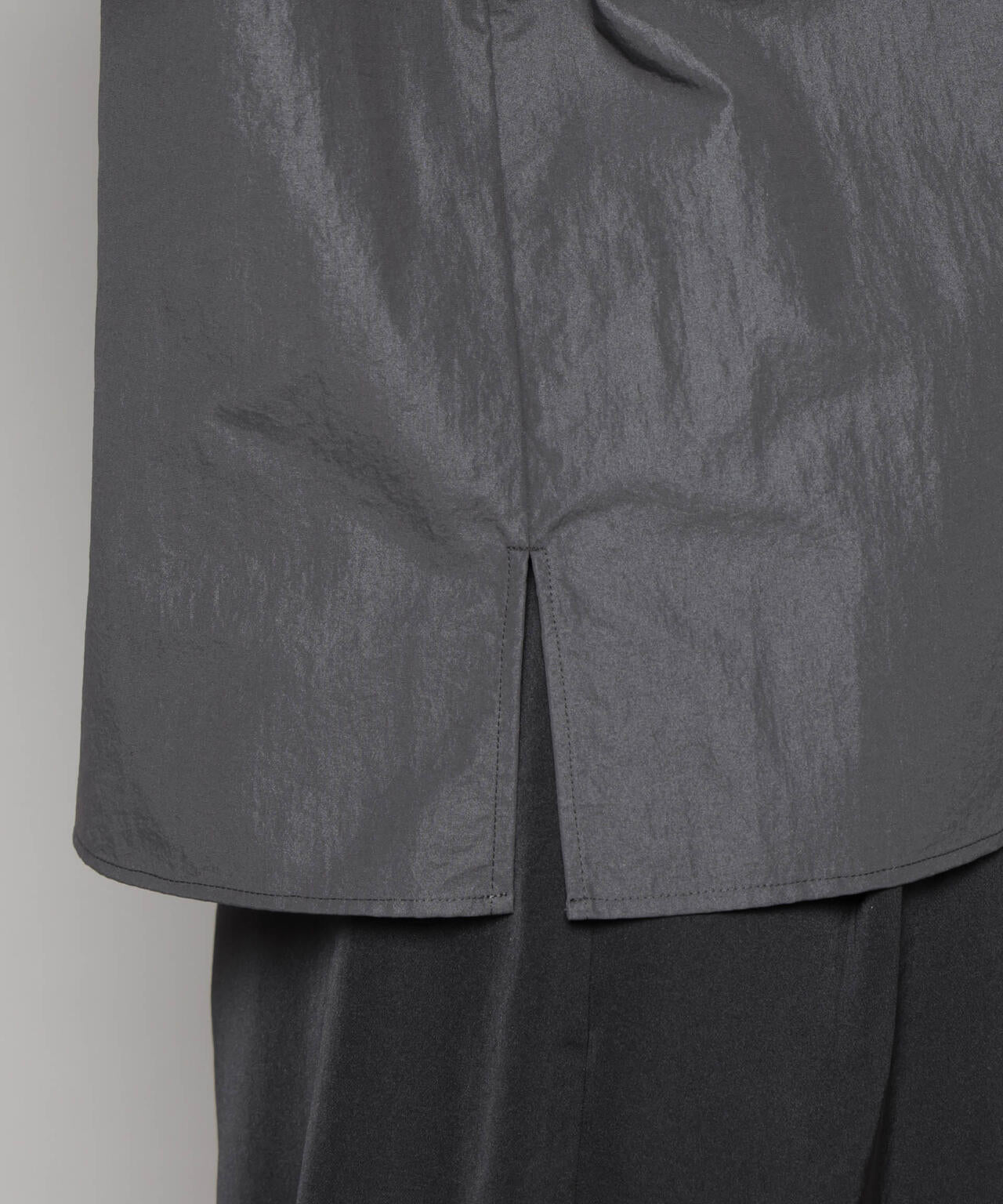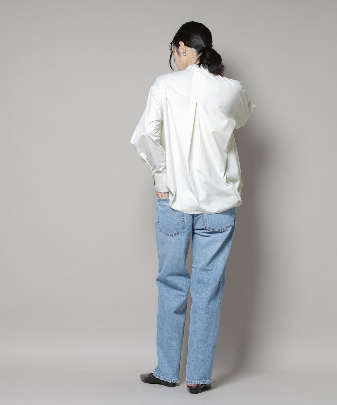 チンツ加工による艶とハリ感で存在感が際立つボウタイシャツ。デニムやサロペットなどカジュアルなアイテムと合わせた際にも、艶見えする表面感が大人カジュアルな印象に仕上げてくれるので、ワンランク上のスタイリングが完成します。