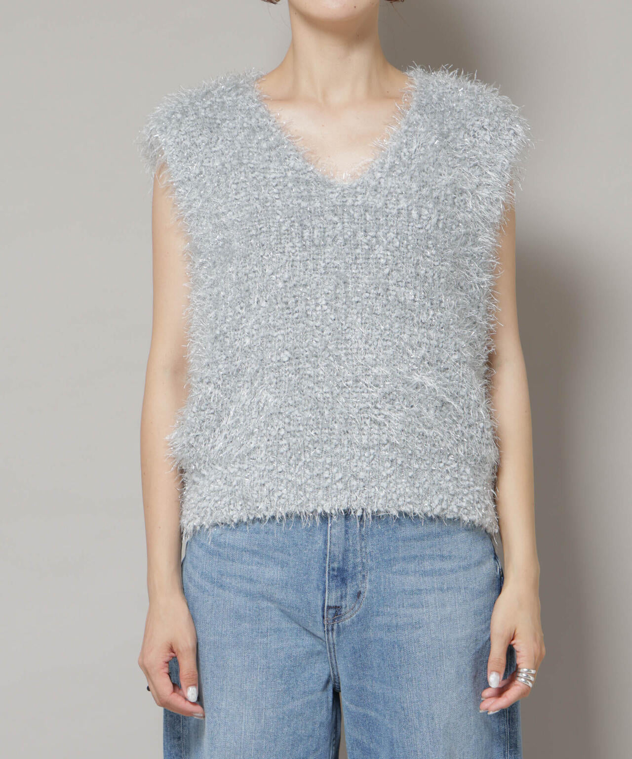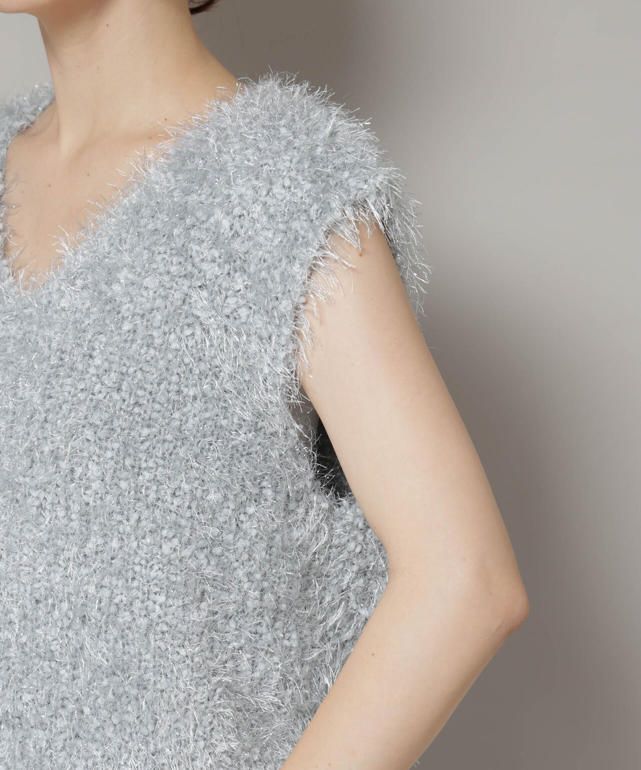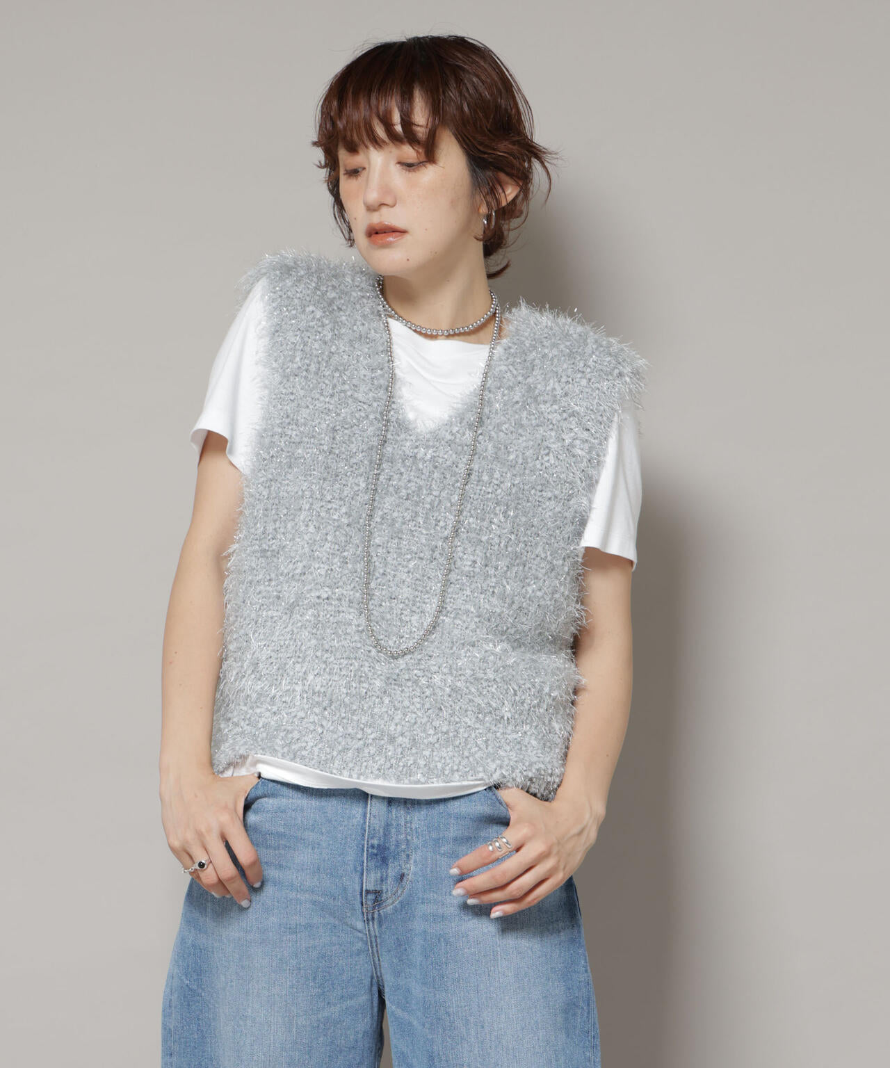 トレンドのシャギー糸で仕立てたニットベスト。キラッと光るフィルム糸と、大きな粒のようなネップがポコポコと入った糸を使用しているので、形はシンプルながらもキャッチーな印象に仕上がるアイテムです。
