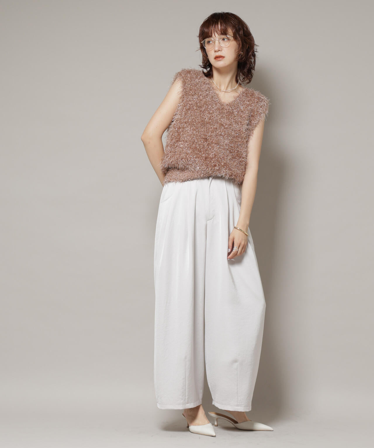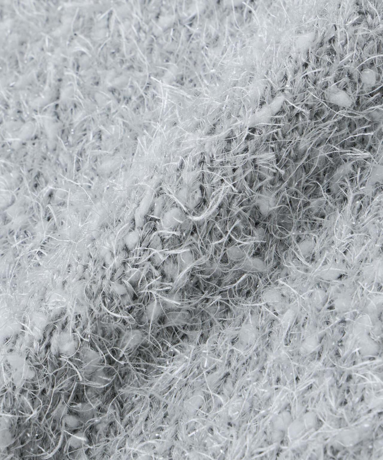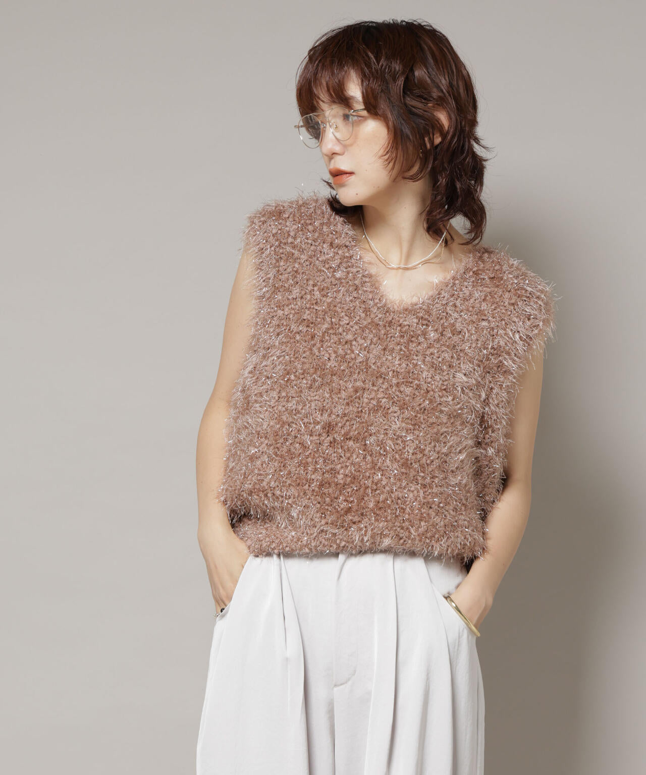 トレンドのシャギー糸で仕立てたニットベスト。キラッと光るフィルム糸と、大きな粒のようなネップがポコポコと入った糸を使用しているので、形はシンプルながらもキャッチーな印象に仕上がるアイテムです。
