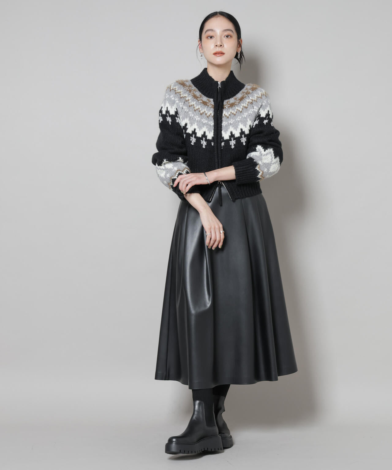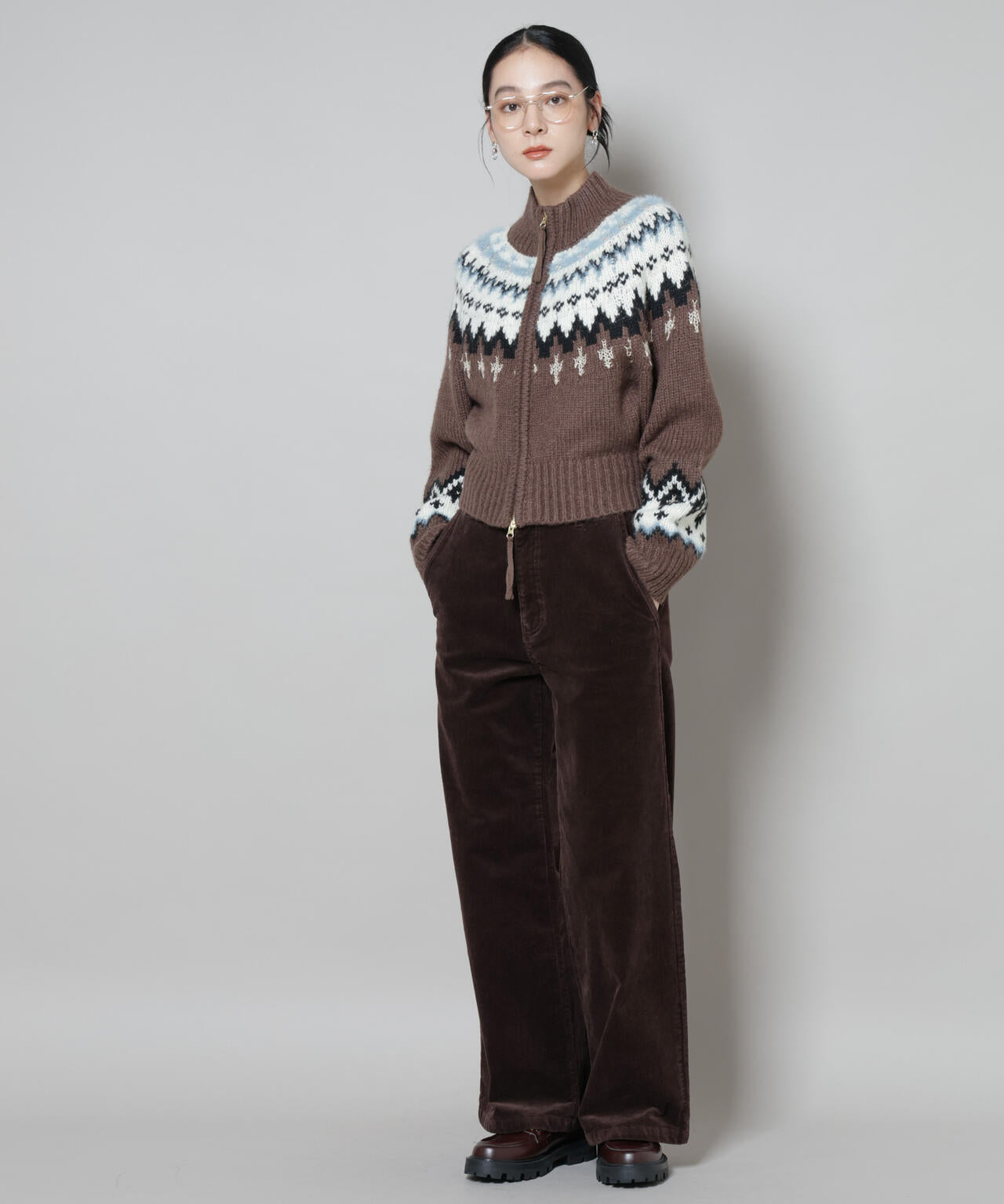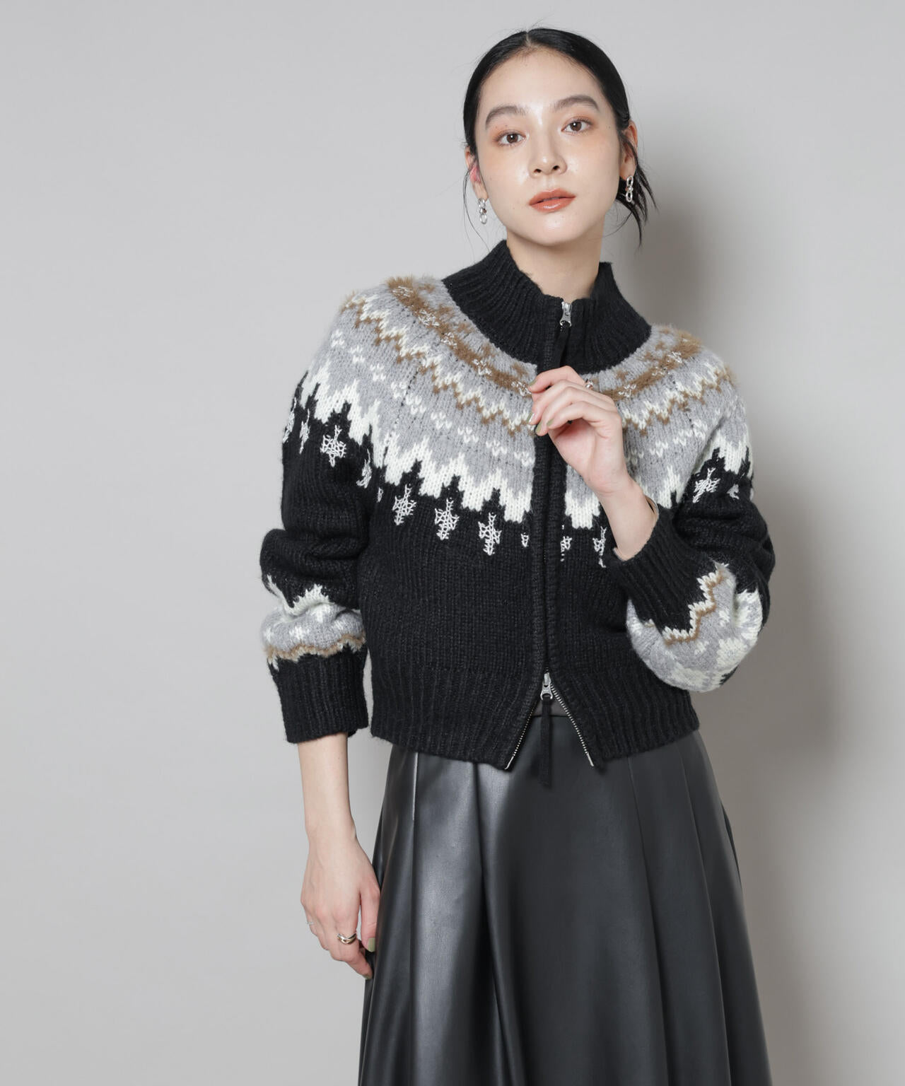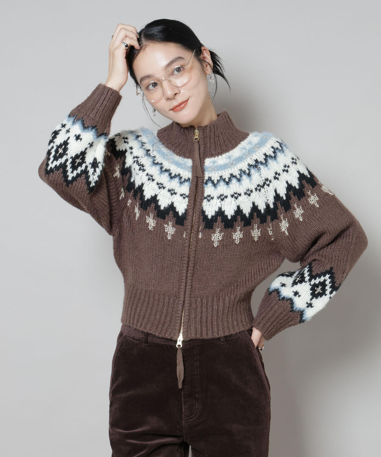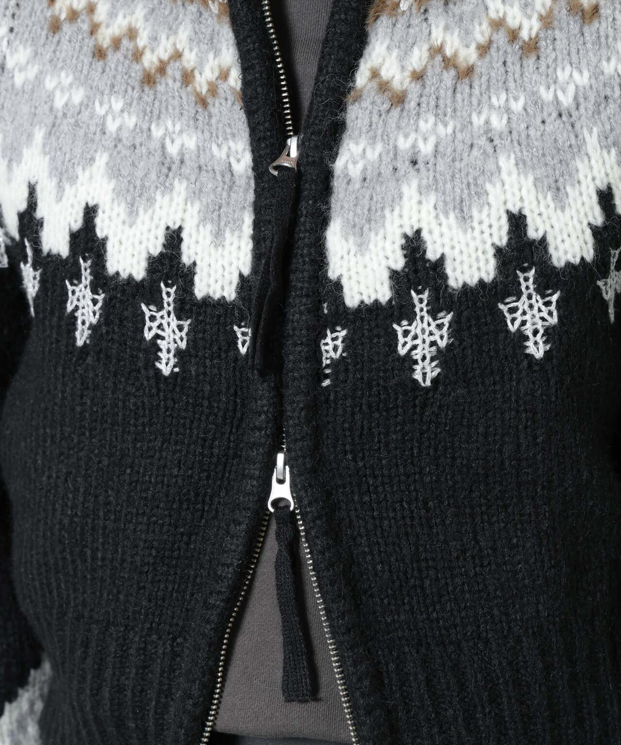 伝統的な求心柄を、モードなカラーリングと素材使いでアップデートしたzipカーディガン。ウール混で少し毛の吹いた暖かみのある糸に部分的にシャギー糸を使用し、立体感とウォーム感をプラス。トラッドな印象の求心柄をトレンド感あるデザインで仕立てた、秋冬スタイリングの主役級ニットアイテムです!