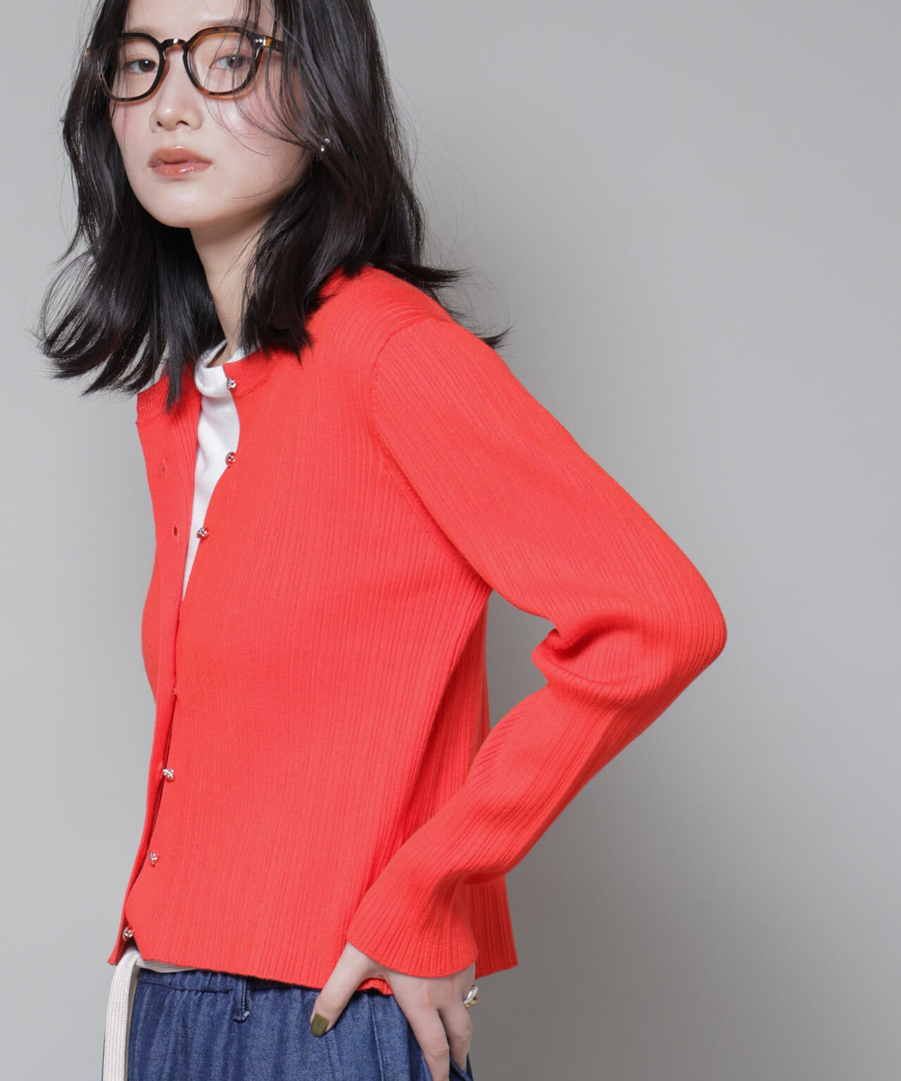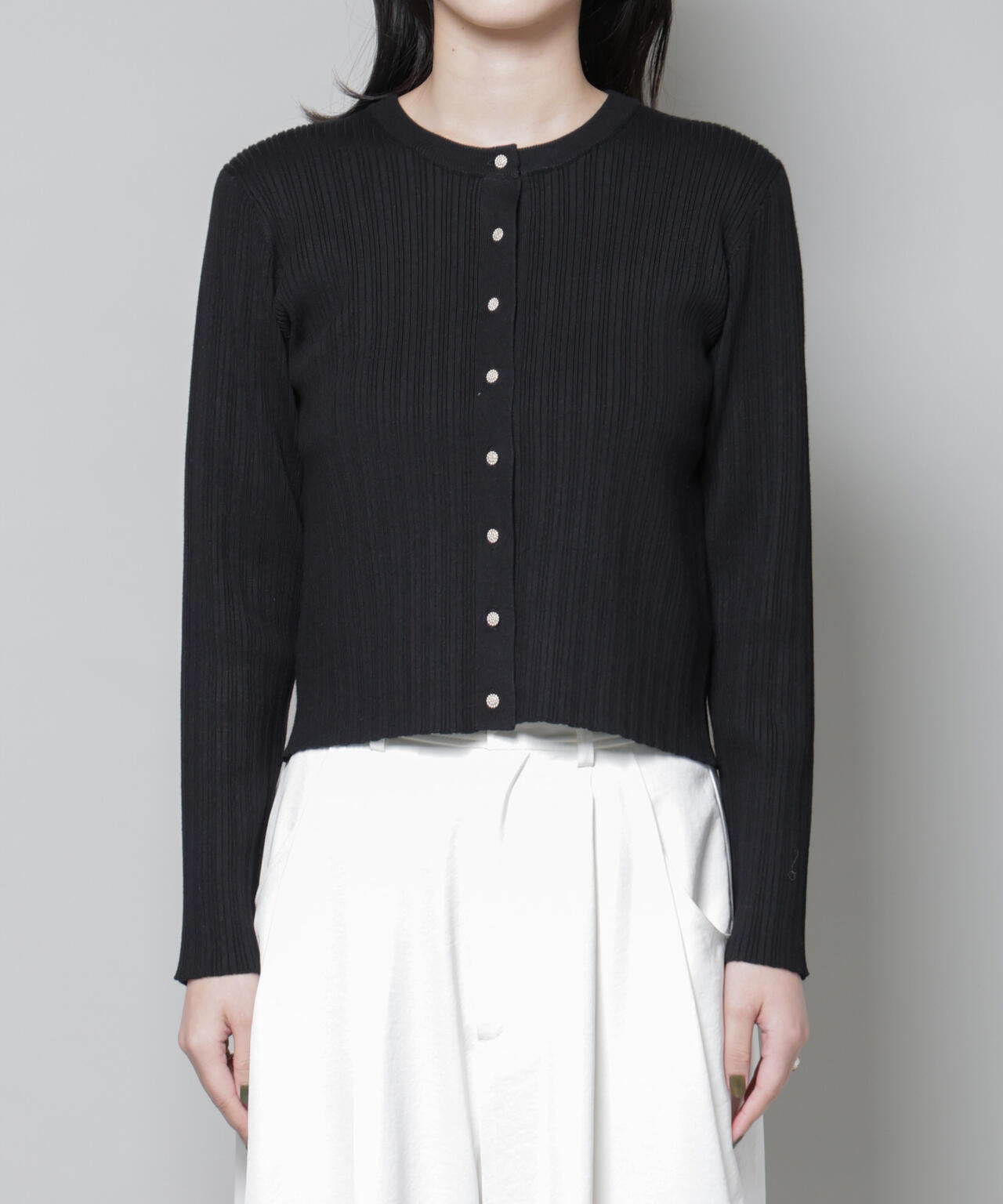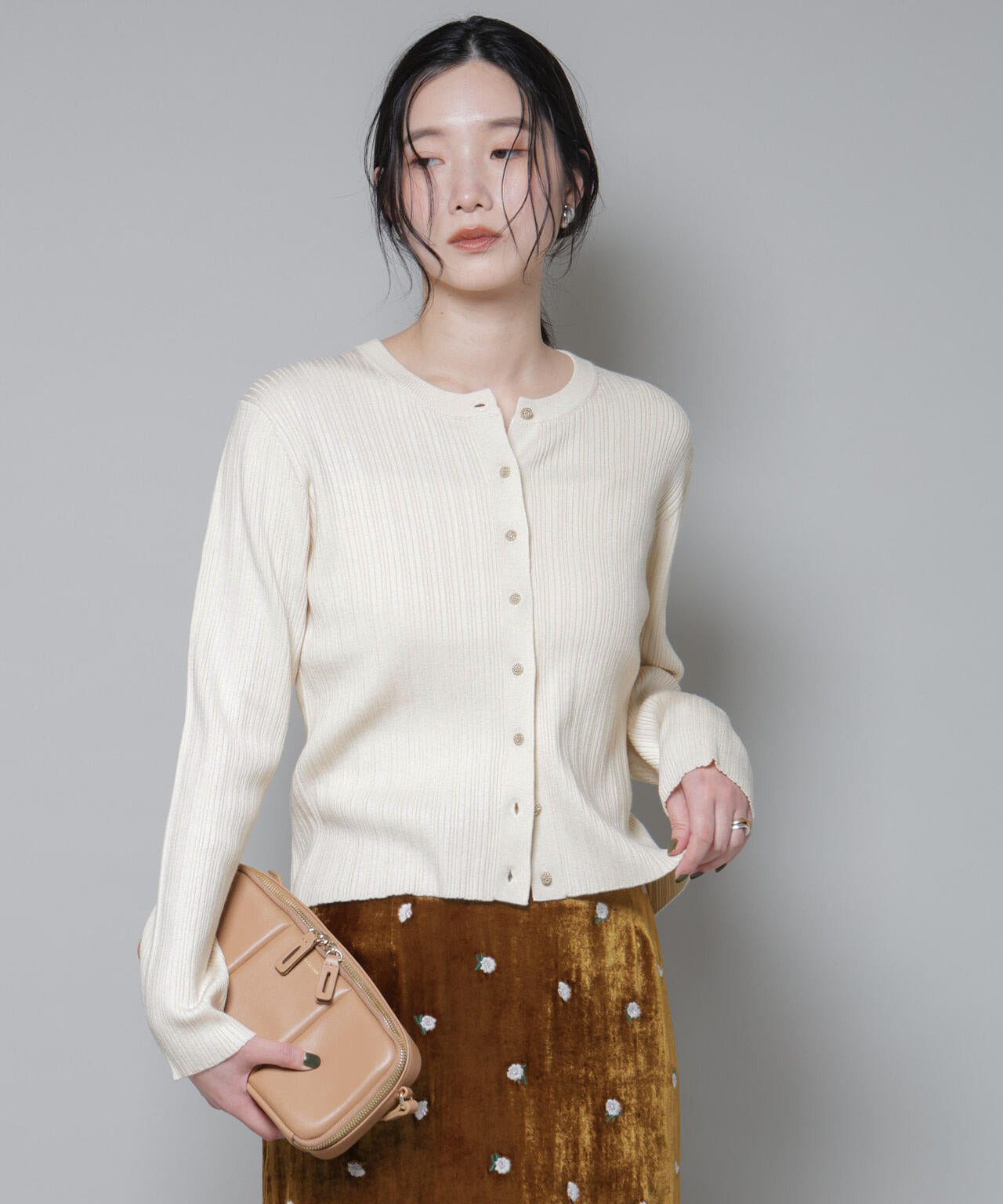 クルーネックの詰まった衿ぐりが上品な印象のリブカーディガン