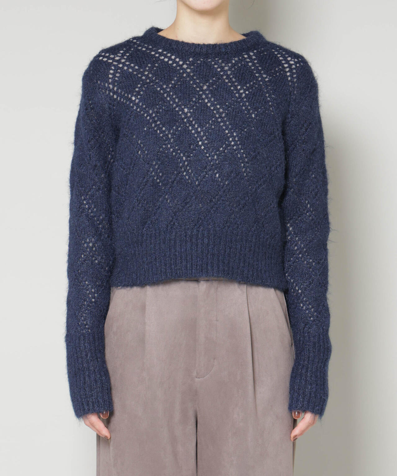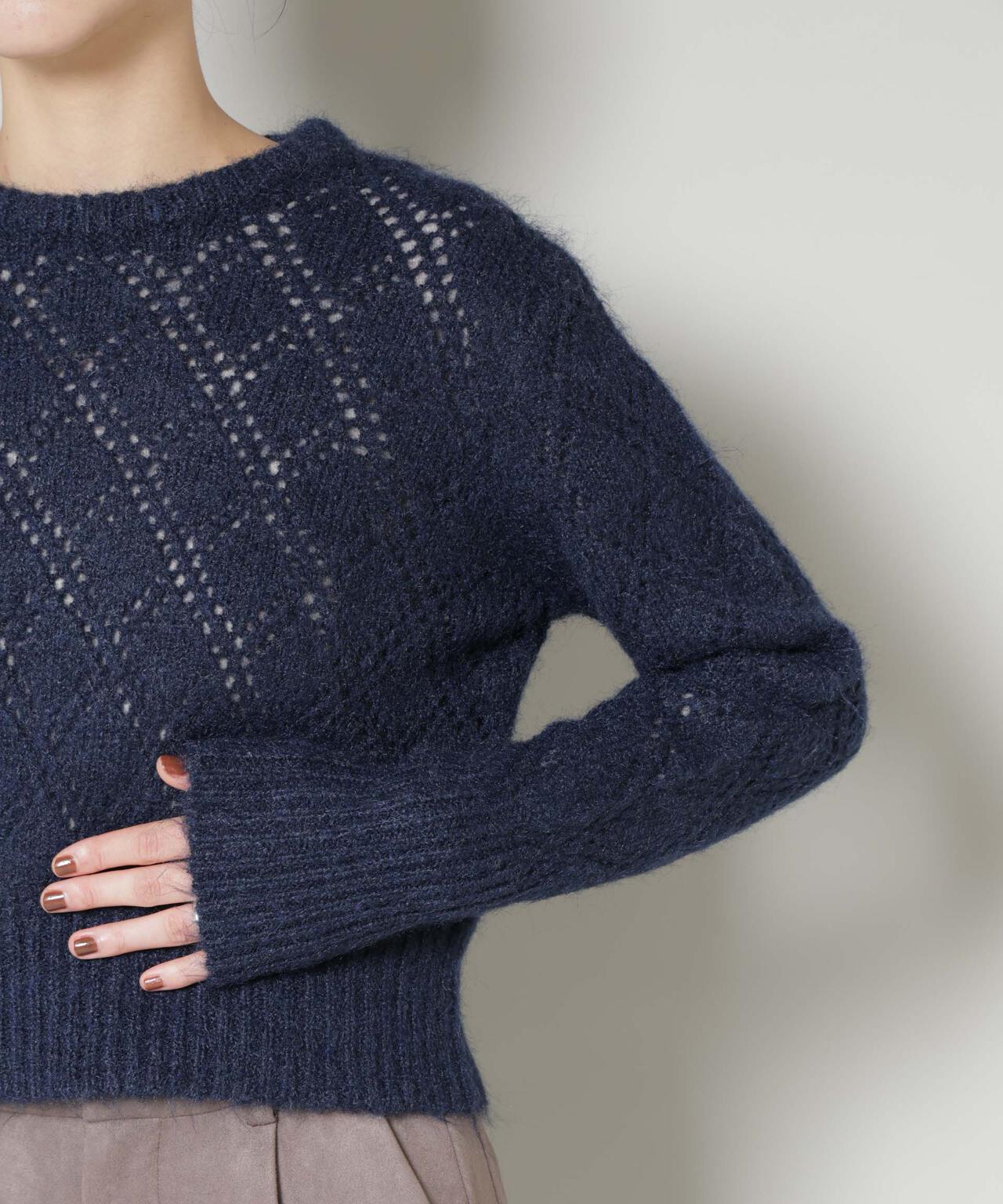 ふんわりヘアリーな質感のダイヤ柄透かしニットプルオーバー