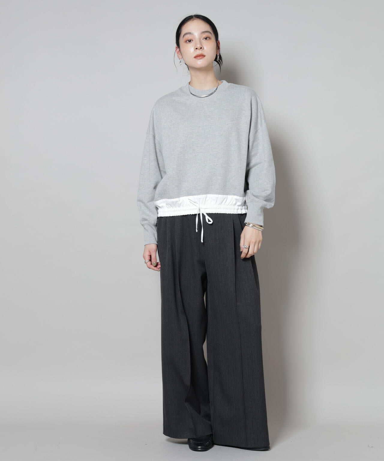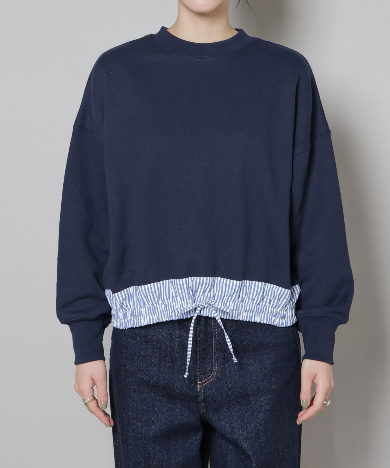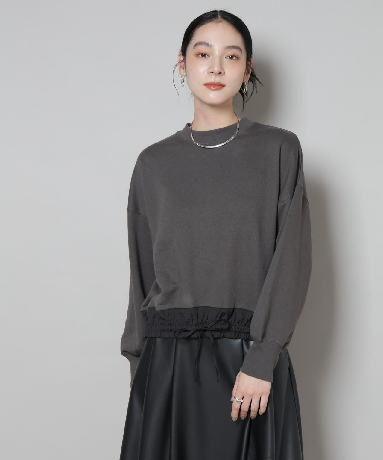 肌馴染の良いコットン混裏毛素材を使用した、デイリーに気負わず着られるプルオーバー。ゆったりとしたベーシックなクルーネックデザインながら、裾部分をブロード生地で切り替えた異素材ミックスがさりげないアクセントになる一枚です。