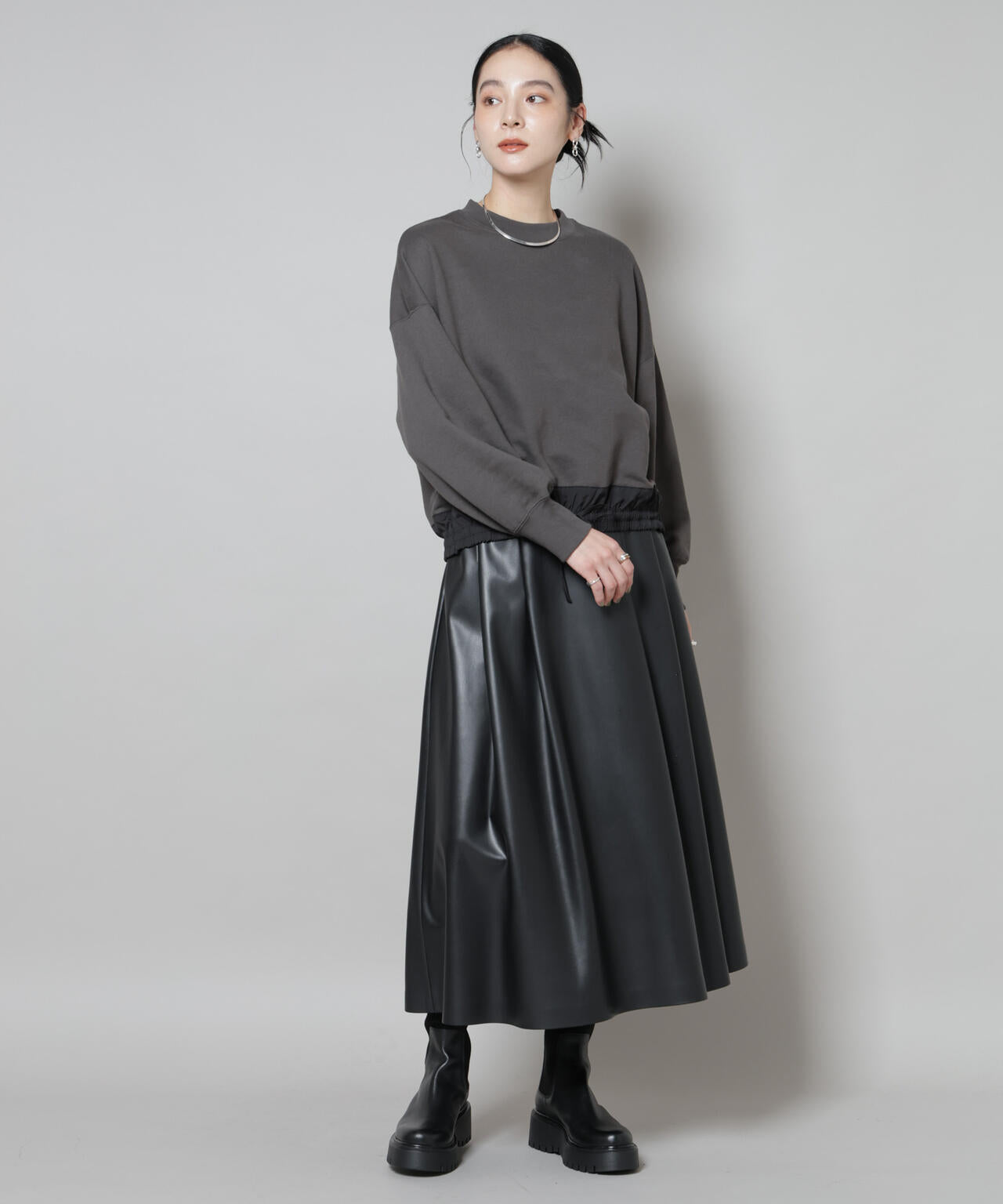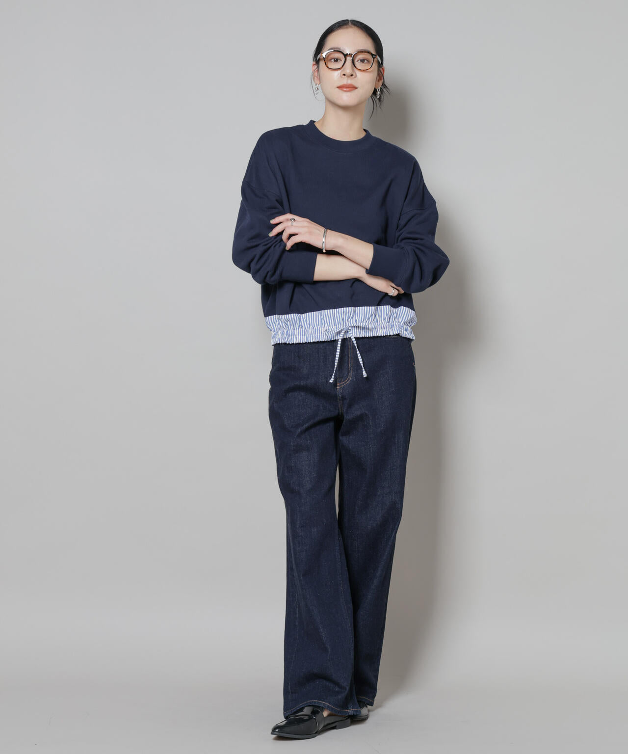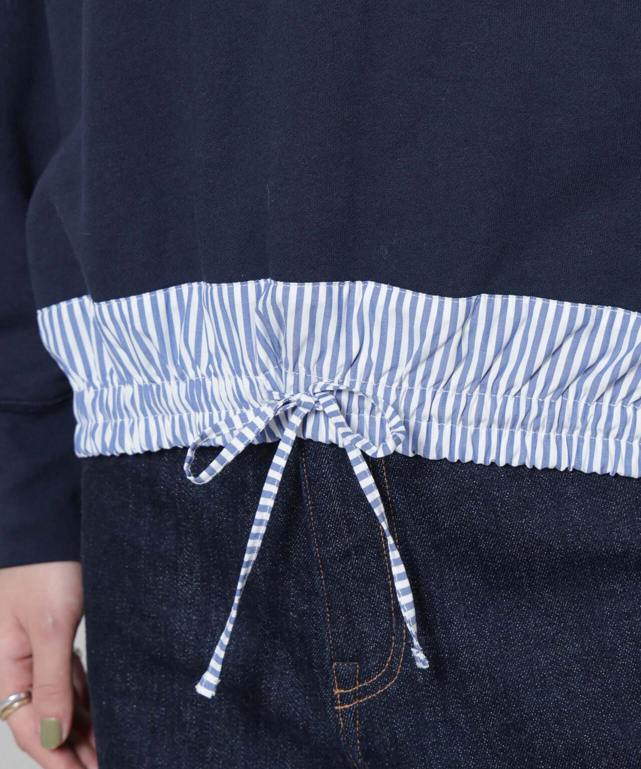 肌馴染の良いコットン混裏毛素材を使用した、デイリーに気負わず着られるプルオーバー。ゆったりとしたベーシックなクルーネックデザインながら、裾部分をブロード生地で切り替えた異素材ミックスがさりげないアクセントになる一枚です。